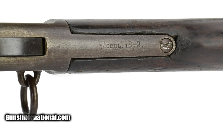 Winchester 1873 1st Model Saddle Ring Carbine. Made in 1875. .44-40 Caliber with a 20” barrel. Metal has a brown patina and shows normal use. Wood shows some use and has some repairs. Dust cover is missing. This gun should have a raised thumbprint dust cover. Very rare carbine to find this early.