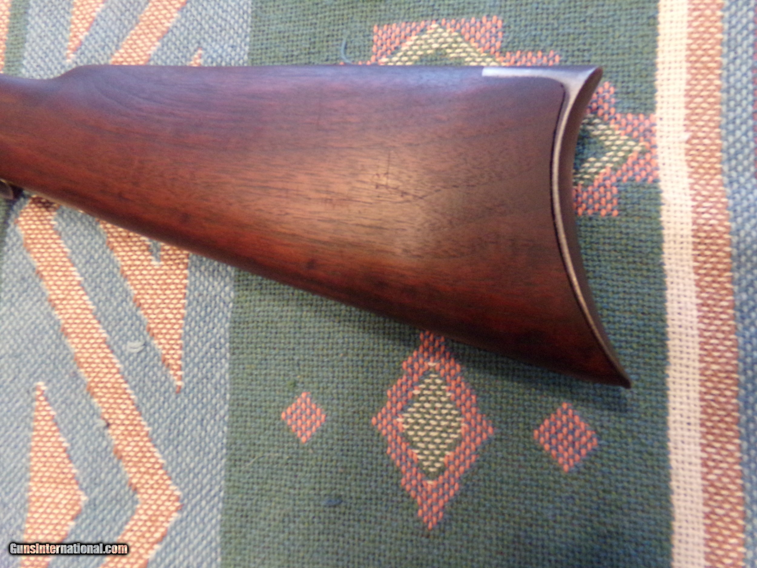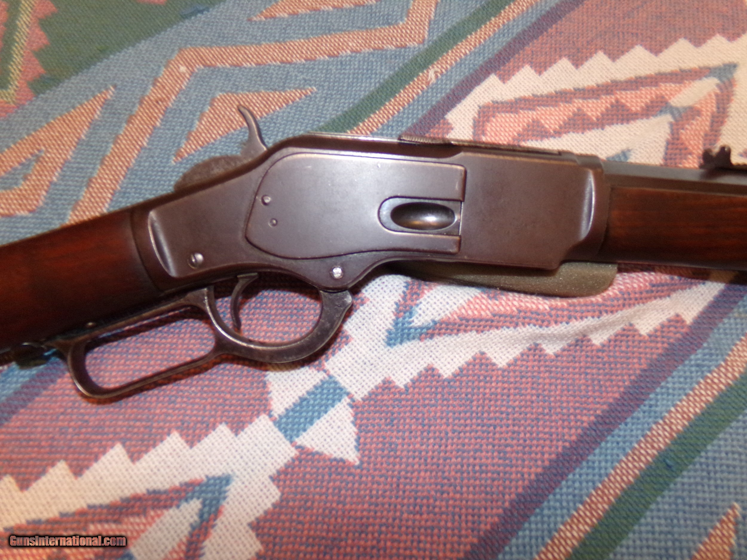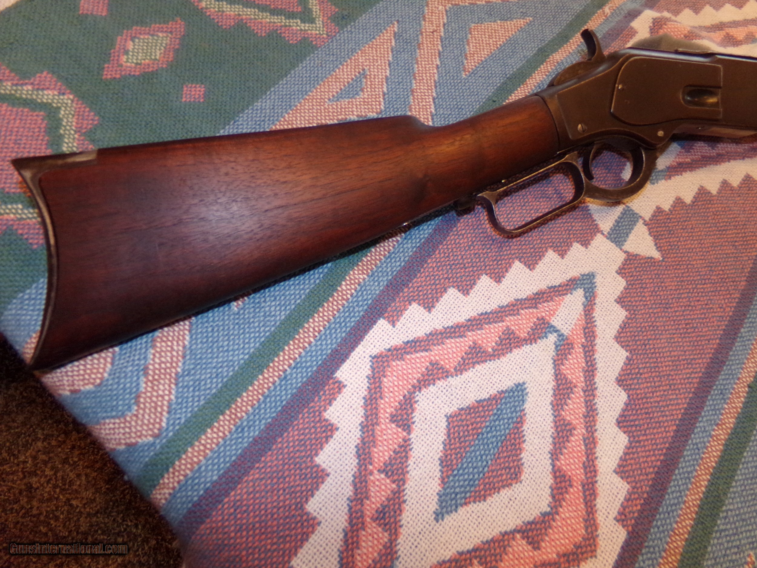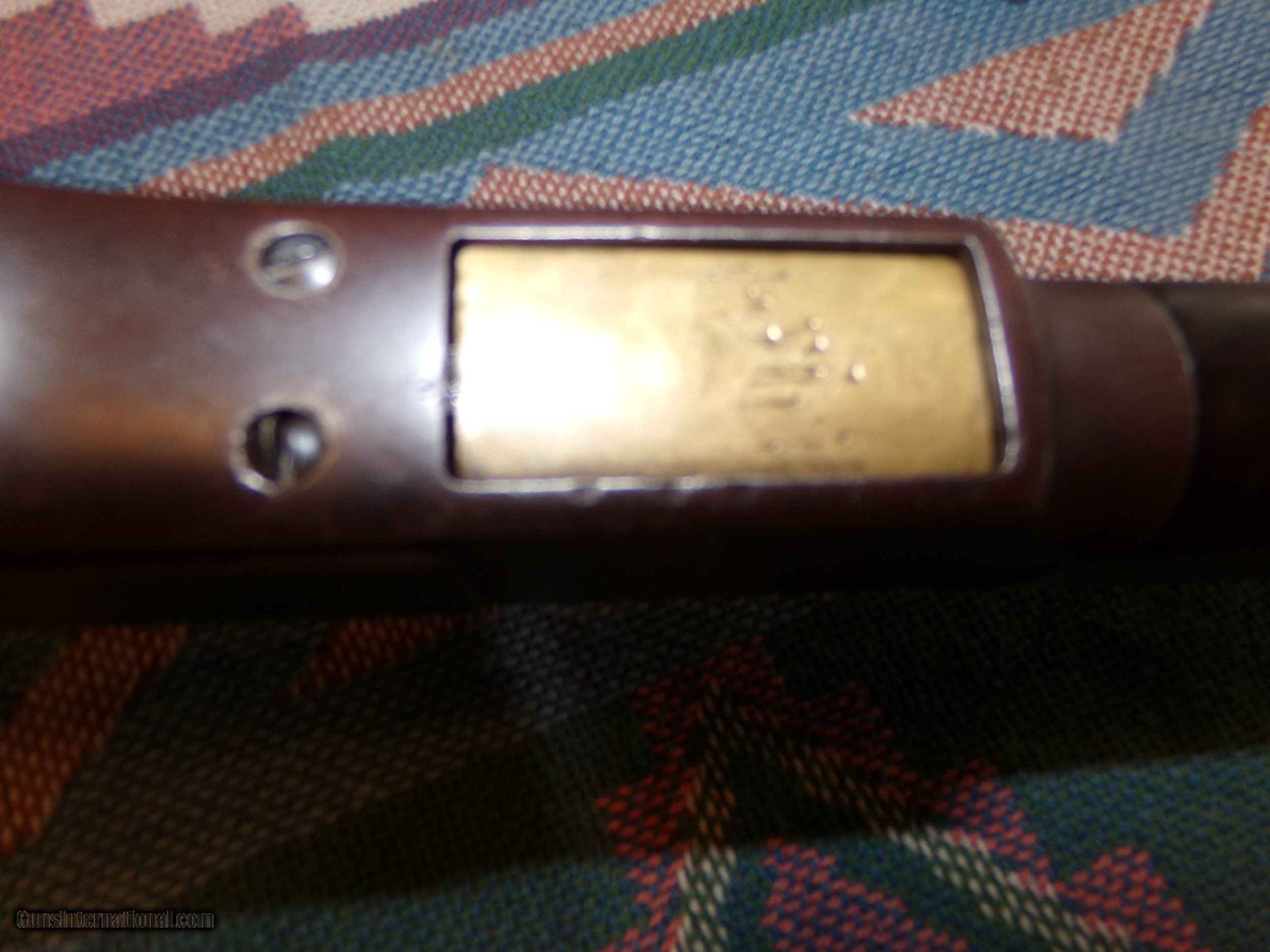 Description: Winchester 1873 Octagon barrel standard rifle. 24" barrel, full octagon, has fair rifling showing with some dull spots. Wood is good with no cracks or repairs and fits well to metal. Dark patina finish. All markings are good and very readable. Mfg 1890. antique. Shipping $65.00. SOLD Manufacturer: Winchester Model: 1873 Serial Number: 357788B Caliber Info: .32WCF Condition: G Metal Condition: G Wood Condition: G Bore Condition: F |