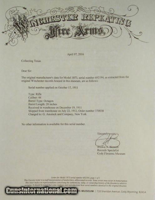 Description: Winchester Model 1873; SN692194; 44-40 cal; 20” octagon bbl.; shipped 2/27/1912 to G. Amsinck, New York; 100% correct; crusty brown patina; metal finish; crisp action; fairly strong bore with some pitting; has initials ‘BM’ and ranch brand ‘AF’ on stock; probably a Mexico ranch gun; FFL/C&R required for out of state shipping; from my own personal collection; All items shipped fully insured Priority Mail- -Hand guns $30 --Long guns $45-- Spurs $30-- Knives, Swords & Sabers $30—Grips $20; return policy: three days inspection from the date the item is received; full refund of shipping both ways ONLY IF THE ITEM IS MISREPRESENTED. SOLD Curio/Relic: Yes Manufacturer: Winchester Model: 1873 Serial Number: 692194 |
