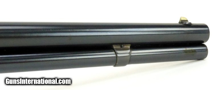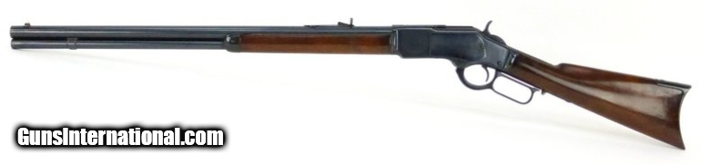 Winchester 1873 .44-40 caliber rifle. Manufactured 1883 with 24” barrel. Gun has been restored at some point. Bore has strong rifling with areas of pitting. Wood is very good, and there is a crack that has been expertly repaired on the right hand side of the forearm. Very good condition overall.