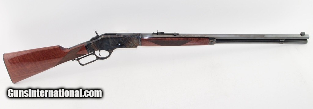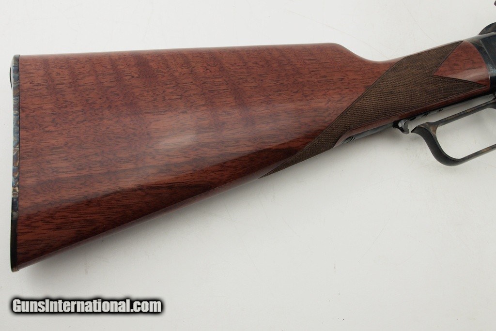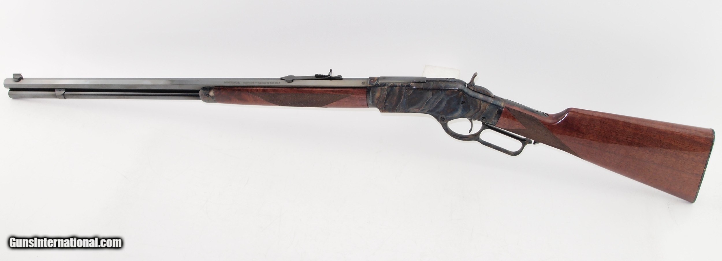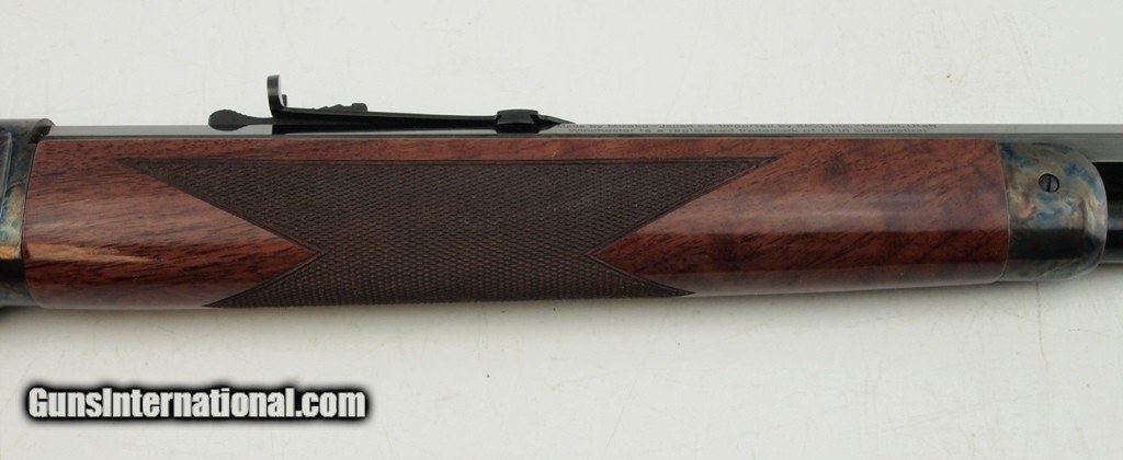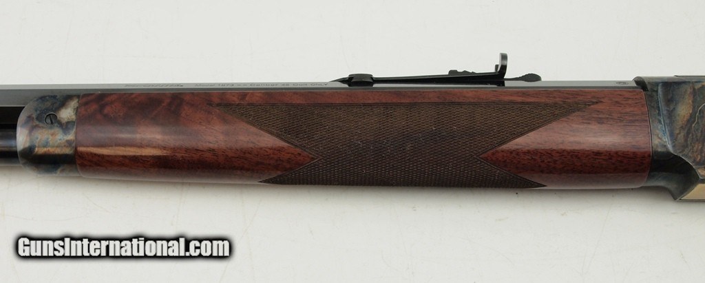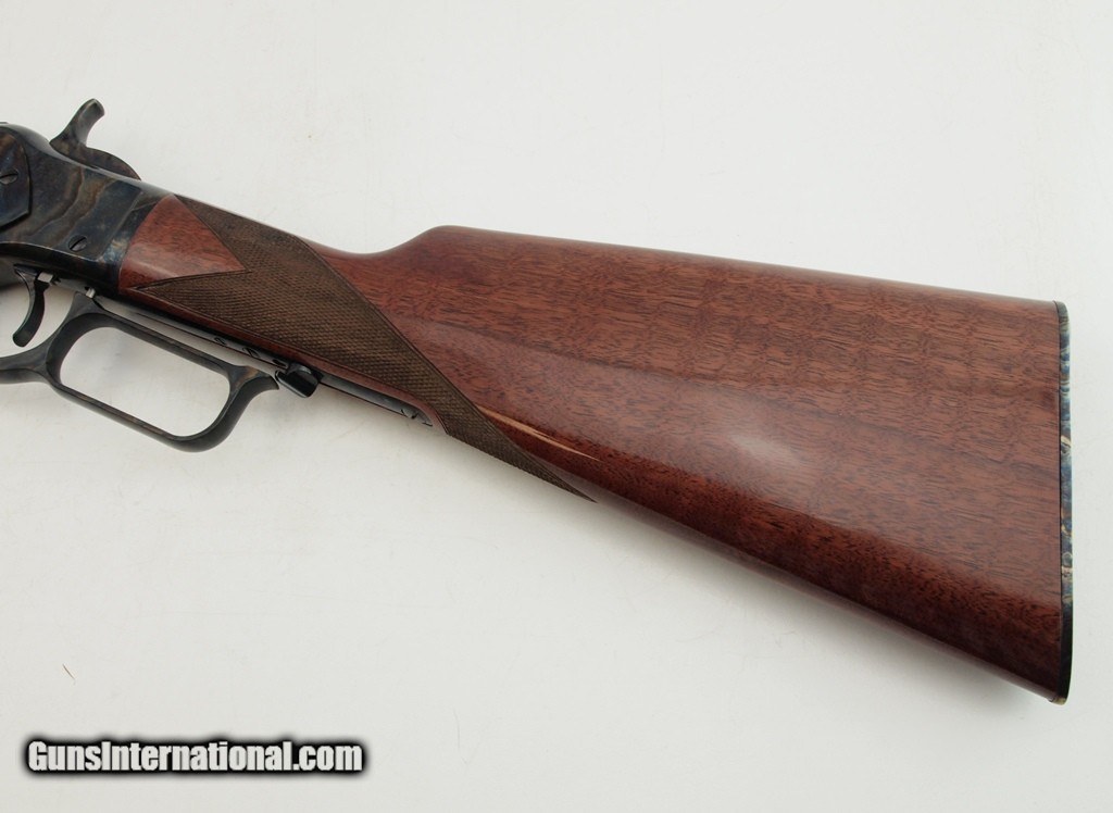 Description: Winchester 1873 .45 LC, 24" octagonal bbl, bright shiny bore, good rifling, blued finish, semi-buckhorn rear sight, Marble Arms gold bead front sight, color case hardened receiver - hammer - trigger - forearm cap - butt plate, beautiful Grade II/III Walnut straight grip stock, extremely light handling marks, and steel loading gate. This is a very clean rifle! Add 3% for Credit Card Shipping $35.00 SOLD |