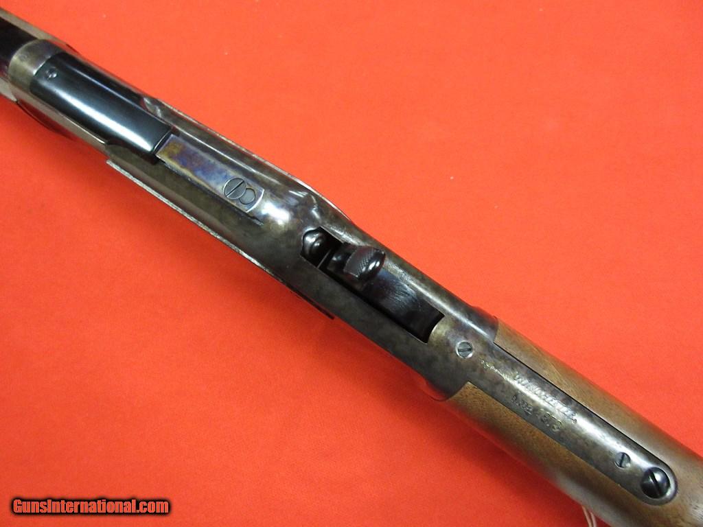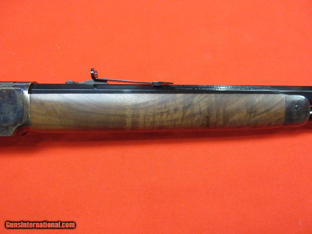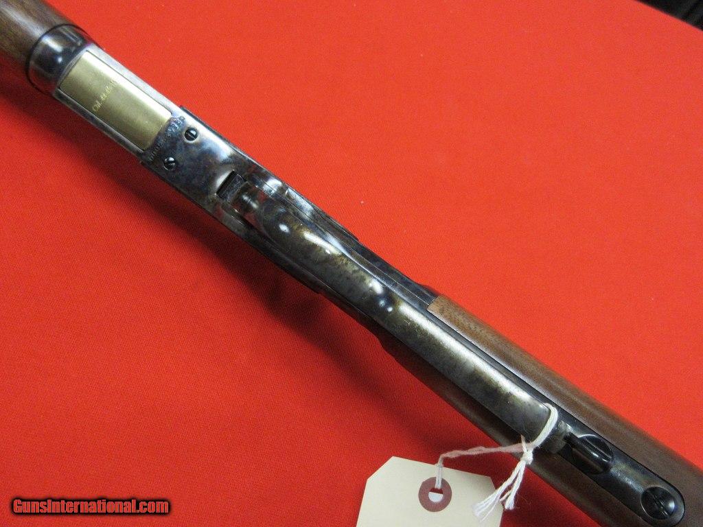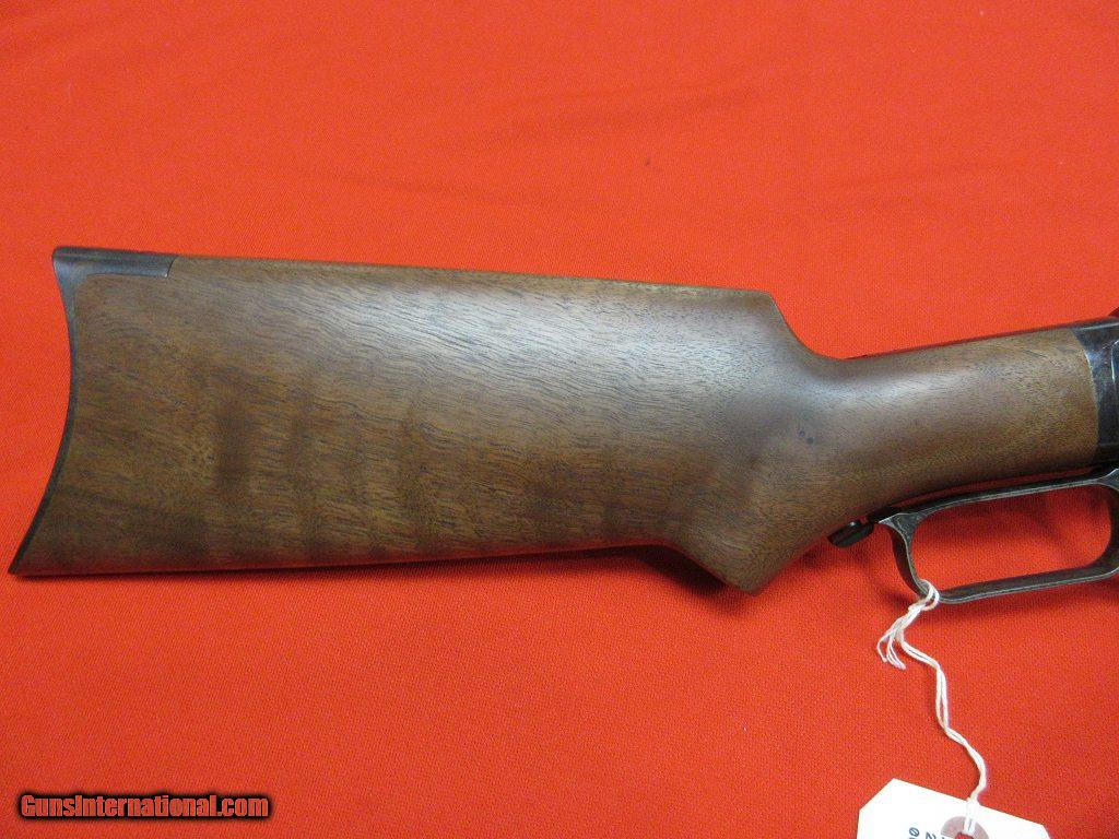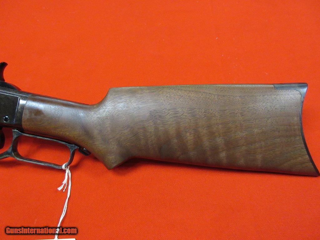 Description: Case colored receiver with highly figured stock and forend, octagonal barrel with a full-length magazine tube, gold bead front sight, buckhorn rear sight with elevator, case colored crescent steel buttplate. This is one sharp looking rifle. SOLD |