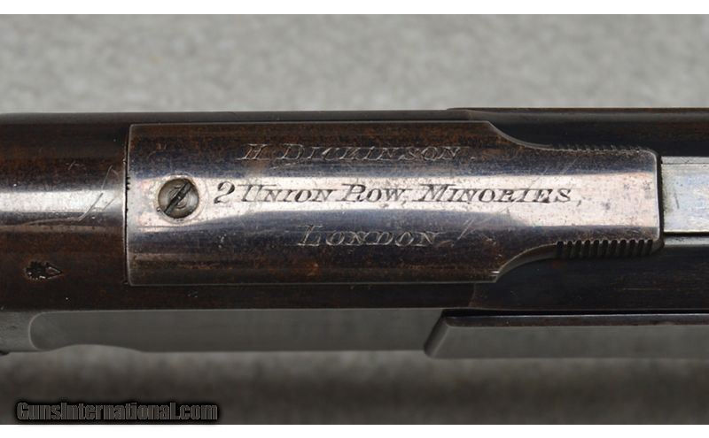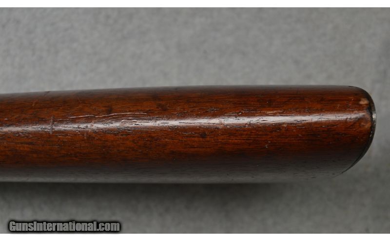 Description: Made in 1883, this Winchester 1873 is in it's original configuration with a 24" round barrel, plain trigger, and an altered shotgun stock that was added before shipping out of the warehouse. This rifle has a 3rd model receiver with integral dust cover rail and dust cover with serrations at the rear. The London retailer marking appears on the dust cover, "H. DICKINSON/2 UNION ROW MINORIES,/LONDON". London proof marks are stamped on the left side of the barrel and receiver near the breech. Two line Winchester address/King's patent mark and correctly lacks caliber marking. Fine finish, retaining 60% of the original bluing with a balance of smooth brown patina and a mottled gray patina on the buttplate. Minor pitting that is mostly on the buttplate, and 30% of Nitre Blue remains on the loading gate & 40% case colors remain on the hammer and lever. Wood has minor handling marks and a couple hairline stress cracks at the fore-end cap. Mechanically Excellent. SN: 119762A .44-40 Winchester SOLD Antique: Yes Metal Condition: Great Wood Condition: Great Bore Condition: "Clean, Good Rifling Barrels: 24 Butt Pad: Metal Plate Weight: 8 lb 11 oz Item Location: Fort Worth, TX |