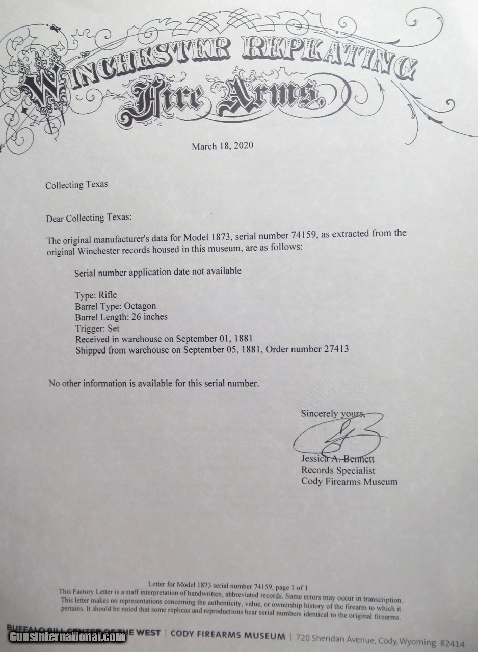 Description: Winchester Model 1873; Serial No. 74159; 44-40 Cal.; Extra Long 26” Barrel; Set Trigger; Shipped 1881; Cody Firearms Letter; Most of the Original Bright Blue Remains; Nice Sold Wood with Original Finish; Original 4-Piece Cleaning Rod in Butt Trap; PERFECT ACTION & BORE; See All Photos for Condition; Scarce 139 Year-Old 73 in Great Original Condition; PERSONAL PROPERTY of Harold Wieser; Price: $6,975 + $60 S&H; Price includes insured shipping; return policy: three days inspection from the date the item is received; full refund of shipping both ways ONLY IF THE ITEM IS MISREPRESENTED. SOLD Antique: Yes Manufacturer: Winchester Model: 1873 Serial Number: 74159 |