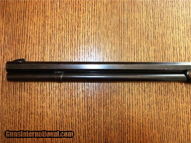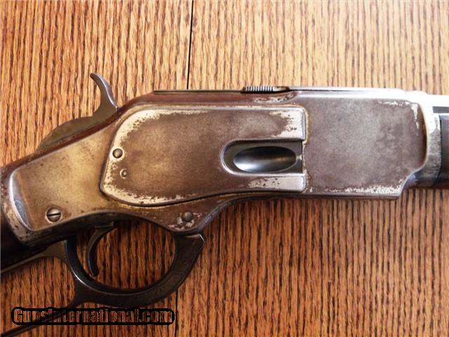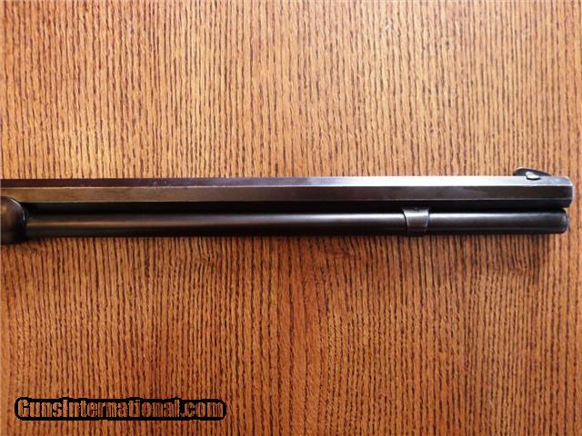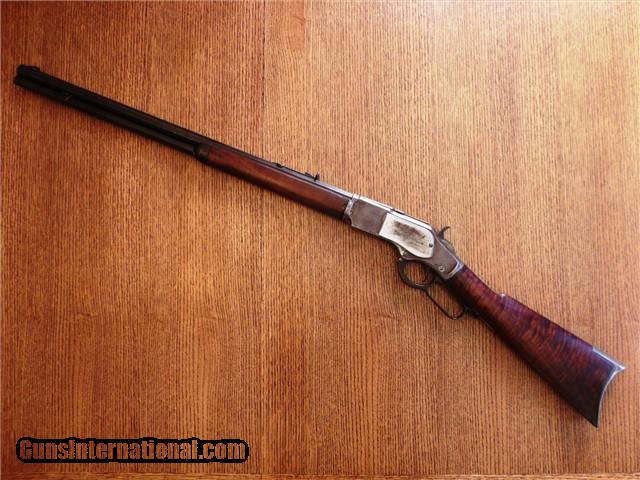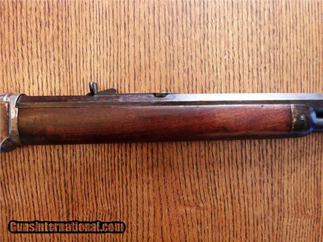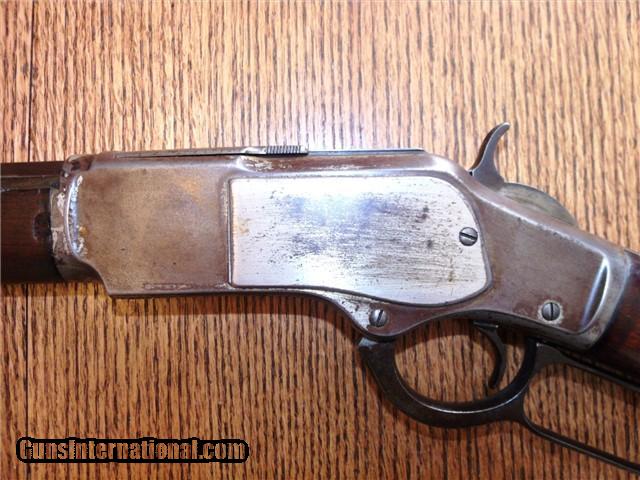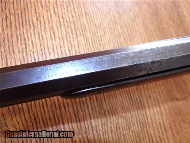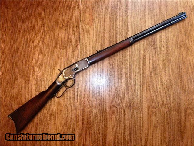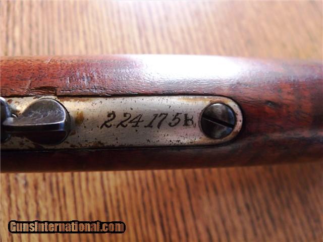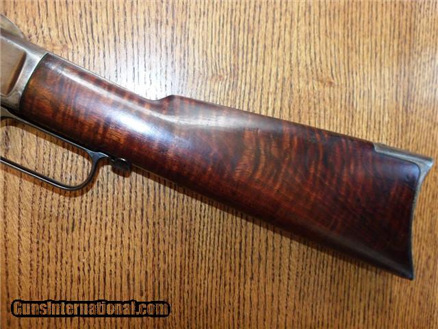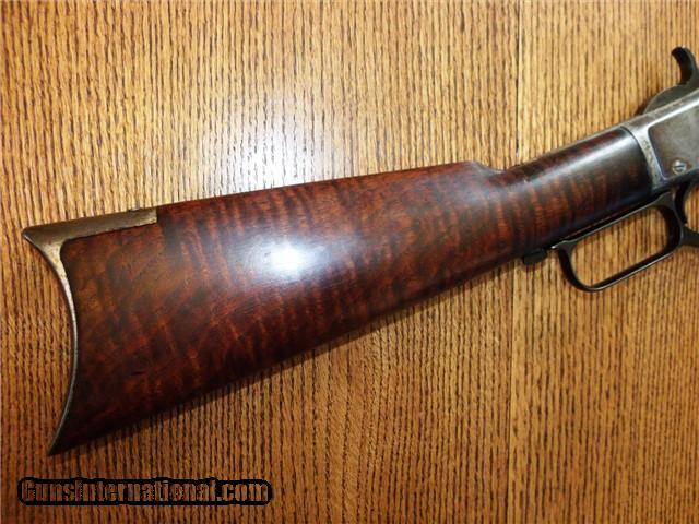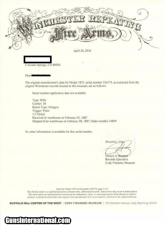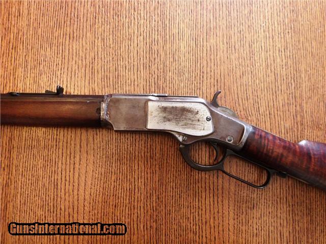 Description: The Item: 1887 Winchester Model 1873 Special Order Half-Nickel Rifle in .38-40 Accessories: Cody Firearms Museum COA Letter Condition: NRA: Very Good Blue Book: 75%+ Additional Information: This fine antique Winchester Model 1873 came in from a local Colorado estate. A letter from the Cody Firearms Museum was attained and so the rifle looks to be in original condition as delivered from Winchester. Produced and delivered in 1887, it is a special order rifle with half-nickel finish on the receiver and buttpad. It features an octagon 24" barrel, tiger-striped walnut stocks, lever safety, serrated top cover, original buckhorn rear sight, original leaf front sight, and crescent buttpad. The buttstock seems to be an especially nice piece of tiger-striped walnut and so may have been a deluxe grade of wood. No visible cracks noted, and the finish seems to be original. Forearm is in great shape too with only one good nick on the LH side. The receiver retains about 30% of its original nickel finish, and the crescent buttpad retains about the same. Blued parts have darkened to a nice brown patina with no active rust and just a little surface pitting here -and-there in the length of the barrel. Barrel is original 24" length (not cut) and the bore is still fairly shiny. Rifling has smoothed out near the muzzle, so it has been shot a bit. Action is still fairly tight for its age and cycles like a dream. Lever lock works well and hammer springs are still tight. The special order Winchester rifles of this era are extremely rare and difficult to find in this condition. The .38-40 caliber and nickel finish set this particular rifle apart from the rest and would make an excellent addition to your Winchester collection. ://gun-data/winchester_73.htm SOLD Antique: Yes Manufacturer: Winchester Model: 1873 Serial Number: 224175 Caliber Info: .38-40 |