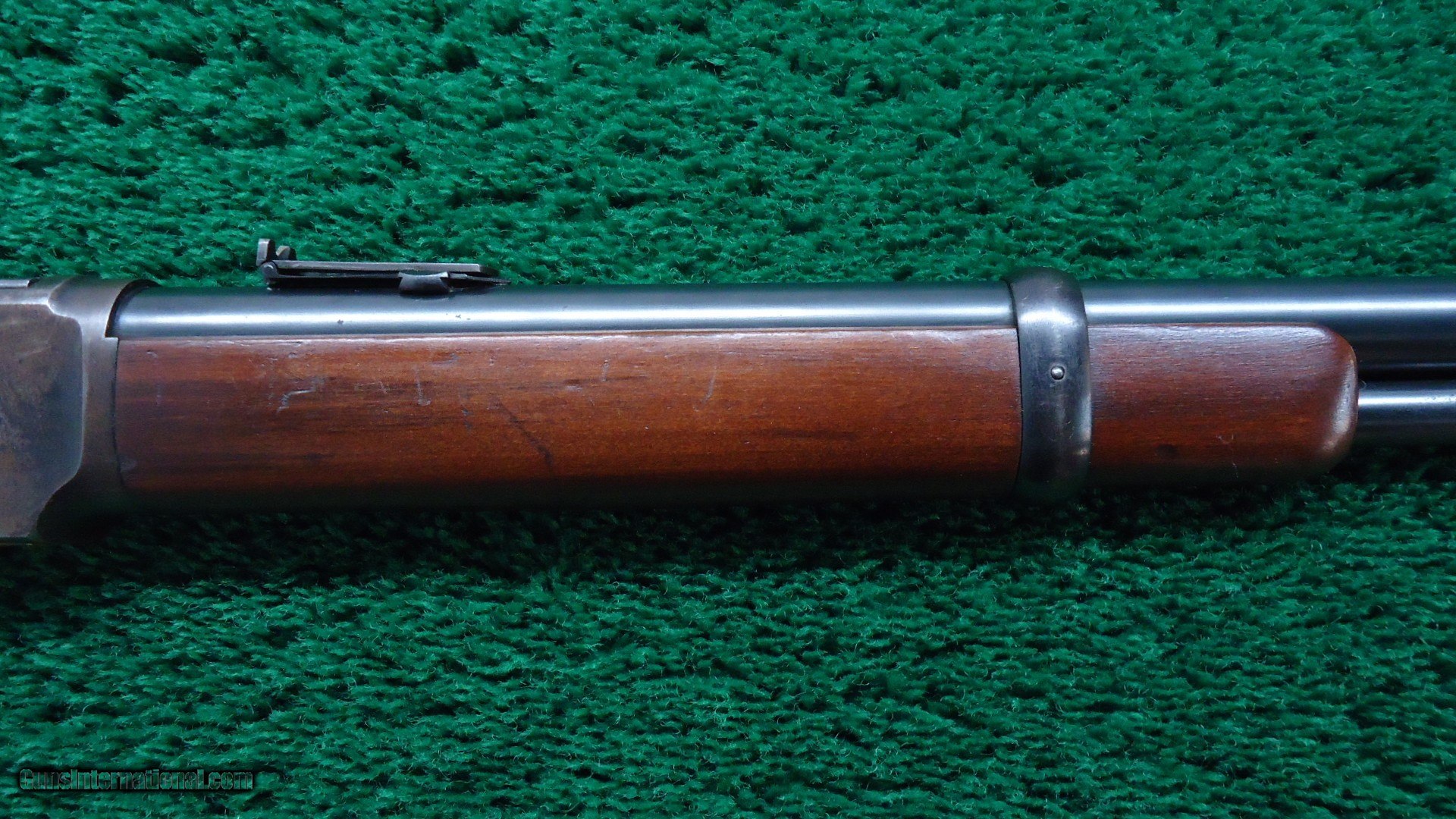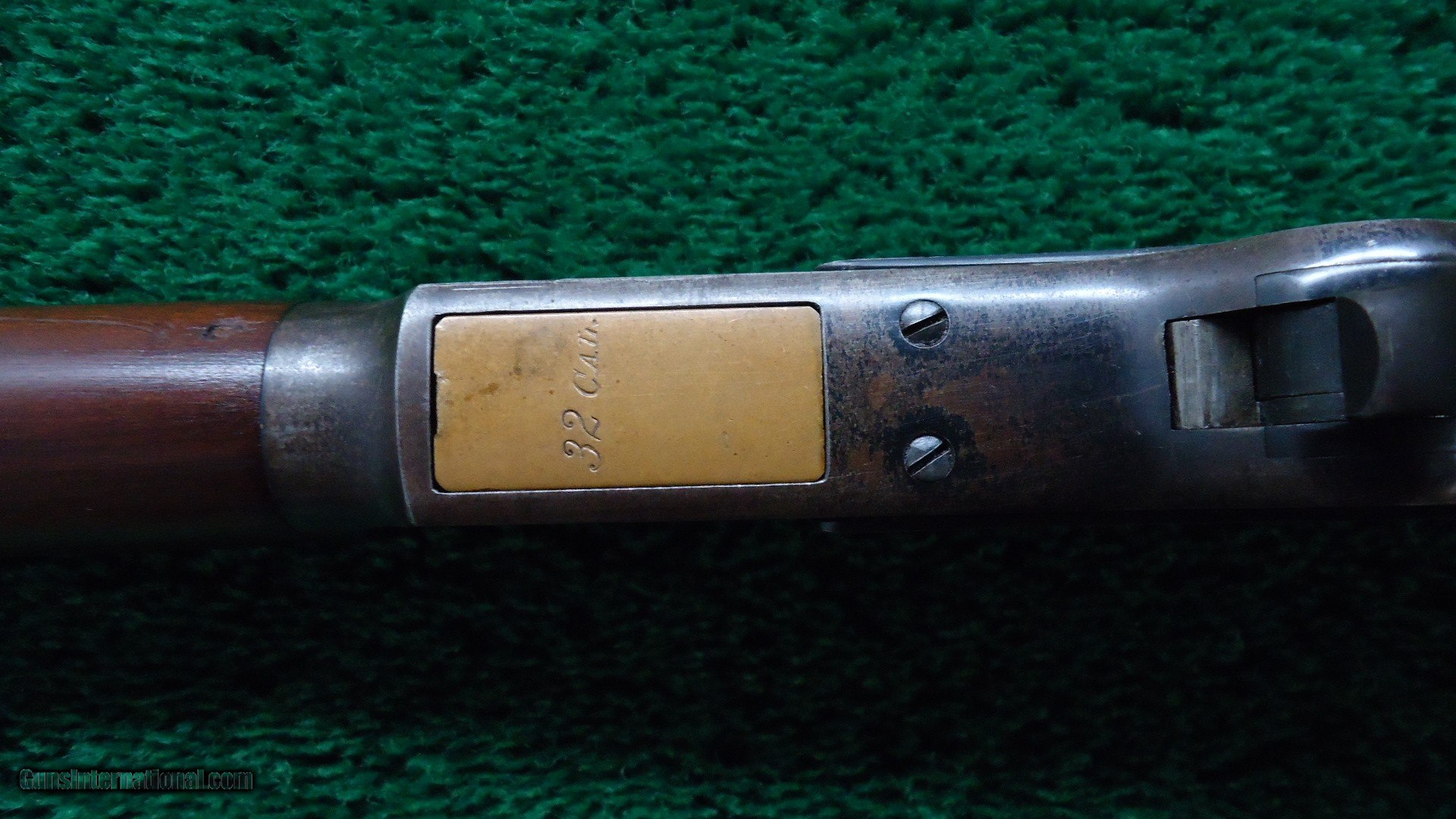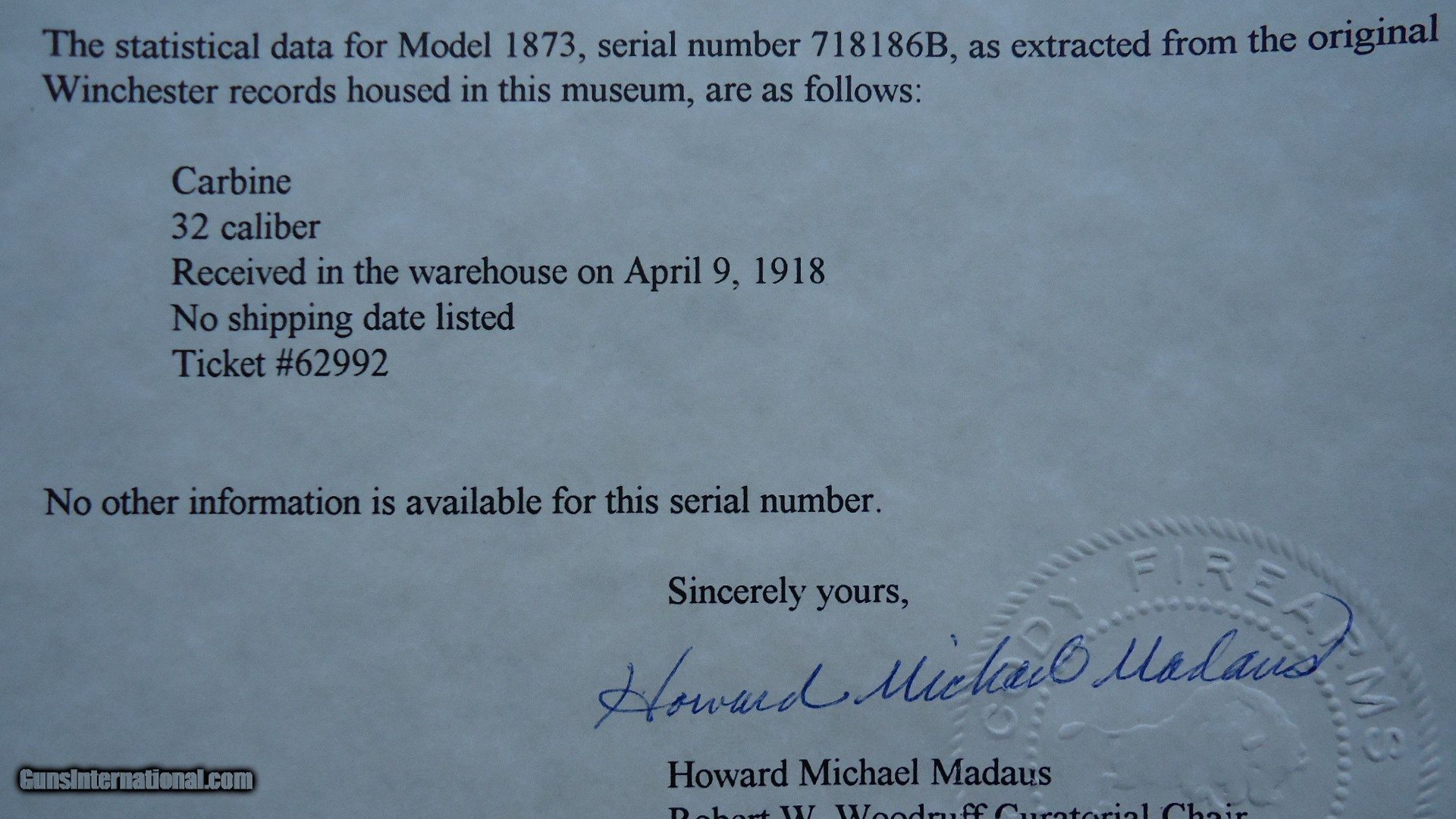 Description: Caliber 32 WCF. 20 inch round barrel, full length mag tube and carbine butt. Sights include blade front sight and folding ladder rear sight. Barrel and mag tube retain most blue that is starting to thin. Receiver has flaked and retains about half of the blue finish with some brown color in the flaked areas. Wood is quite good condition with just minor handling mars. VG+ bore and crisp action. Complete with Factory Letter. Leroy Merz Antique Firearms specializes in antique and vintage Winchesters and other fine American firearms. Since 1965 Mr. Merz has taken part in the world of firearms and has been a contributor to many well known reference books. We have hundreds of additional guns in every price range at our home online. Search for Merz Antiques in google. SOLD Antique: Yes |