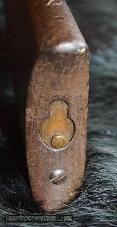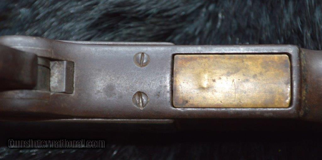 Description: This Winchester rifle is an example of the gun that won the West, the Winchester model 1873. It has solid walnut stock and forend with no visible cracks. The 28 inch barrel, 4 inches longer than standard, makes up a small percentage of Model 1873s produced. The rifle is chambered in 38 WCF (38-40) , which is an uncommon centerfire cartridge available in this model. Made in 1887, SN 233357, it is in so, so condition for being 137 years old. The gun did not have wonderful care, as there are handling marks in the wood, although the stampings are mostly clear and legible. The blue of the barrel has drifted to a brown patina, the magazine tube retaining a little more blue. The receiver and lever have hardly any amount of case color left, not too much on the hammer, butt plate, and forend cap. The action is missing some parts, but those should be easily located and replaced by any good Winchester man. The gun will half cock, full cock and dry fire. The bore of the long barrel is not very good, quite dull with soft riflings. The rear sight is the early type, with knurled sides to diffuse glare. There is no dust cover. The butt plate does have the cleaning rod window. I was going to begin a full restoration of this gun, but I have decided I have too many projects to pursue that. If you have been looking for the right '73 to collect, for investment, or for that nostalgic hunt, but want add a less than deluxe model to restore, then look no further. SOLD |