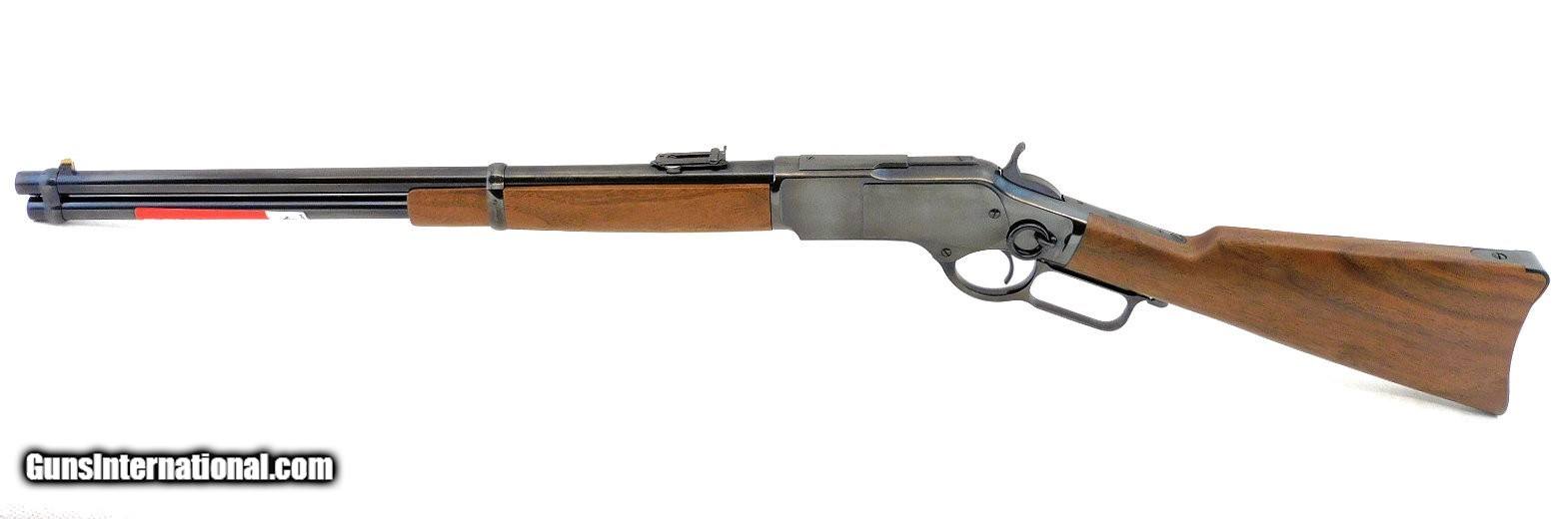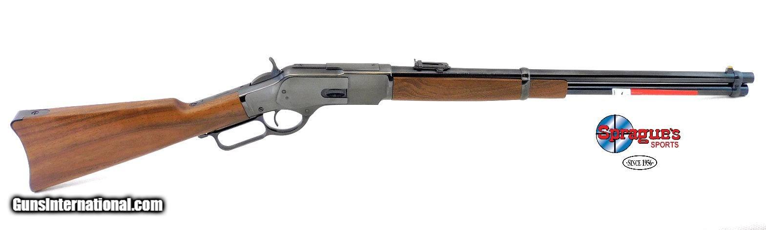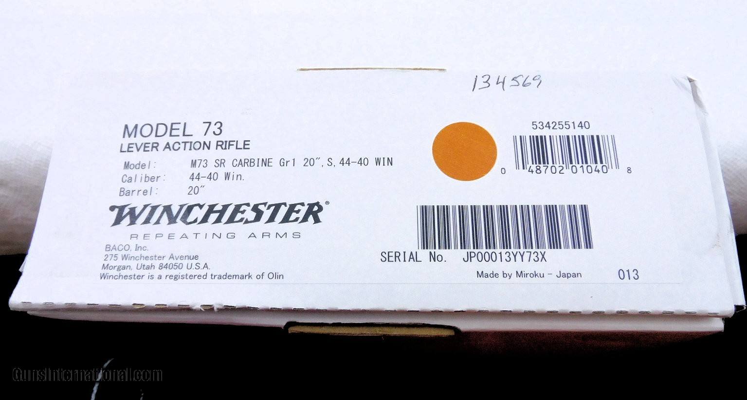 Description: STRIKING Winchester 73 Carbine SR rifle. This rifle is Like-New-In-Box and features a 20" round barrel, ladder style rear sight, brass blade front sight, brushed polished blued finish, near perfect Grade I black walnut smooth straight wrist butt stock - forearm, LOP - 12 7/8", brushed polished blued receiver, original box, and documentation. Don't miss your chance to add this INCREDIBLE rifle to your collection! Add 3% for Credit Card Shipping $55.00 in the 48 contiguous United States Manufacturer: Winchester Model: 73 SR Carbine Caliber: .44-40 Win Magazine: Tube style, 10 round capacity Barrel: 20", Round, brushed polished blued Rear Sight: Ladder style Front Sight: Brass blade Finish: Brushed polished blued Action: Lever Receiver: Brushed polished blued with saddle ring Stock: Rich satin oil finish Grade I black walnut Length Of Pull: 12 7/8" Forend Cap: Barrel ring Recoil Pad: Crescent metal butt plate Weight: 7 lbs 4 oz SOLD |