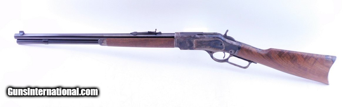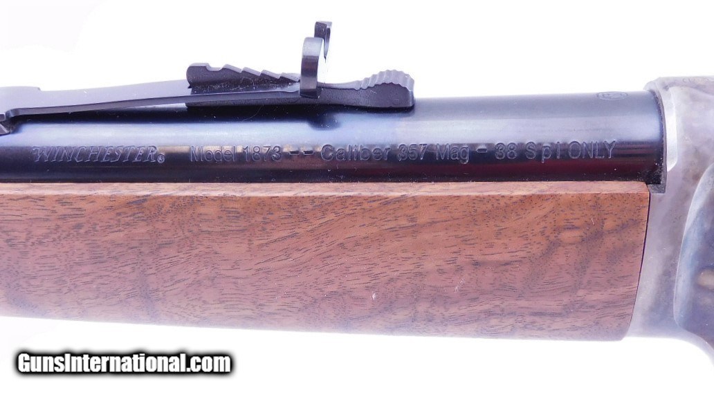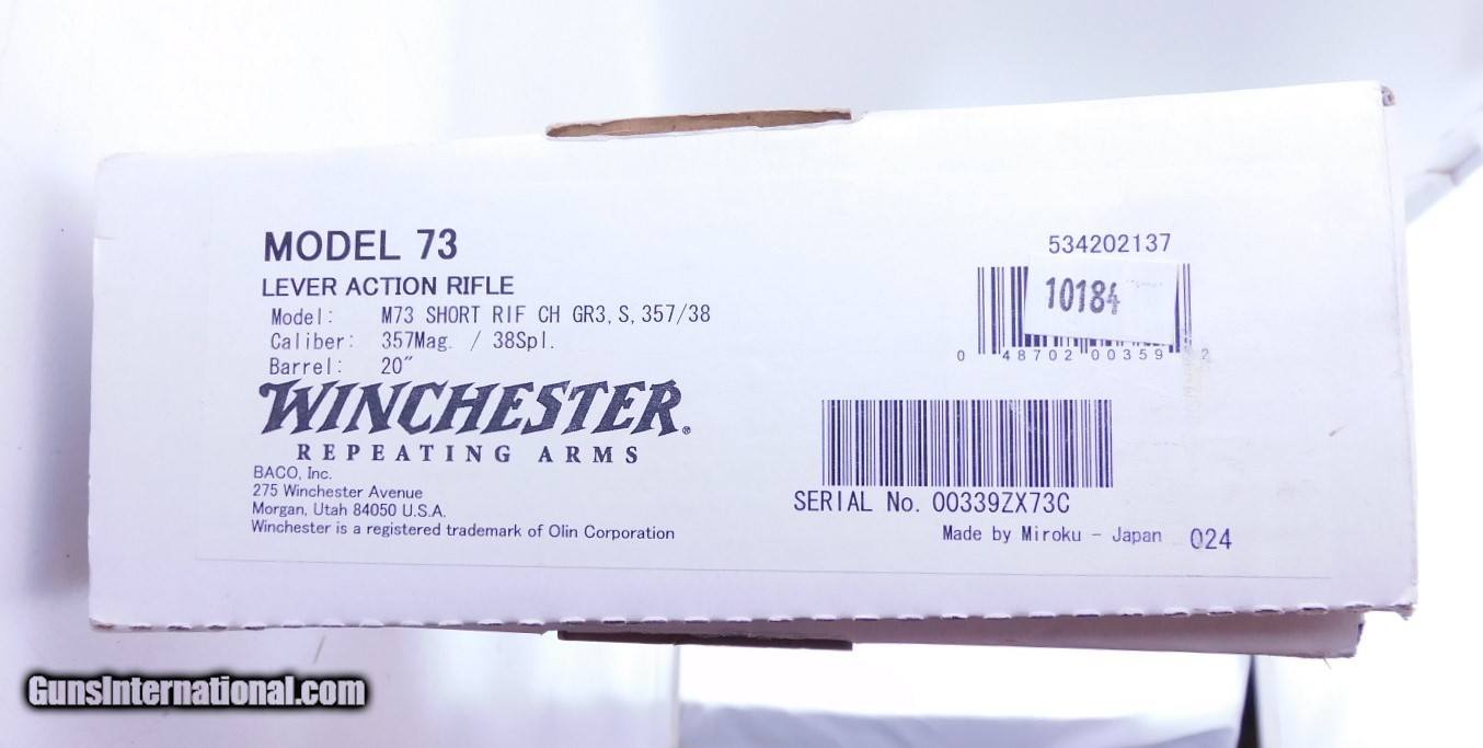Description: Beautiful Winchester 73 Short Rifle .357 LNIB, 20" bbl, excellent bore, semi buckhorn rear sight, bead front sight, blued finish, near perfect Grade III smooth straight wrist butt stock - forearm, LOP - 12 7/8", color case hardened receiver - lever - butt plate, original box and documentation. Great rifle for your collection! Add 3% for Credit Card Shipping $40.00 SOLD |