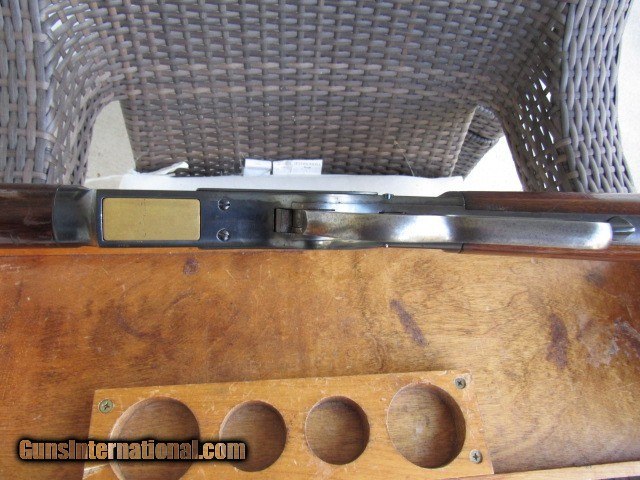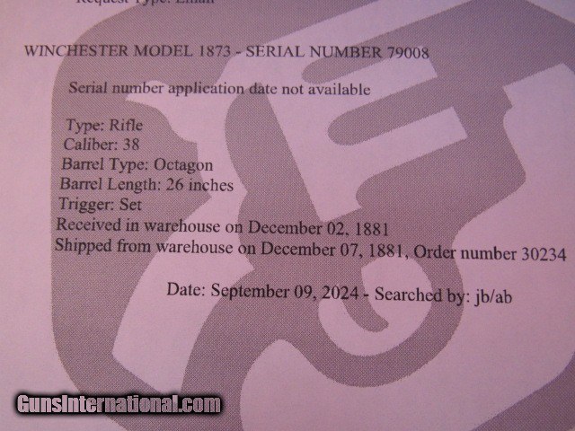 Description: ************ SALE PENDING BRIAN F. ************ ******* Fall special - Free Shipping!! ******* Winchester Model 1873 2nd model (dust cover rail attached by screws and external trigger pin) special order rifle in 38 WCF with 26" octagon barrel 2" longer than standard and single set trigger. Standard features of full magazine, blued and case hardened finish, plain stocks, and plain trigger. Typical of the early 38 WCF (38-40) rifles, this one has a shotgun butt with smooth steel butt plate as standard issue. Assembly number "1258" matches on left lower tang, upper channel of butt stock, and inner toe of butt plate, so this one is all matching. Cody Museum email sheet that will be provided to the buyer verifies the features and is pictured. This is one of several in this serial range where the factory had to use carbine receivers to assemble rifles as they were out of rifle receivers - note 2 plugged holes on left side where saddle ring would be attached on a carbine. Except for the lever, trigger, and rear sight elevator, all metal surfaces were professionally refinished at some point. The rifle retains 99% of that expert refinish with no buffing visible. All markings are still sharp. Brass cartridge elevator also remains untouched with some carry wear to the caliber marking. Retains the correct, shorter rear sight. Action is smooth. Half cock safety functions properly, and thankfully, so does the set trigger. Bore is good, a 6 of 10, with typical scattered light black powder pitting but no rings, no bulges, no deep pits or craters, and it still spins a bullet just fine. Stocks are sound with no splits or cracks, still tight and proud, never sanded, exhibiting typical scuffs and dings from 120+ years of use and protected by an added layer of finish. Mag tube is still tight in the dovetail with no wobble. Wish it had been left alone but I can't turn back the clock and undo the refinish, so here it is in its present state. Very nice looking, special order early 38 WCF rifle with provenance. No international sales. Antique so it can ship to the address of your choice assuming your local laws allow such. Must ship to FFL for NY State buyers. Payment by personal check, bank check or postal money order (sorry no credit cards). 3 day non-firing inspection. Buyer pays return shipping. Packed with care and shipped USPS Mail with tracking. SOLD Antique: Yes Rifle Caliber: .38-40 Winchester Manufacturer: Winchester Model: 1873 Serial Number: 79008 Barrel Length: 26" Octagon Condition: Excellent Metal Condition: Excellent Wood Condition: Excellent Bore Condition: Good Action: Lever Triggers: Single set Stock: Walnut Butt Pad: Steel Sights: Standard Manufacture Date: 1881 Item Location: New York |