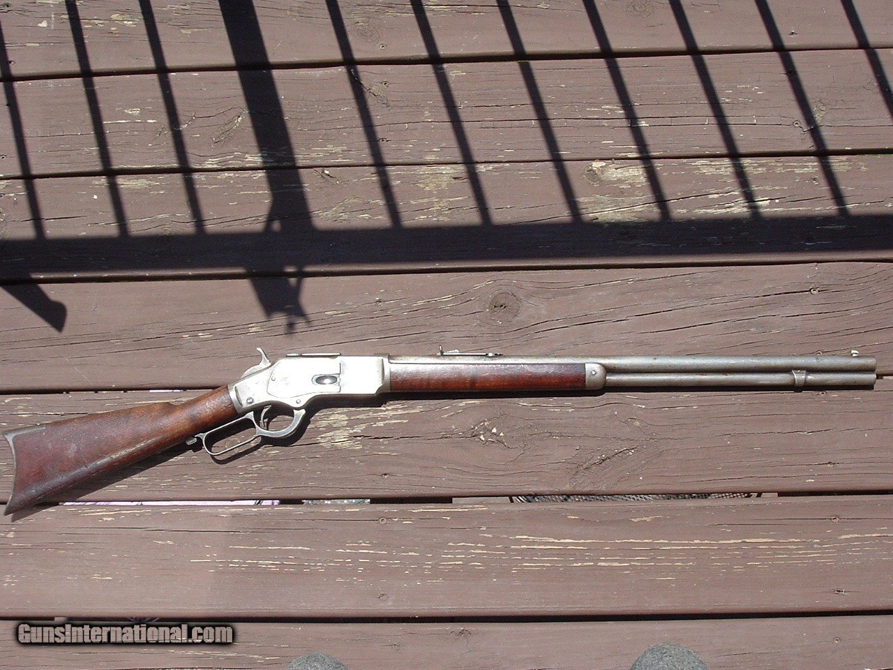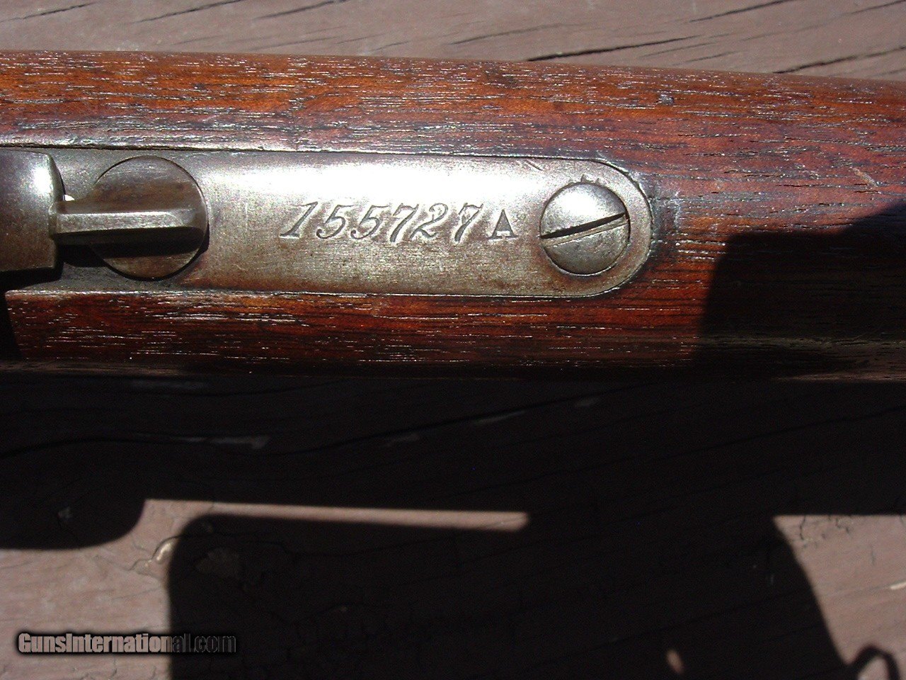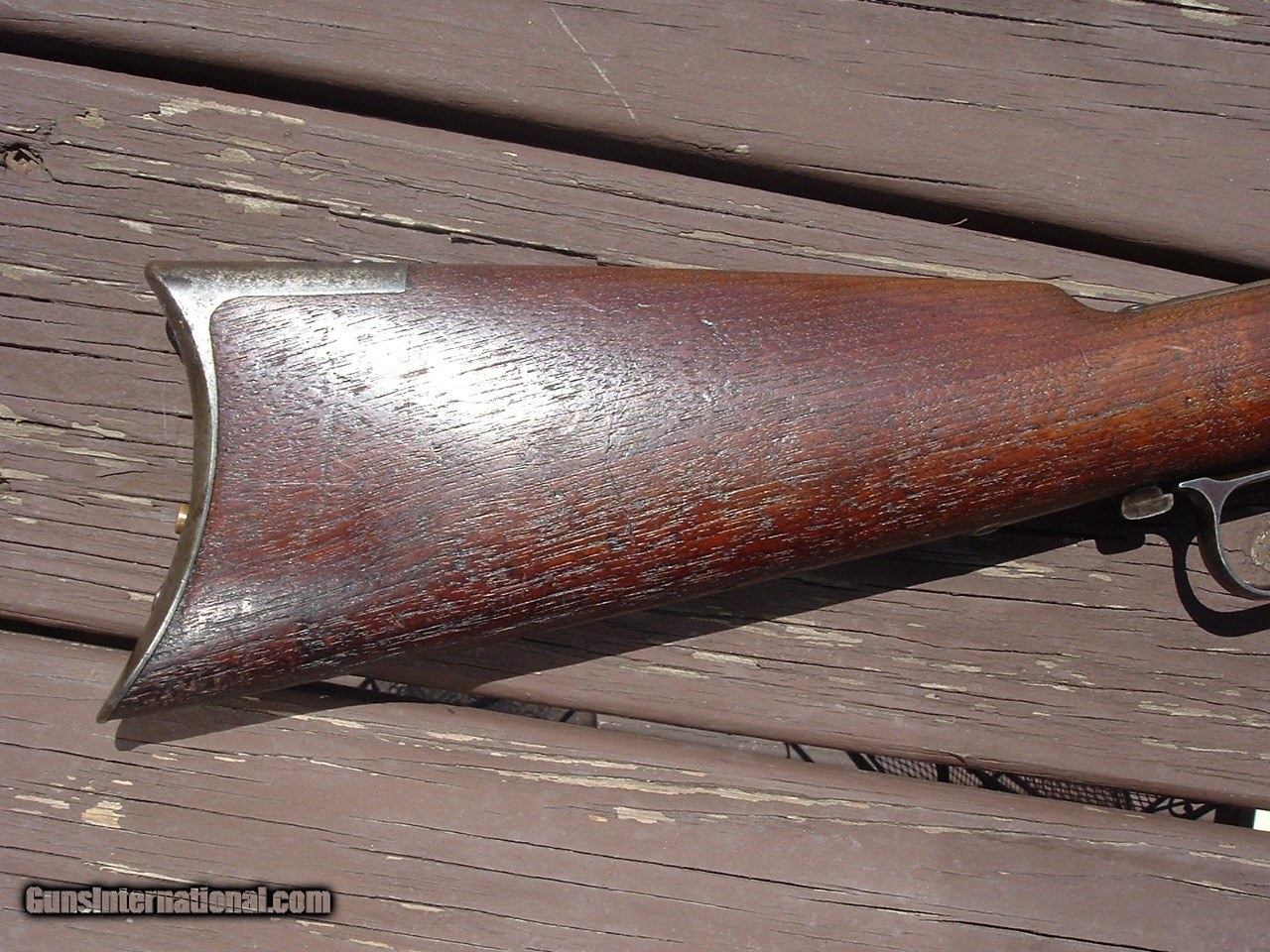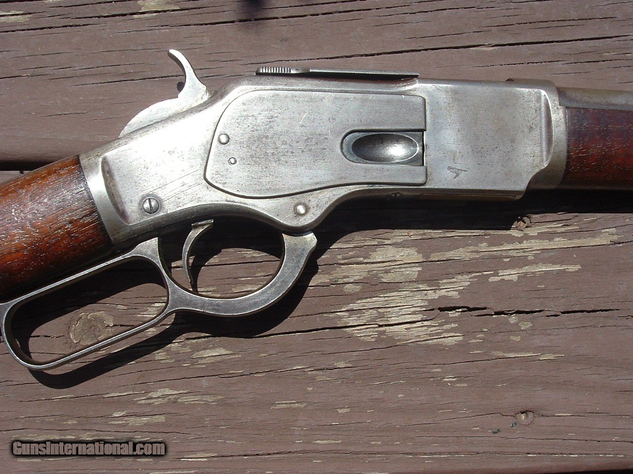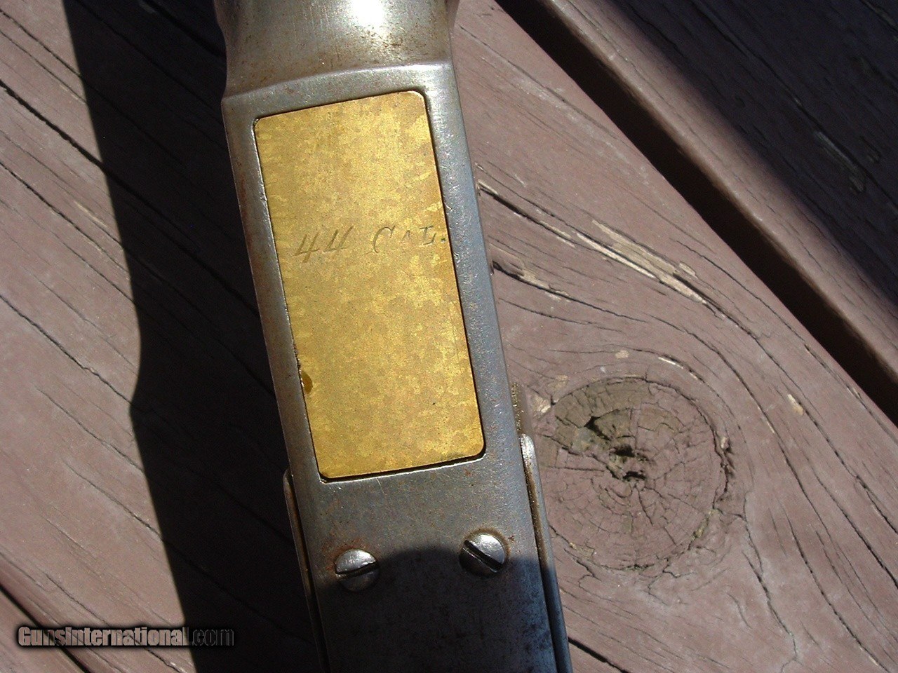 Description: Winchester model 1873 rifle, .44-40, 24" barrel. Serial #155727A, 1884 manufacture. Very good clean light rifled bore, metal overall is a pleasing dove-tail grey age patina. Very good, clear barrel address is all there. Top of barrel at breech as well as brass block both stamped "44 CAL". Mechanics are very good. Original sights, buckhorn rear sight complete with elevator. Wood is very good+ with much Western character, handling wear, shows no major defects. Correct rifle crescent-style buttplate with compartment, original dust cover. .100% correct and original '73 Winchester carbine in desirable .44-40, much better than average. This '73 came out of Fredericksburg, Texas. SOLD Antique: Yes |