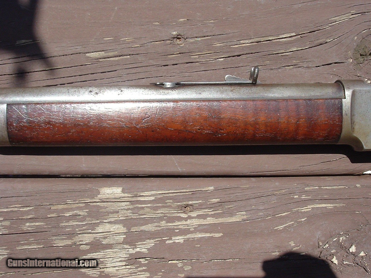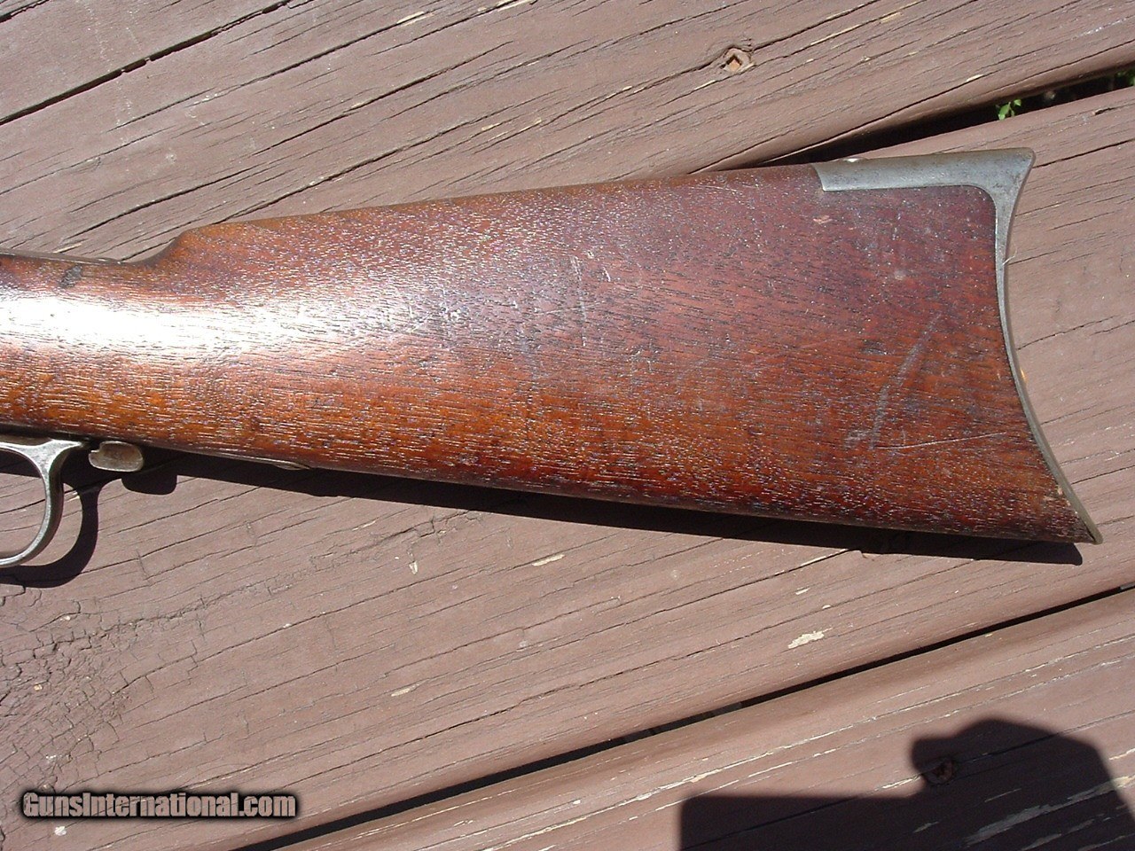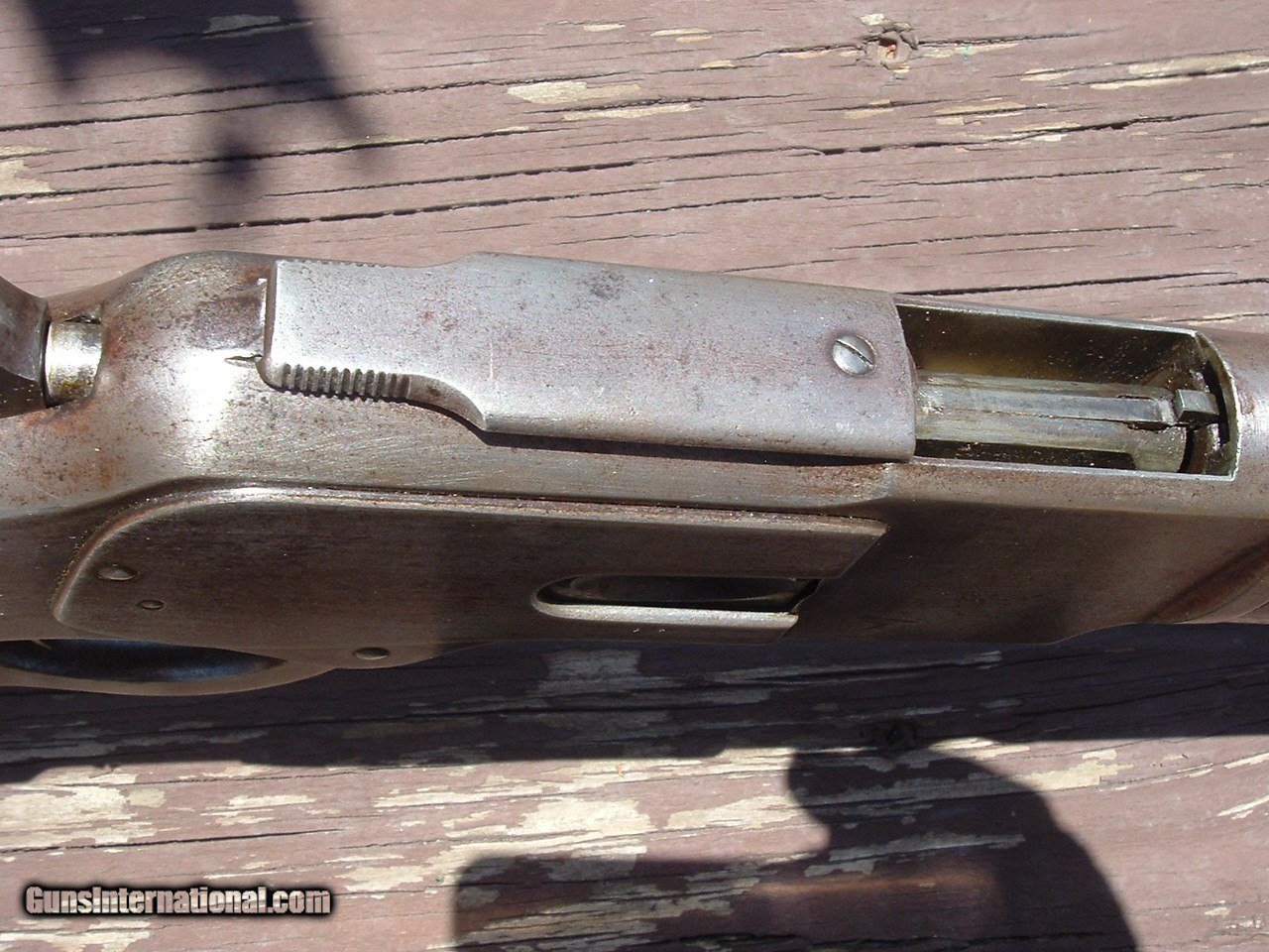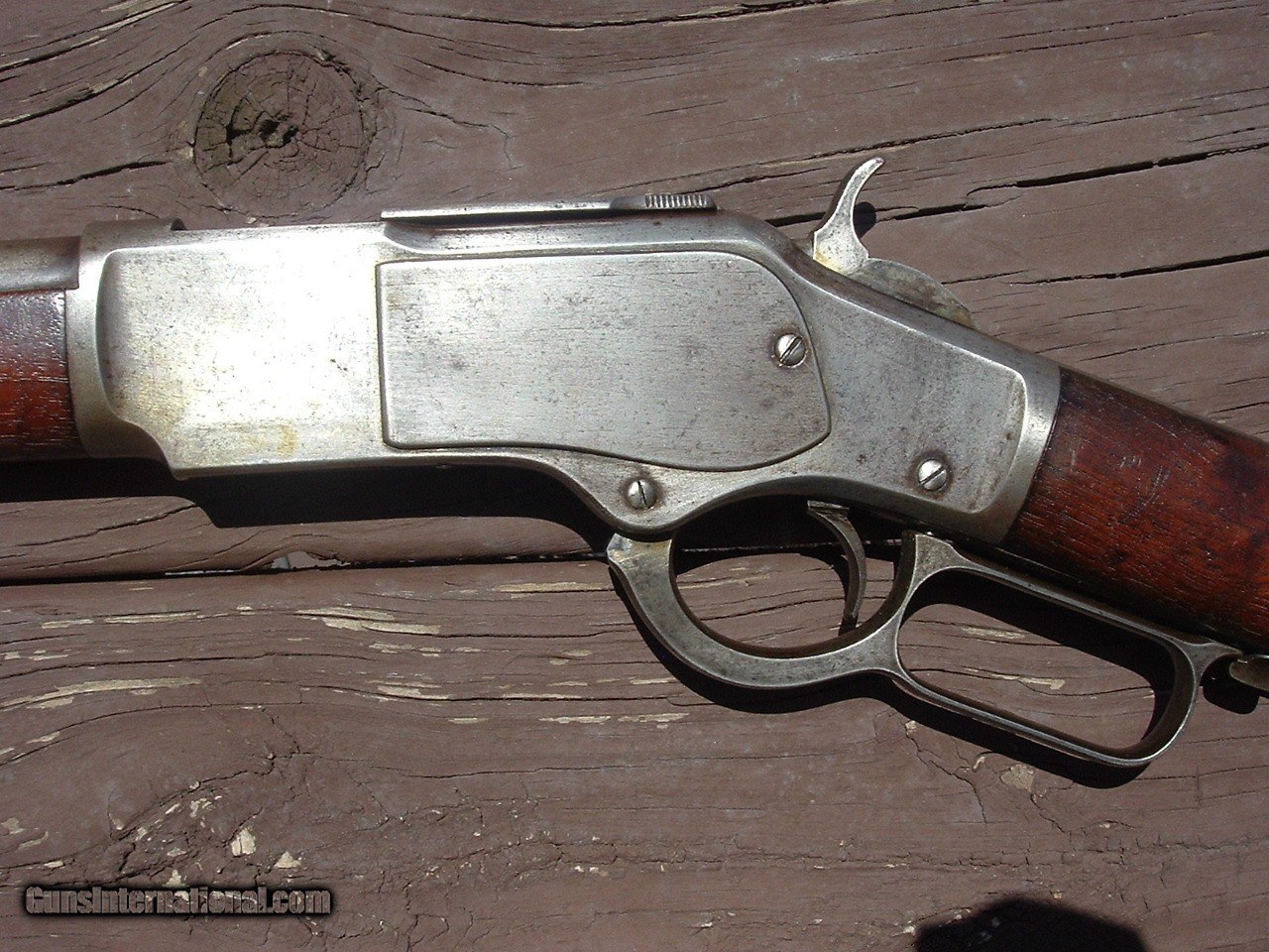 Description: Winchester model 1873 rifle, .44-40, 24" barrel. Serial #155727A, 1884 manufacture. Very good clean light rifled bore, metal overall is a pleasing dove-tail grey age patina. Very good, clear barrel address is all there. Top of barrel at breech as well as brass block both stamped "44 CAL". Mechanics are very good. Original sights, buckhorn rear sight complete with elevator. Wood is very good+ with much Western character, handling wear, shows no major defects. Correct rifle crescent-style buttplate with compartment, original dust cover. .100% correct and original '73 Winchester carbine in desirable .44-40, much better than average. This '73 came out of Fredericksburg, Texas. SOLD Antique: Yes |