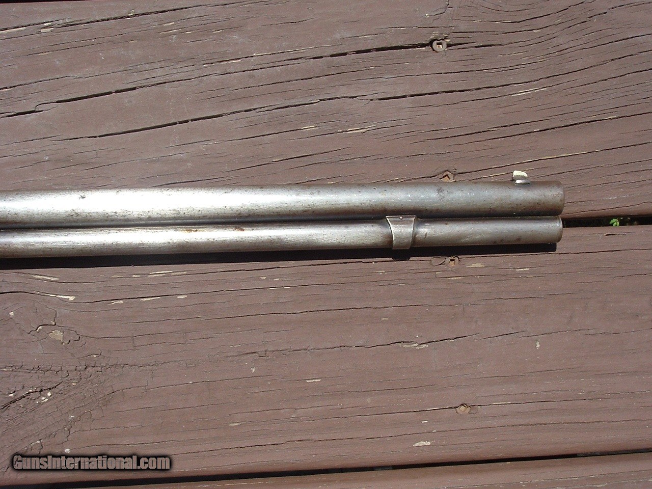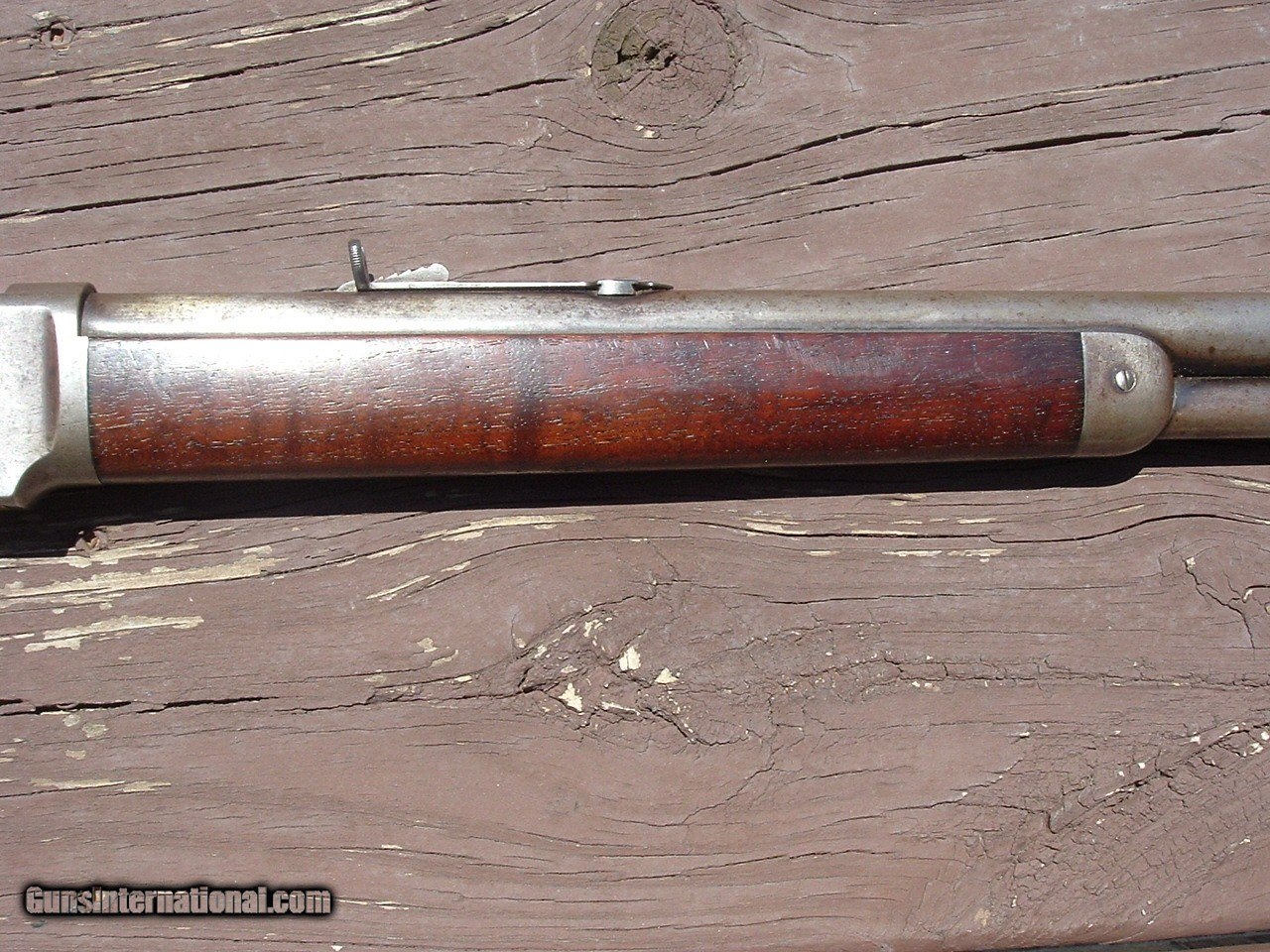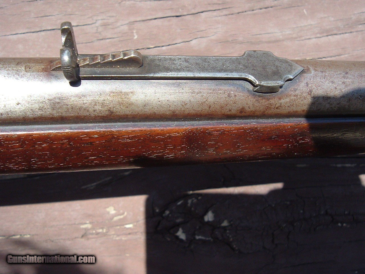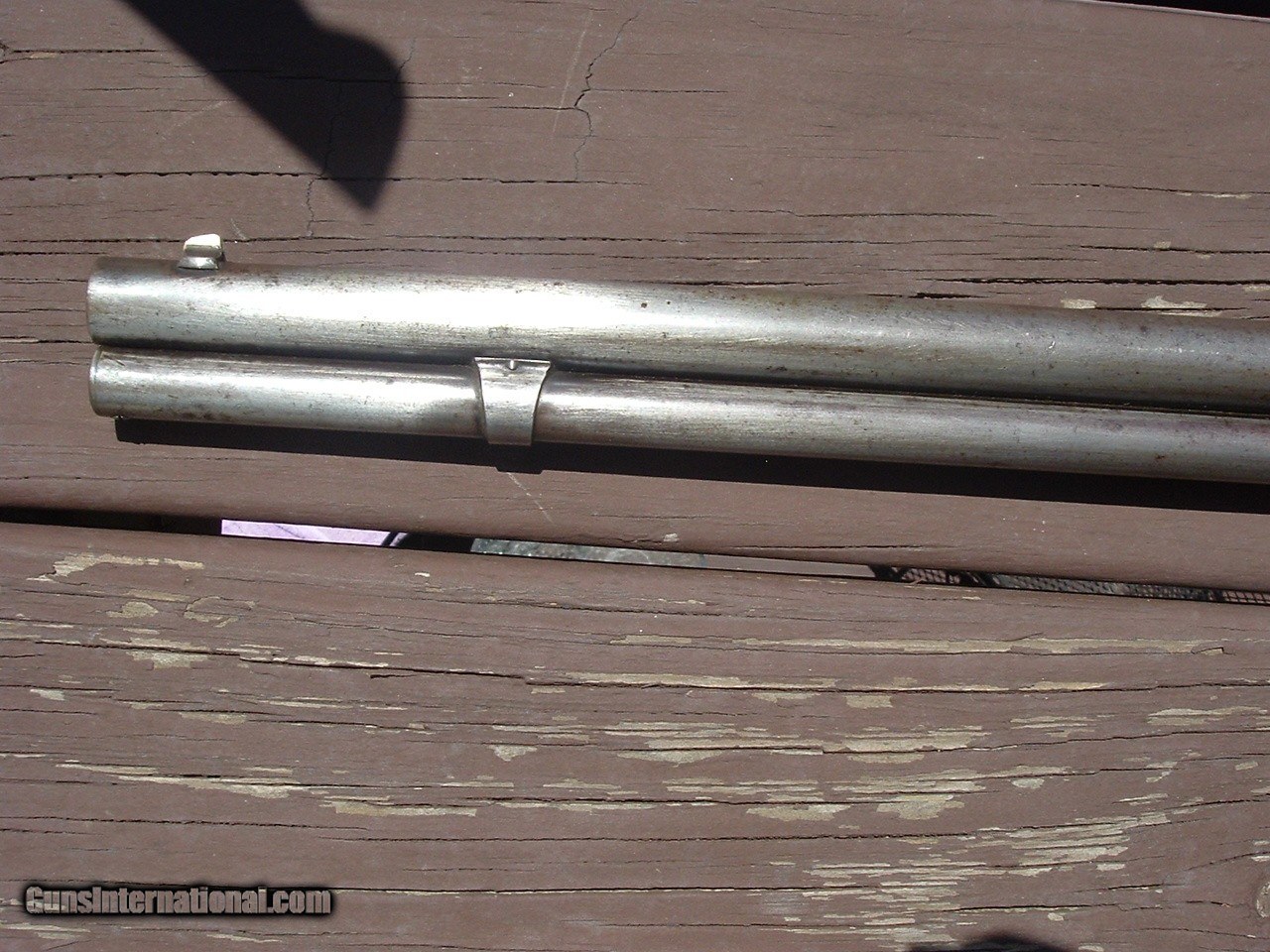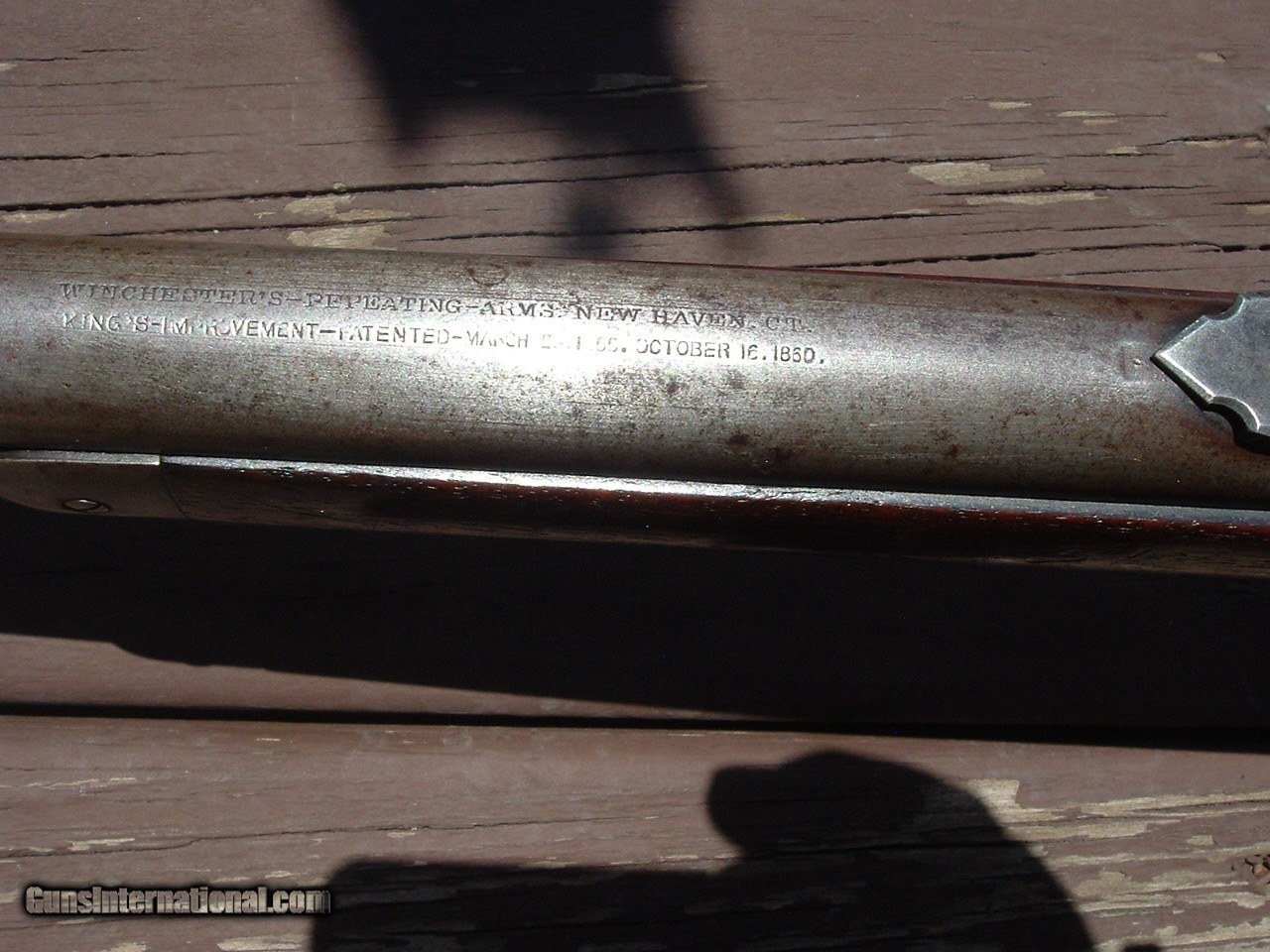 Description: Winchester model 1873 rifle, .44-40, 24" barrel. Serial #155727A, 1884 manufacture. Very good clean light rifled bore, metal overall is a pleasing dove-tail grey age patina. Very good, clear barrel address is all there. Top of barrel at breech as well as brass block both stamped "44 CAL". Mechanics are very good. Original sights, buckhorn rear sight complete with elevator. Wood is very good+ with much Western character, handling wear, shows no major defects. Correct rifle crescent-style buttplate with compartment, original dust cover. .100% correct and original '73 Winchester carbine in desirable .44-40, much better than average. This '73 came out of Fredericksburg, Texas. SOLD Antique: Yes |