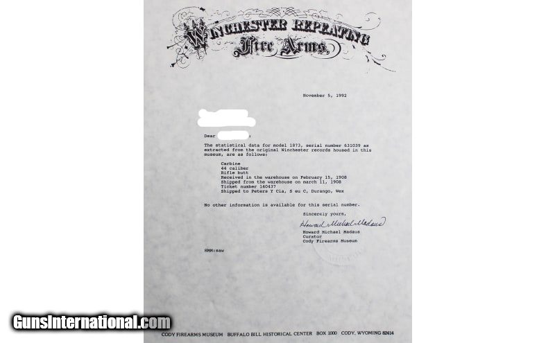 Description: Winchester Model 1873 Saddle Ring Carbine lever action rifle chambered in .44 WCF (.44-40 Winchester). Included Cody Museum letter confirms shipment to Peters y Cia in Durango, Mexico on 11 March 1908. .44-40 Winchester SOLD Curio/Relic: Yes Metal Condition: "Fair with Heavy Handling Marks, Pitting and Refinished Cold Bluing Wood Condition: "Fair with Handling Marks, Chips, Wear, and Dings Bore Condition: Dark with Heavy Pitting Barrels: 20 inch Item Location: Fort Worth, TX |
