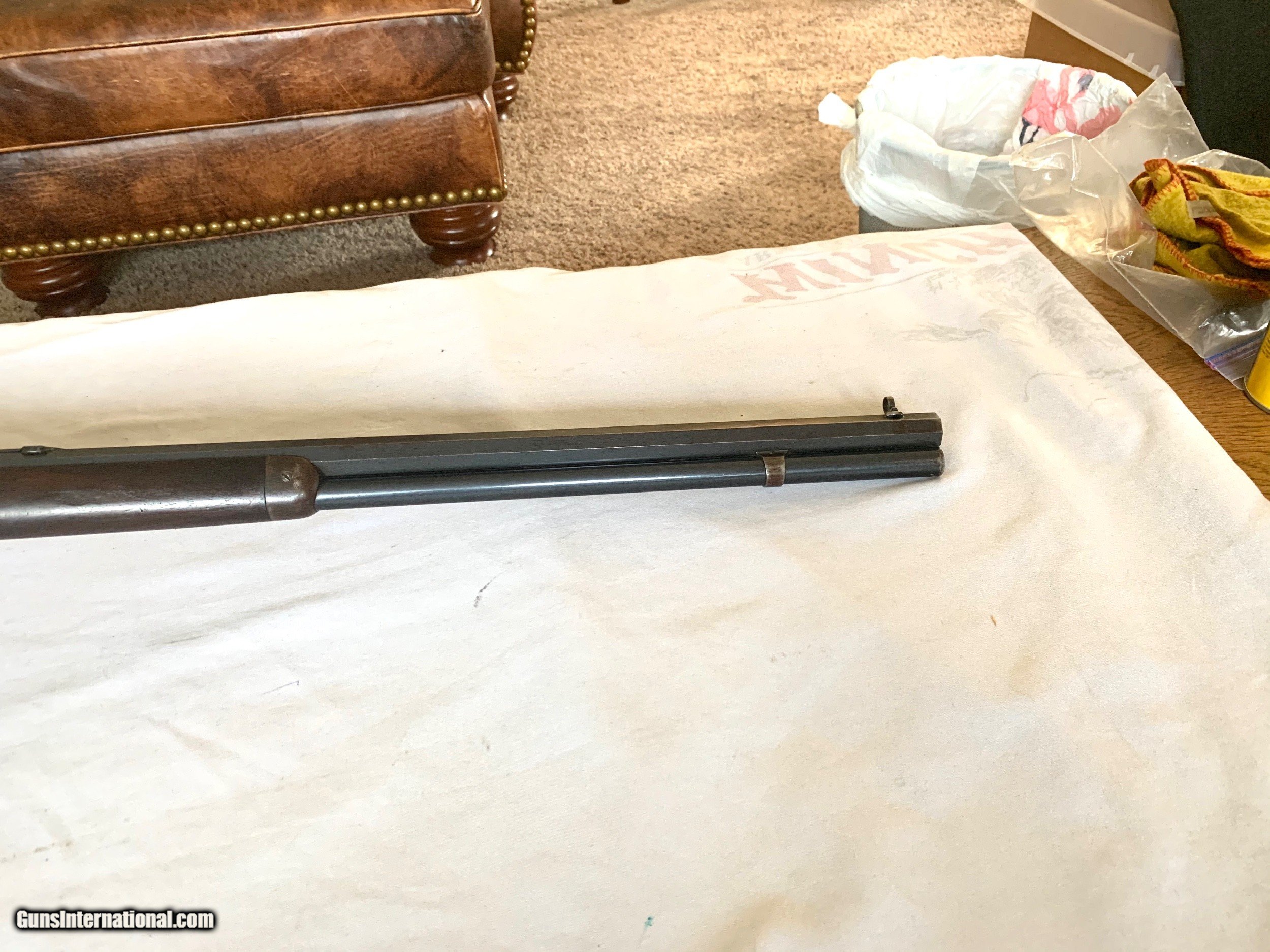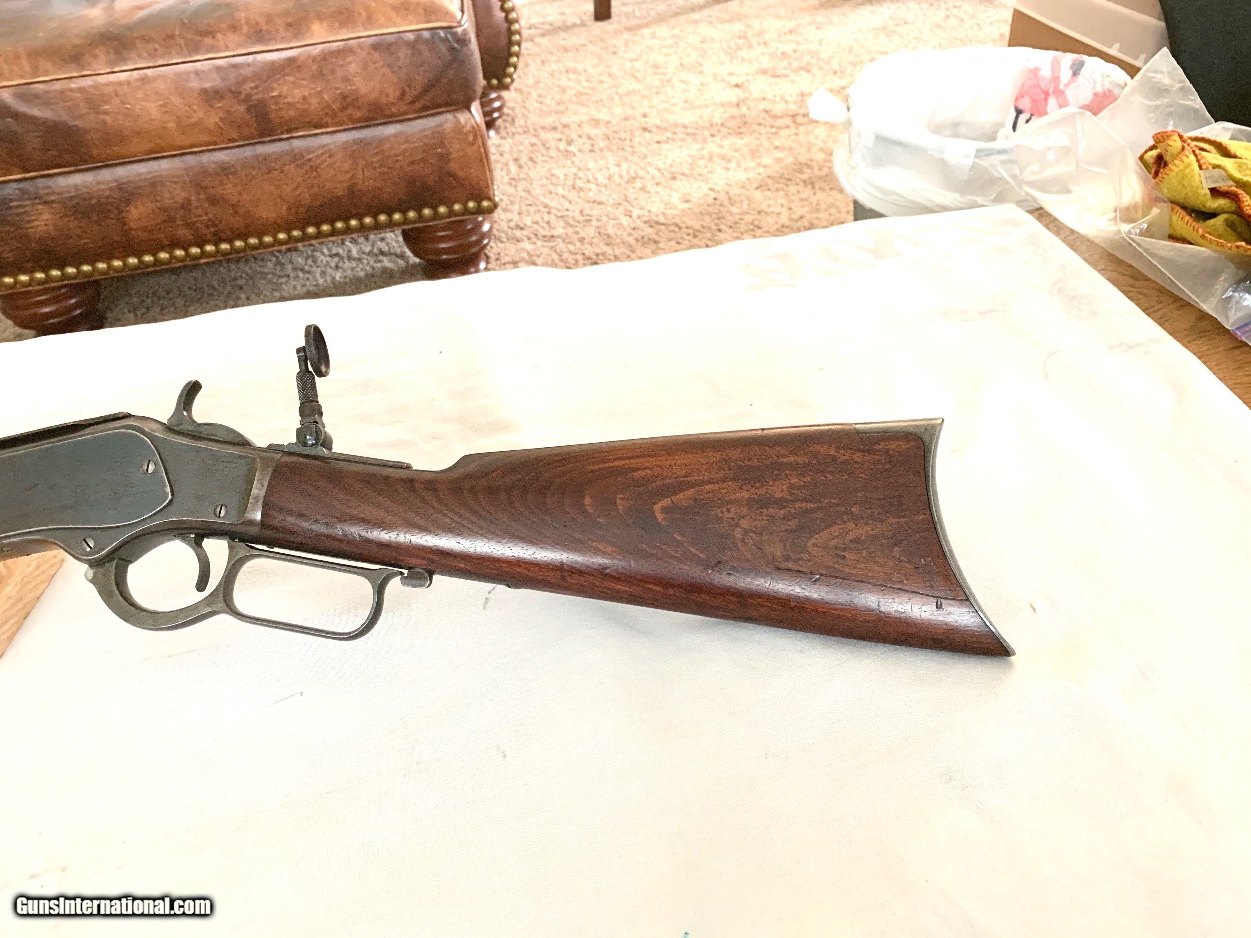Description: Heres a Excellent Plus Example of a Winchester Model 1873 Rifle in 38-40 Caliber . Serial number 595768. 100percent factory Original gun . Untouched. Octagon Barrel has all of its original blue finish remaining. Frame has all of its original luster finish remaining thinning down to 80percent solid blue rest turning a blue plum patina . Markings are crisp .Fancy Select Wood is Excellent Plus Condition . With some handling marks and dings still has all of its original finish remaining. Butt plate shows traces of case colors . Hammer shows strong case color . Bore is a 8 1/2 . Mechanics are excellent. The Special order winchester sights are original to the gun ! Super nice 1873 Rifle ! Please review my photos and email me with any questions ? 3 day inspection as allways. Thank you for looking Little Jo SOLD Antique: Yes Manufacturer: Winchester Model: 1873 |