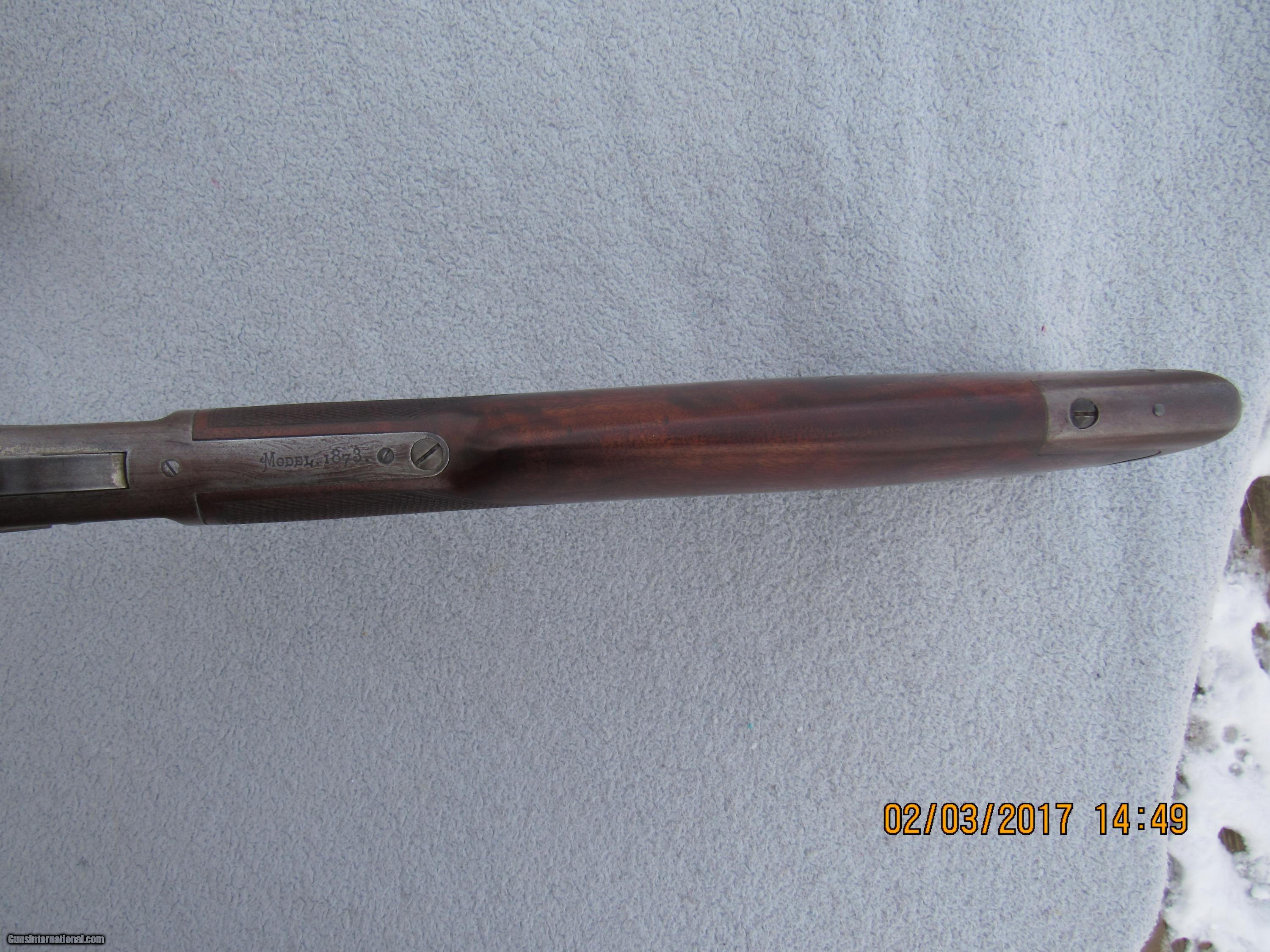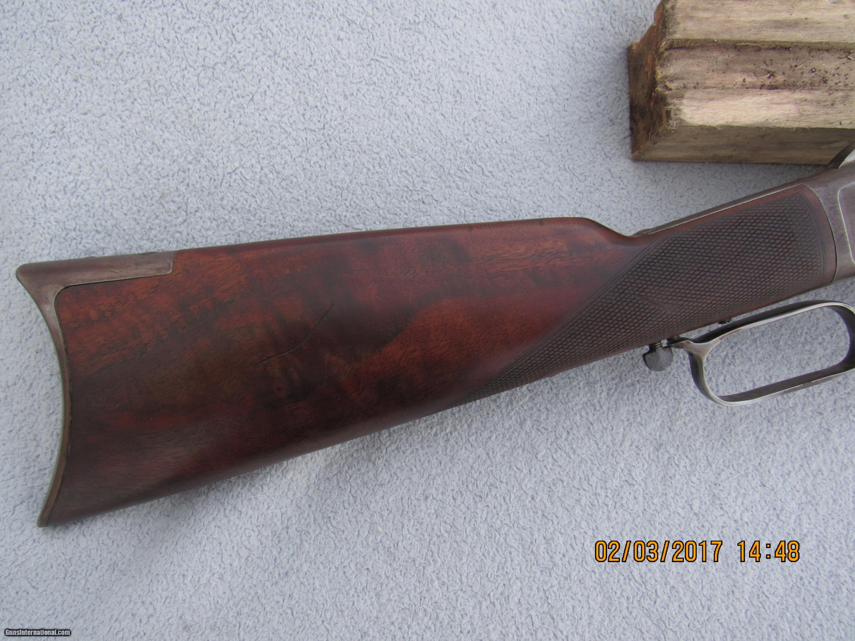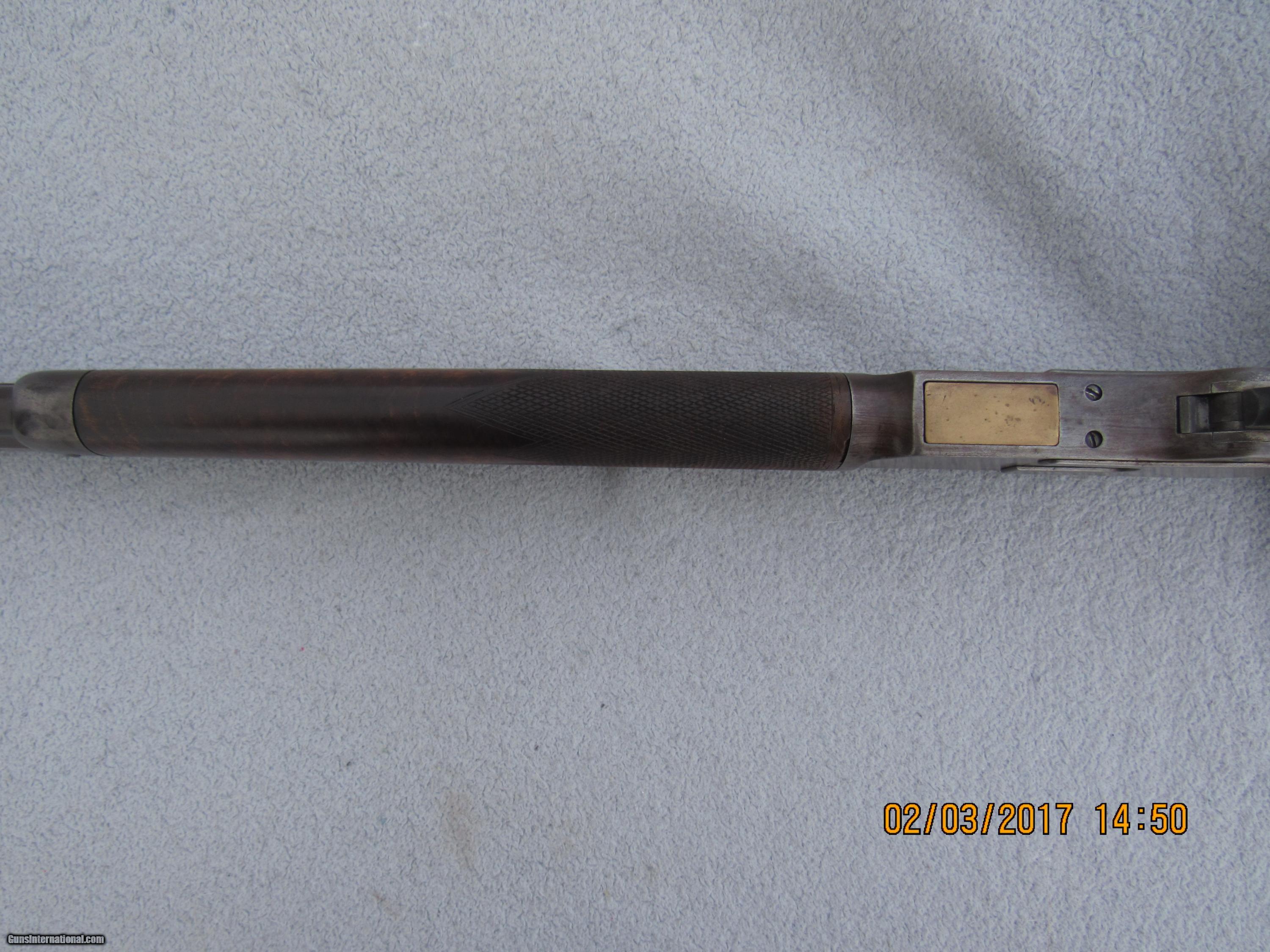 Description: Winchester Model 1873 Full Deluxe First Model rifle serial # 13566. Factory records in the letter from the Cody Museum state: Type: Rifle Barrel type: Octagon Barrel length: 28" Trigger: Set XXX Checkered stock Casehardened Received in the warehouse on December 31, 1874 Shipped from the warehouse on January 4, 1875, Order number 4987 Rifle remains completely original and untouched in its factory configuration. Of course it is caliber 44 as all the First Models were and has a full magazine since that fact is not stated in the records unless its a special length. Set trigger fuctions properly, as does the half-cock safety. Bore is very good. Original checkering in good condition with some wear and scratches but never recut. Original XXX stocks are also in very good condition, never sanded or refinished, no extra holes, no splits or cracks, just normal usage wear and slight shrinkage of forearm due to age (is a tad loose and has a very small gap due to drying out and shrinking; common on a rifle this old). Still has original lever latch, dust cover, and screw-in type magazine tube end cap, as well as the short sporting rear sight common to the First Model and early Second Model 1873s. Has a Rocky Mountain front sight that's been there forever as finish matches rifle but no mention in factory records. Traces of silvery mottled case colors in the protected areas around the sideplates and part of the receiver, otherwise case colors have grayed out over time. Removal of the sideplates shows the number "566" stamped on the inside of each, indicating the last 3 digits of the serial number and matching the case colored sideplates to the rifle. Barrel and mag tube are a deep patina with lots of coverage and normal wear to the octagon edges. Trap door for buttplate and brass carrier block remain uncleaned and that nice mustard color you want to see on these old rifles. Naturally no caliber marking on barrel or carrier block. Assembly numbers match on lower tang and upper inletting of buttstock. No wobble to mag tube. Action is still quite crisp with no hang-up. Fully functional and highly collectible First Model 1873 rifle with many special features that is sure to appreciate in value over time. Antique so no FFL required. Factory letter will be included with rifle. For the past 30 years I have specialized in antique and vintage Winchester firearms, parts, sights, accessories and collectible ammunition. Combined from various internet sites, I have over 650 positive transaction feedbacks, so you can feel confident that my items are presented and described honestly. I am a member of the Winchester Arms Collectors Association, the Buffalo Bill Historical Society/Cody Firearms Museum, and a Life Member of the NRA. I am always looking to purchase single pieces or collections. SOLD Antique: Yes Manufacturer: Winchester Model: 1873 Serial Number: 13566 Caliber Info: 44 WCF Barrels: 28 Action: Lever Triggers: Set Manufacture Date: 1874 |