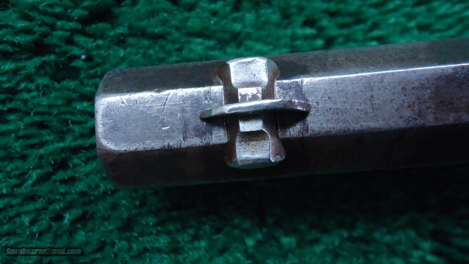 Desirable 20 inch octagon barrel chambered in 44 WCF caliber with a good bore that has shine and visible rifling and scattered light roughness throughout. Sights include a blade front and a sporting rear. Barrel and full length magazine tube are a smooth brown patina with good clear markings. Receiver is about the same color with some scattered patches of light pitting. The left side of the receiver has been lightly marked "TX1653953" with an electro-pencil. Hammer and lever are a darker brown color. Walnut stock is in fine condition showing some light wear and handling mars from life on the wild frontier. Rifle style crescent buttplate. Special order 20 inch short rifles are much more scarce than 20 inch carbines. It has the look of one that was used on the western frontier 130 plus years ago. Factory letter confirms the caliber and barrel length and that it was made in 1891.