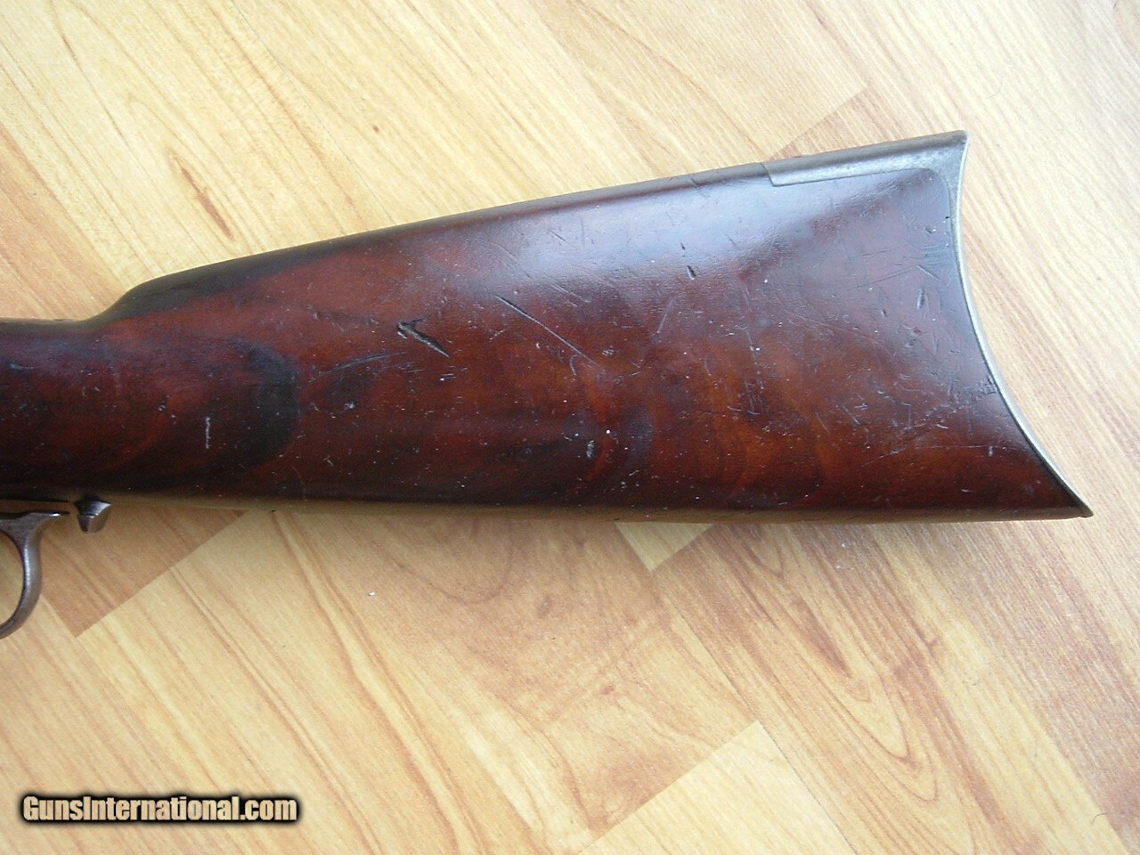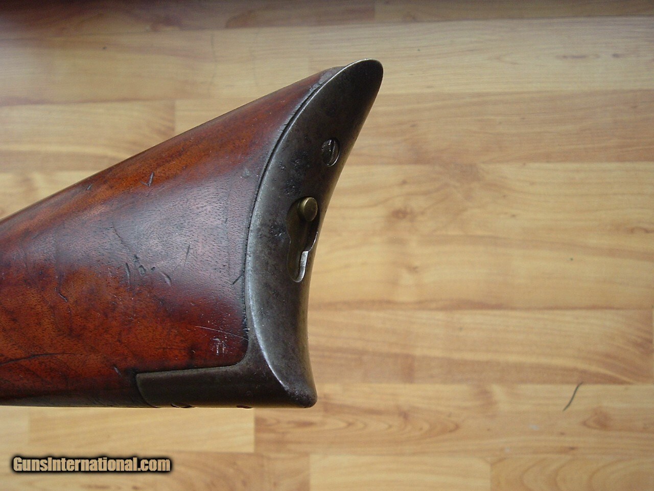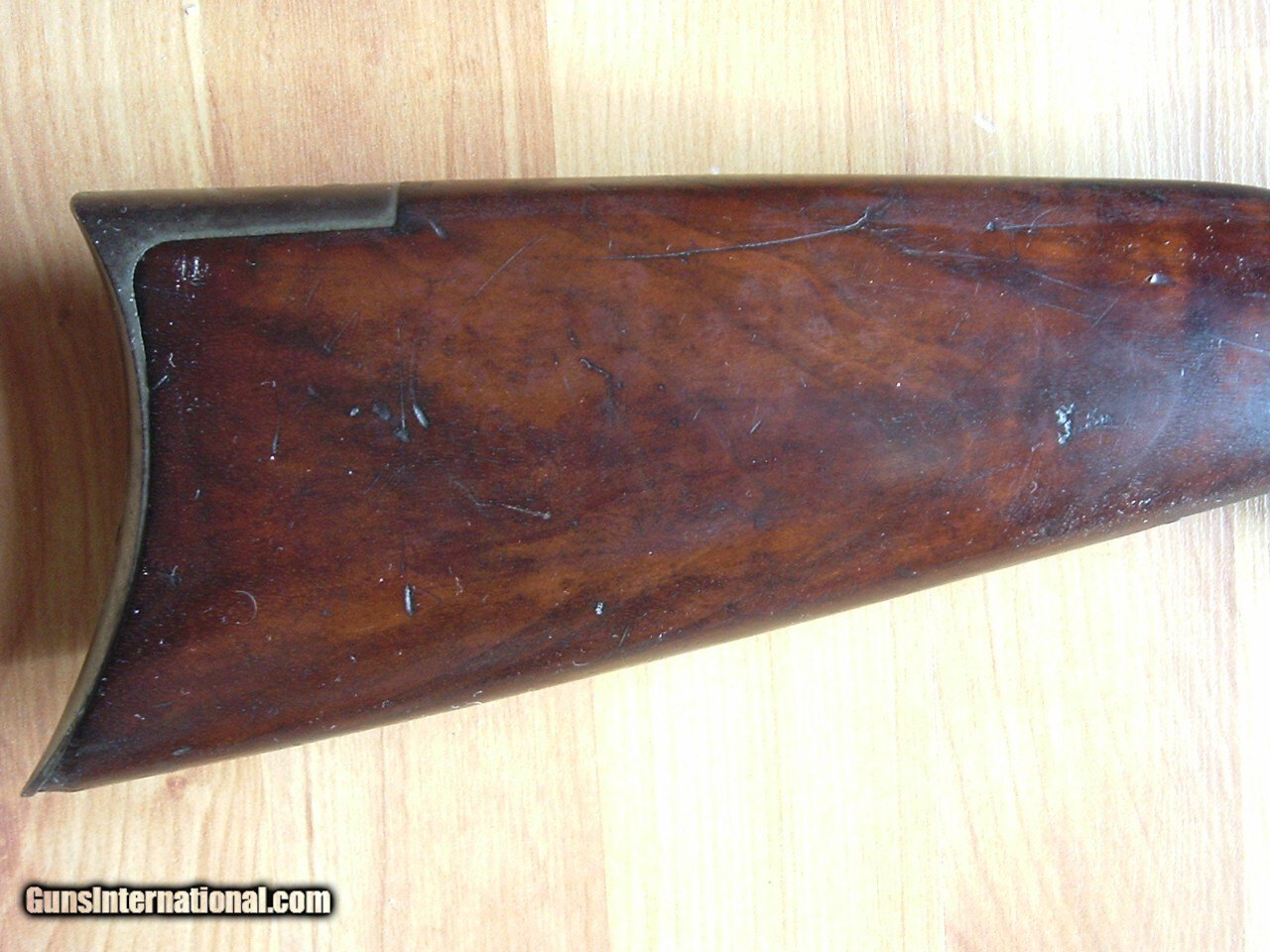 Description: Winchester model 1873 rifle, .44-40. Serial #506935B, 1896 manufacture. Strong traces of original blue remaining on frame, barrel and magazine tube. Overall .40% original blue fading to brown, attractive finish. Very good .44-40 bore is strongly rifled. Clear markings overall. Top of barrel at breech stamped "44 W.C.F.", brass block stamped "44 CAL.". Mechanics are excellent holding at both half and full. Original sights. Wood is very good+ and has a beautiful age luster, excellent wood to metal fit, slight age handling wear, no chips or cracks. Correct crescent-style buttplate with compartment, original dust cover. .100% correct and original '73 Winchester rifle in desirable .44-40 with no issues, fine overall. Antique: Yes Price: $2,950.00 Buy Now Contact Seller |
