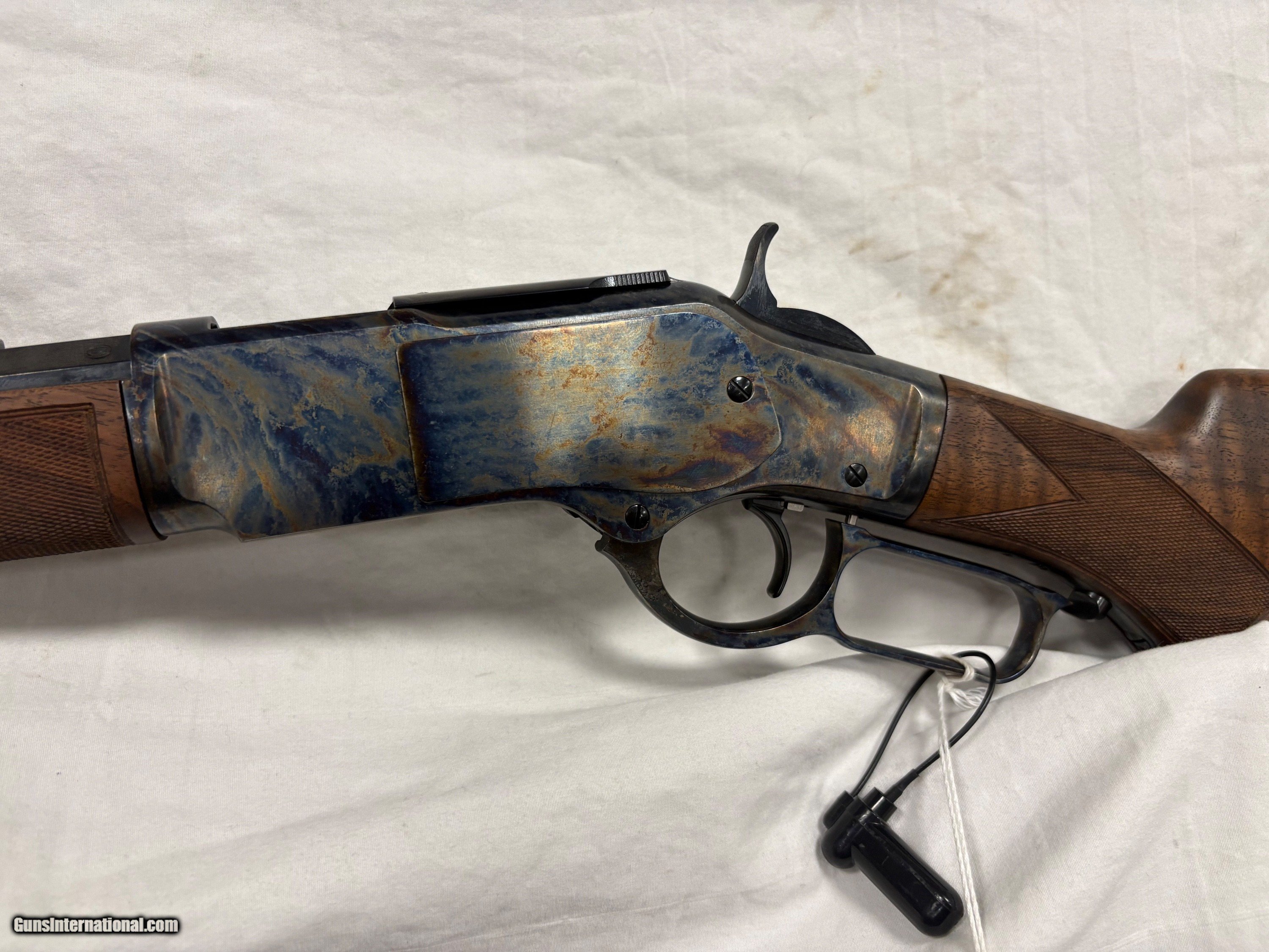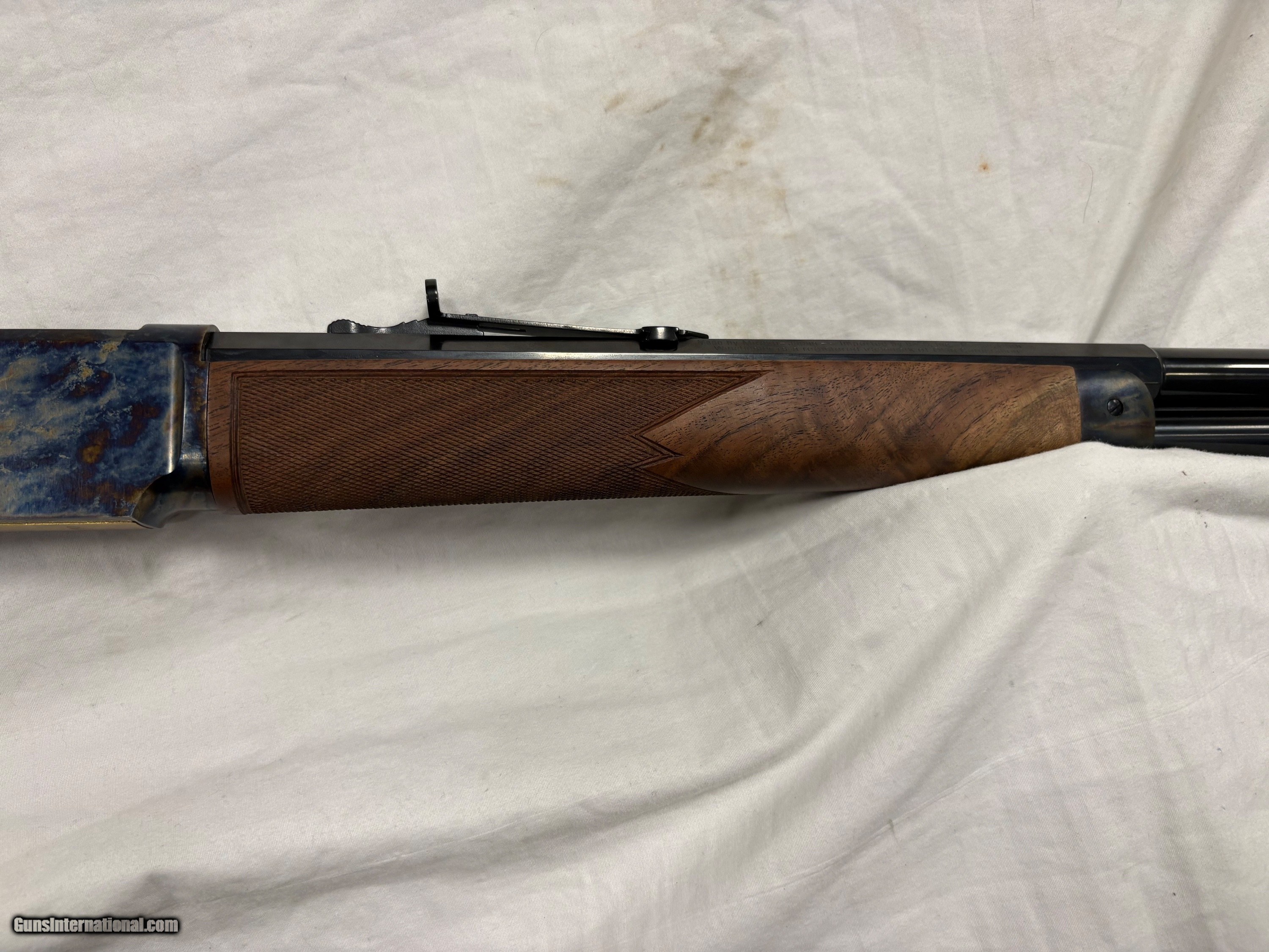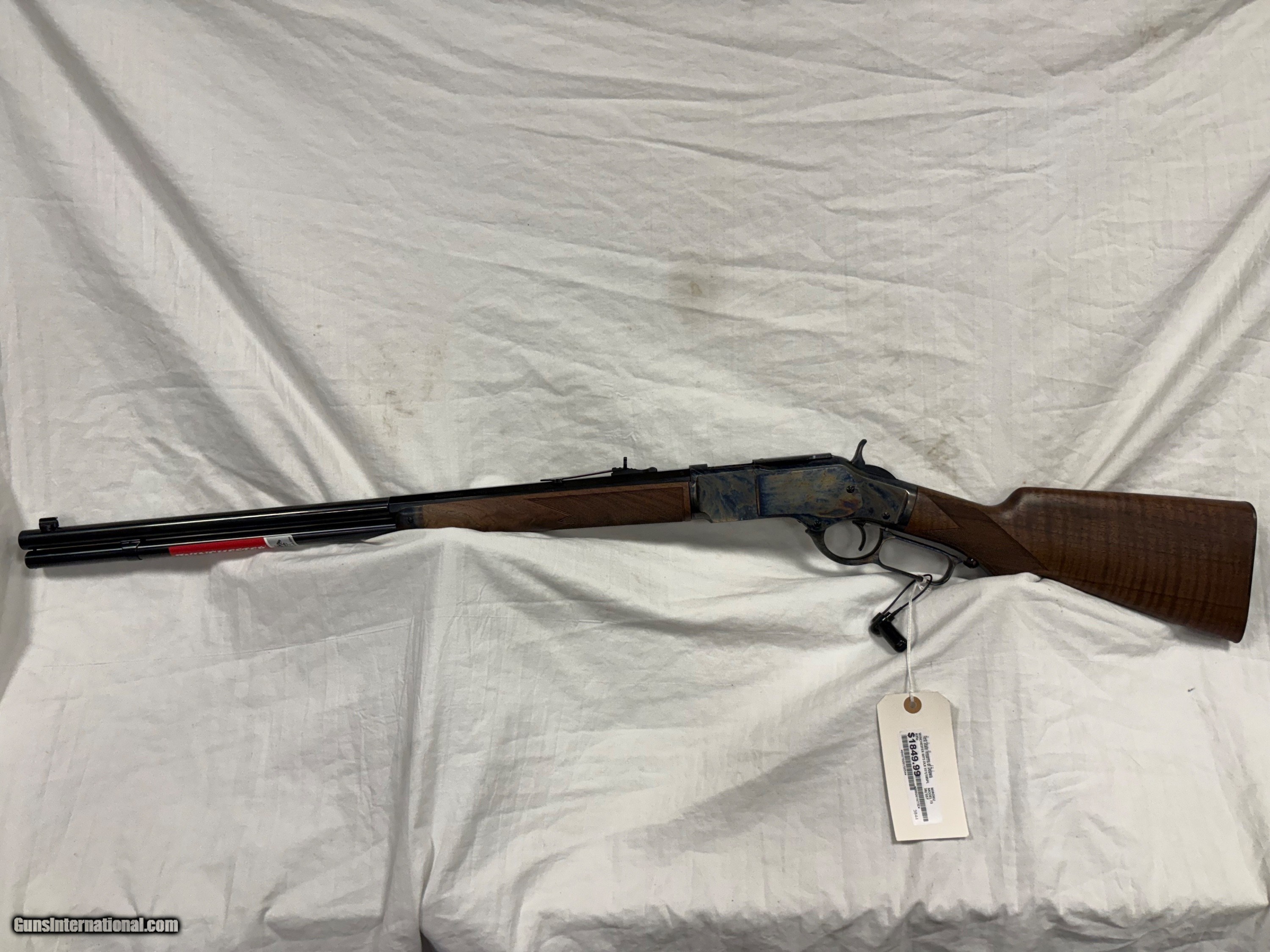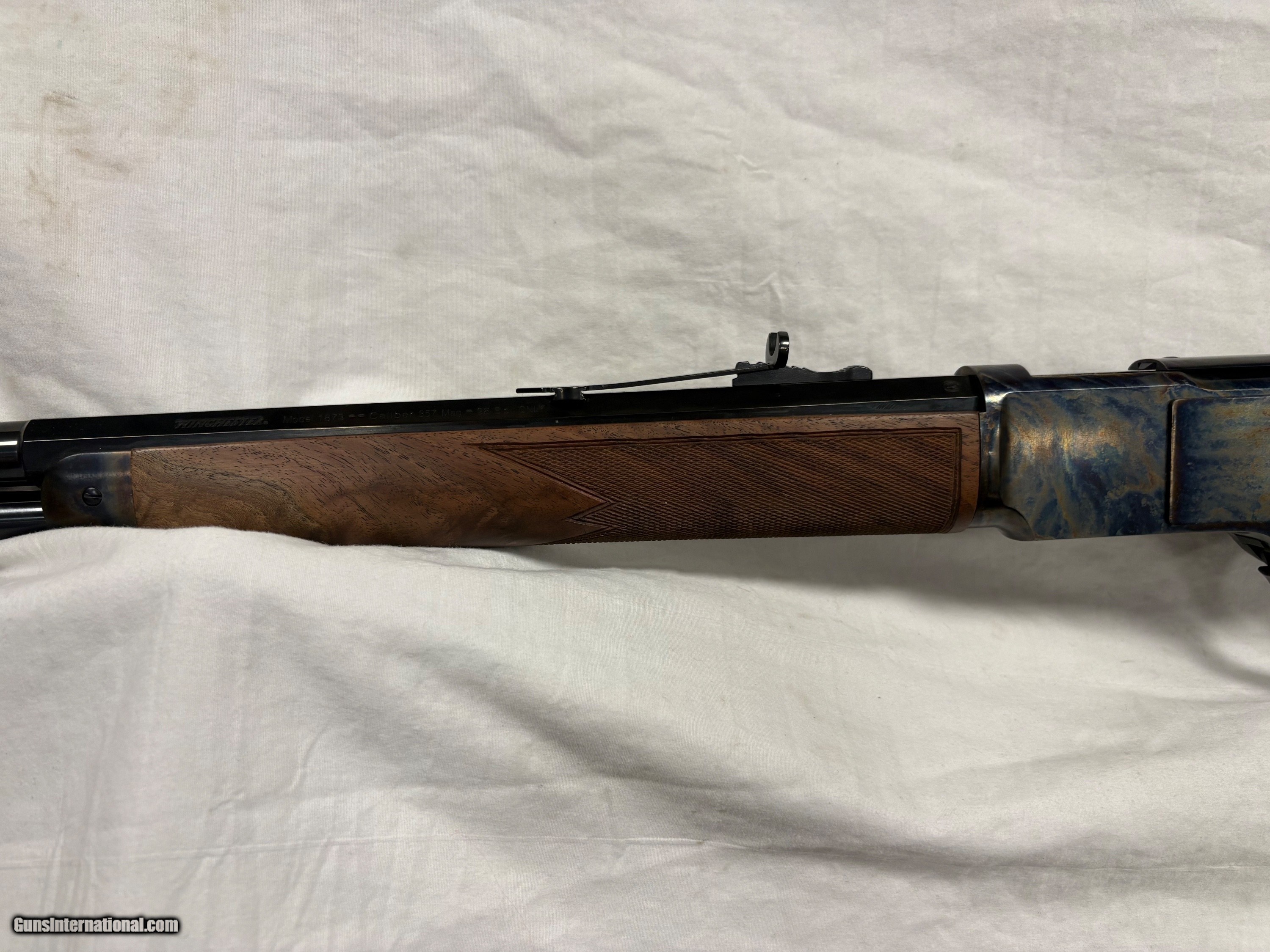 Description: Lever-action Model 1873 rifle with a classic color case-hardened finish, Grade V/VI walnut stock with curved grip, rifle-style forearm and 24" blued half octagon/half round barrel.