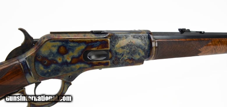 Excellent Engraved Winchester 1876 .45-60 Deluxe Marked 1 of 1000. This gun has been restored to brand new condition and converted into a deluxe gun with the 1 of 1000 marking added at the time of restoration. Very nice engraving on frame with bright case colors that are either Turnbull’s or Turnbull quality. Wood is deluxe walnut and checkered in a Winchester pattern. All work is top notch! Barrel is marked “One of One Thousand” on the top. The caliber marking has been put in front of the sight and this is a .45-60. Bore is very good. Very pretty gun!