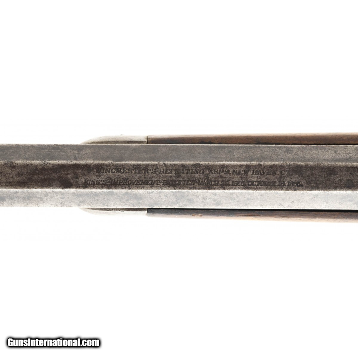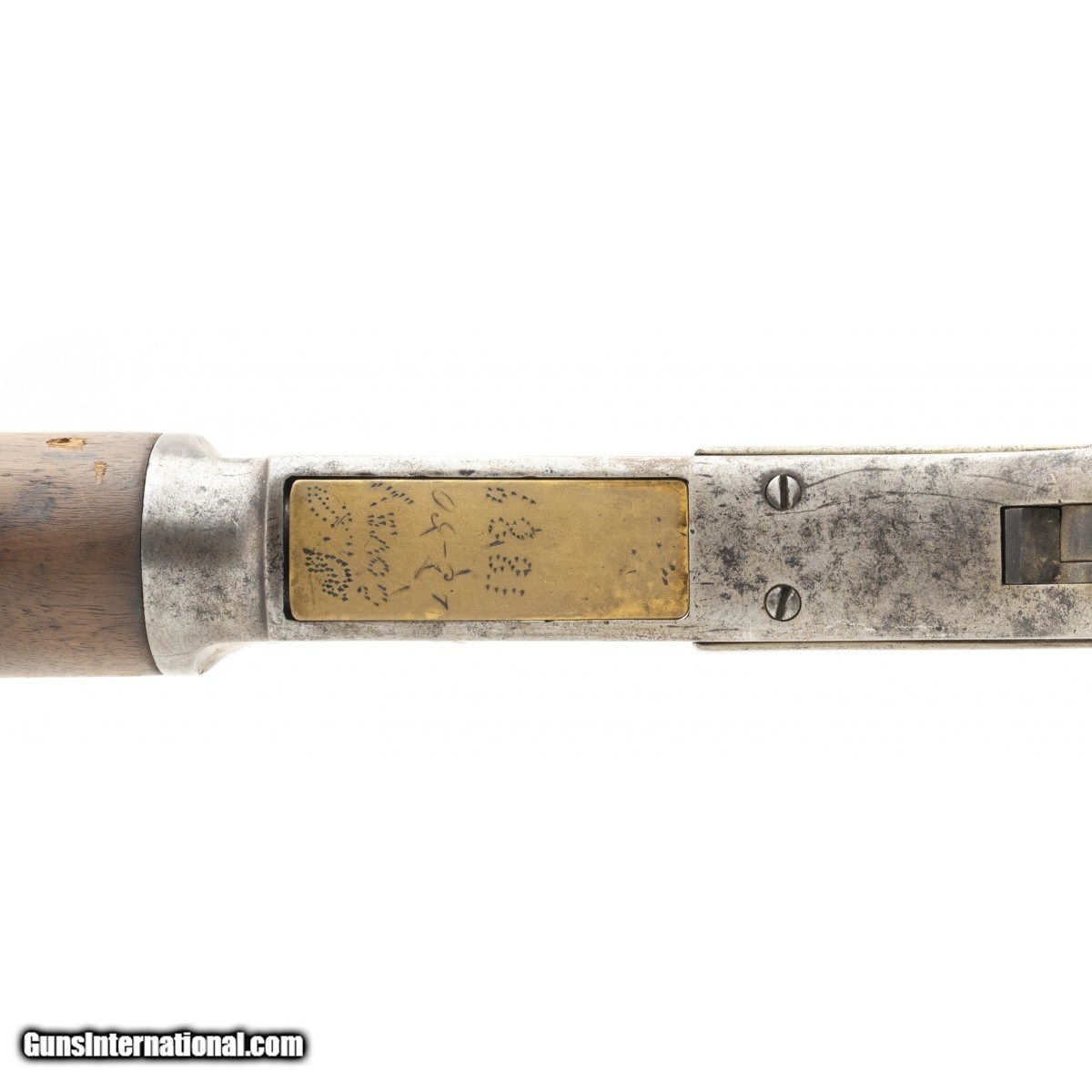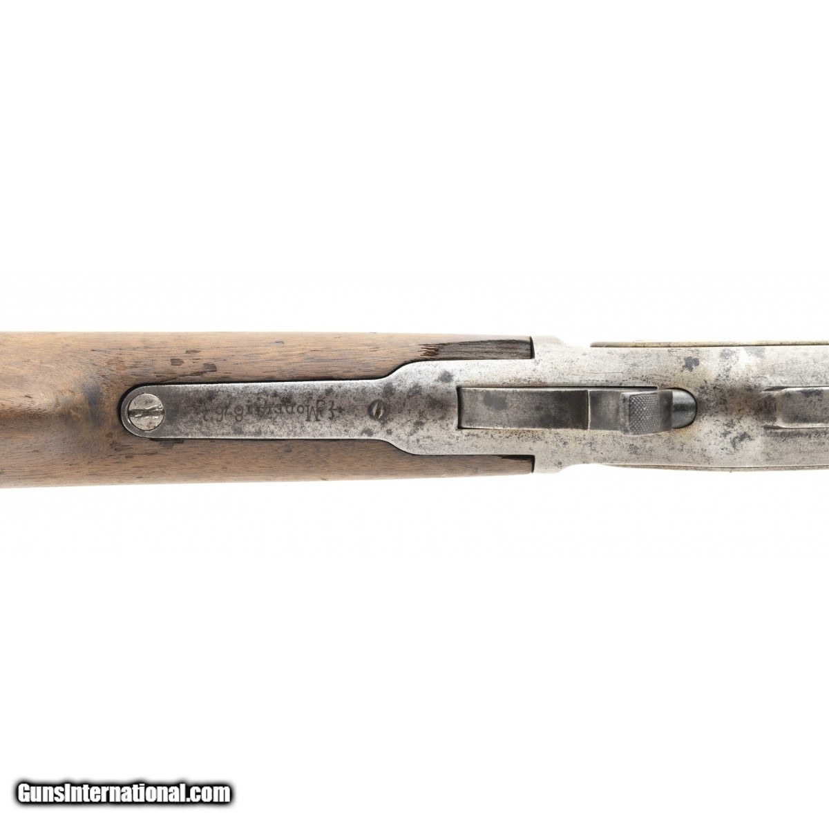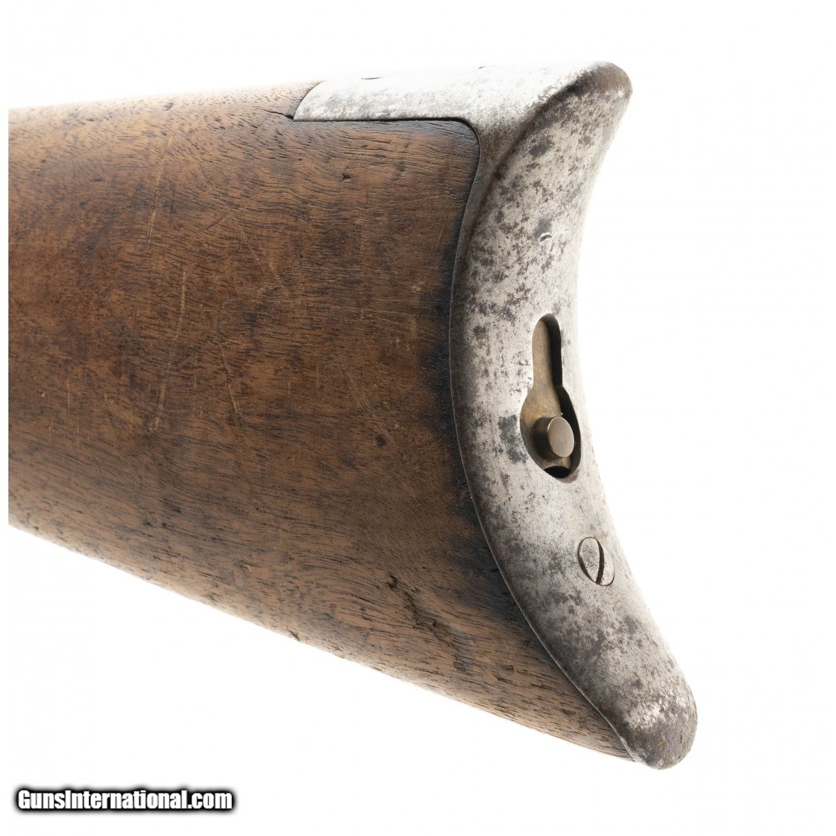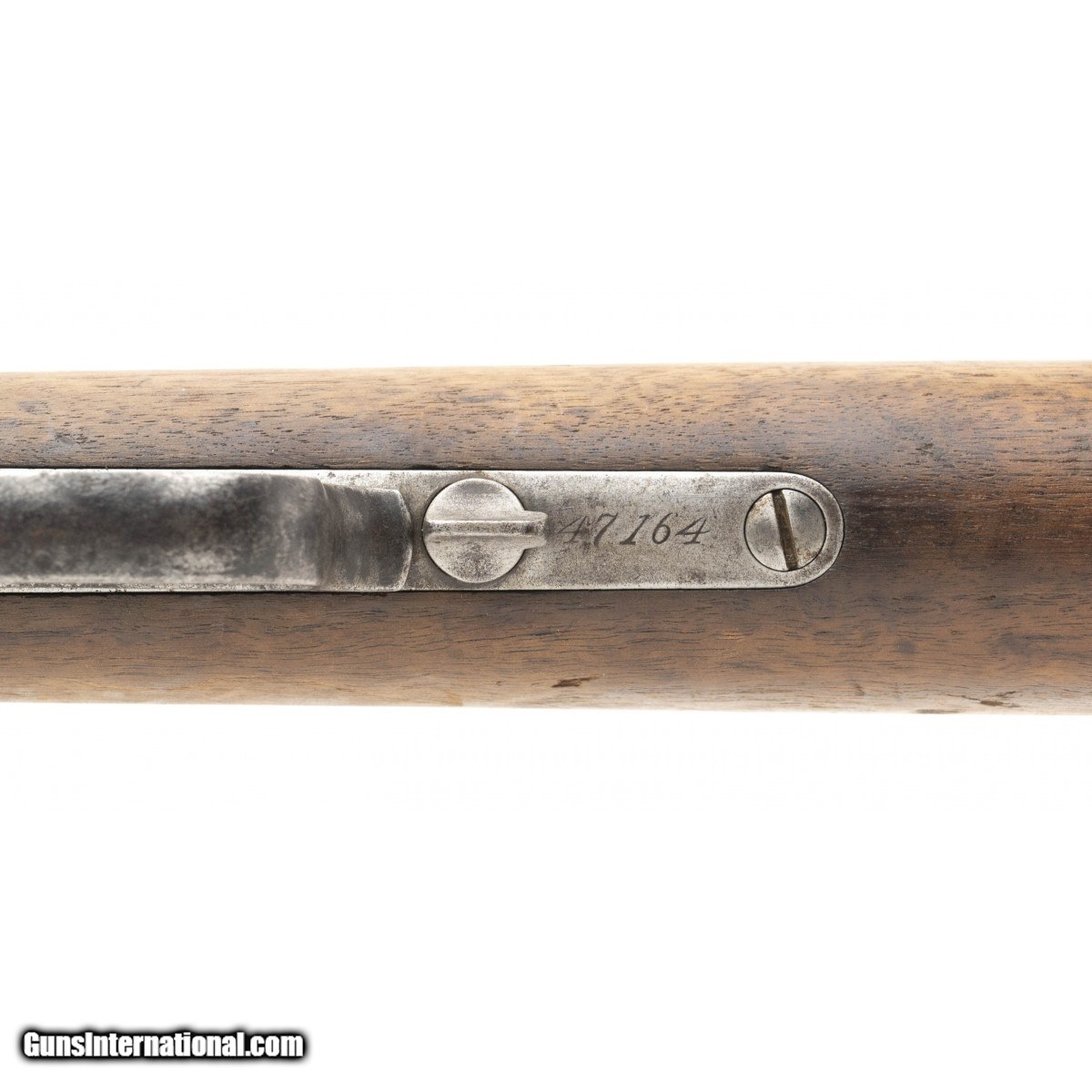 Description: "Serial Number 47164. Made in 1884. 45-60 caliber with a 28" barrel. This gun has a mottled gray patina with a spots of pitting. Wood has been refinished long ago. Action works. Dust cover is missing. Bore is dark with pitting and some visible rifling. SOLD Antique: Yes |
