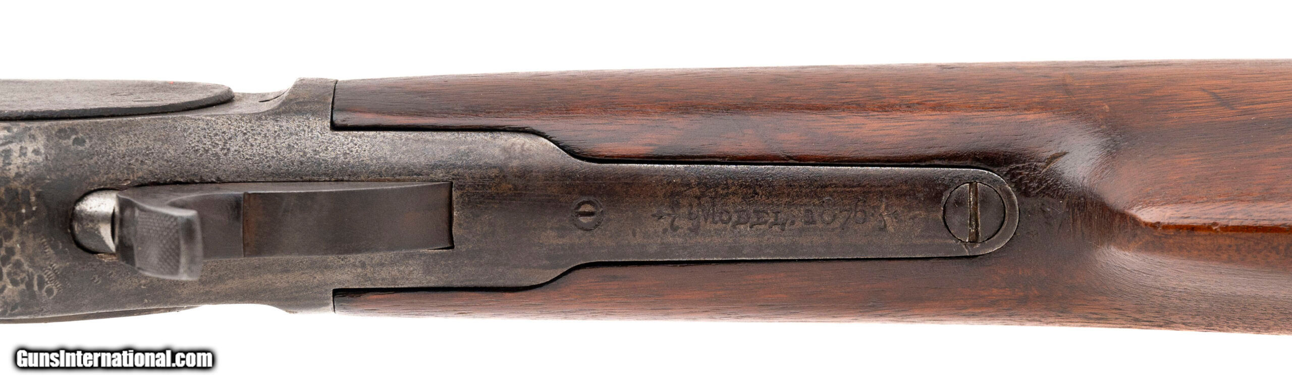 Description: "Serial number not legible. Made circa 1880s. 40-60 WCF caliber with a 28“ barrel. This gun has a mottled gray to brown patina with scattered pitting in areas. The wood has been refinished. SOLD Antique: Yes |