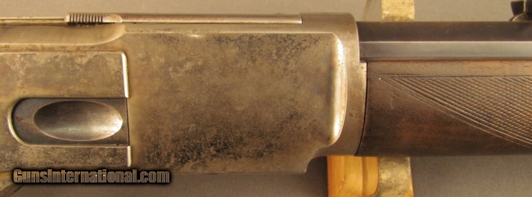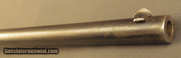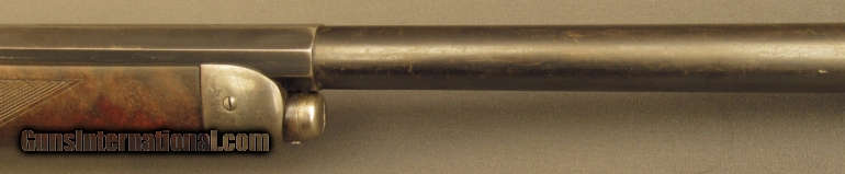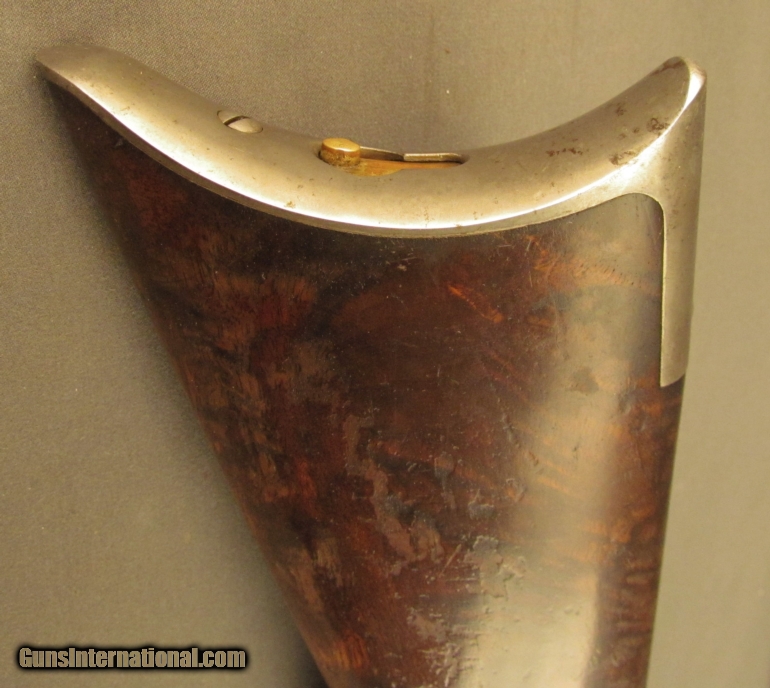 Description: S#32902 1/2, .45-60 Win, 26 3/4 inch half octagon barrel, bright, excellent bore. This lovely 1876 comes with a Cody zip sheet showing rifle, 45/60, 1/2 octagon, checkered stock, pistol grip, 1/2 magazine, and case hardened with 4-2-83 date in and 4-7-83 date shipped to order 3283. The rifle does show all five of these special order features. Lower tang is marked XX on side with assembly number that matches number stamped in top tang slot of buttstock. Rifle is built on a third model frame with integral rail for dust cover and second style tang marking with brackets. The buttplate is the second style with thin toe and brass trap for cleaning rod. The rod is not present. Barrel appears to be cut 1 1/4 inches 80% blue fading in areas with light scratches and marks. A deeply scratched impact mark shows on top about 8 inches from muzzle. Dustcover retains about 90% blue, loading gate shows 70% bright fire blue frame retains about 35% case colors, brightest under lever, still visible on 90% of frame. Wood is sound with a little added finish on butt, even wear on checkering and some marks from use. Pistol grip has a fancy ebony inlay. Rear sight is an early style flat top with step elevator, front sight is a Lyman bone bead sporting style. Rifle comes with a custom made leather sleeve style case with handles and double buckle design that fits this rifle perfectly including barrel length. This case shows many years service with holes worn at front edge of frame by cartridge lifter and leather fitted around lever and pistol grip. This case is in fair condition with split seams and some small tears. Unfortunately no maker's name shows on this case. This is a very fine special order 1876 with five special features in great condition. The barrel does appear to be shortened, but it happened long ago before the case was ordered. A super rifle for the advanced Winchester collector. Antique SOLD Antique: Yes Manufacturer: Winchester Model: 1876 Caliber Info: .45-60 Gauge Info: .45-60 |