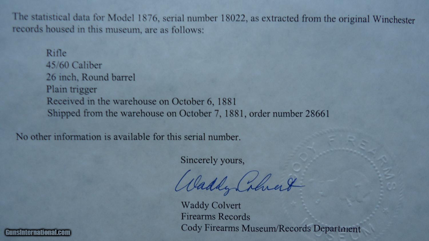 Description: This is basically a brown gun, except that Winchester only made 192 rifles with a 26" round barrel in 45-60 WCF caliber. The action is a little sluggish and the bore is a little rough, but this is a rare Winchester. Brown patina on the barrel and full length mag tube. Receiver is mostly brown with some original blue showing through. Wood matches the rest of the gun as far as condition goes with some scrapes and dings. Comes with factory letter. The gun has character. Leroy Merz Antique Firearms specializes in antique and vintage Winchesters and other fine American firearms. Since 1965 Mr. Merz has taken part in the world of firearms and has been a contributor to many well known reference books. Just recently we mailed the 126th edition of our privately-published catalog. We have hundreds of additional guns in every price range at our home online. Search for Merz Antiques in google. SOLD Antique: Yes |