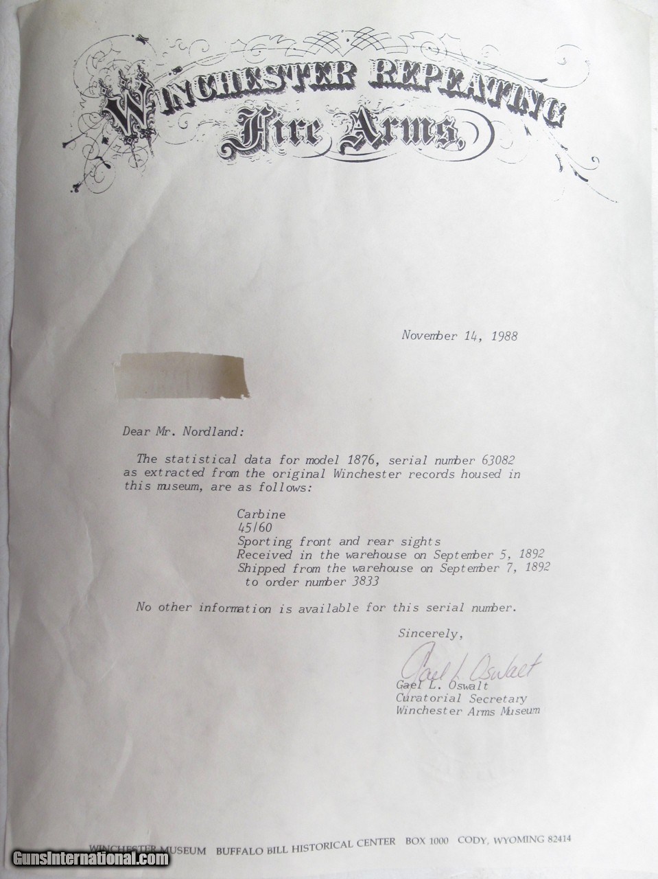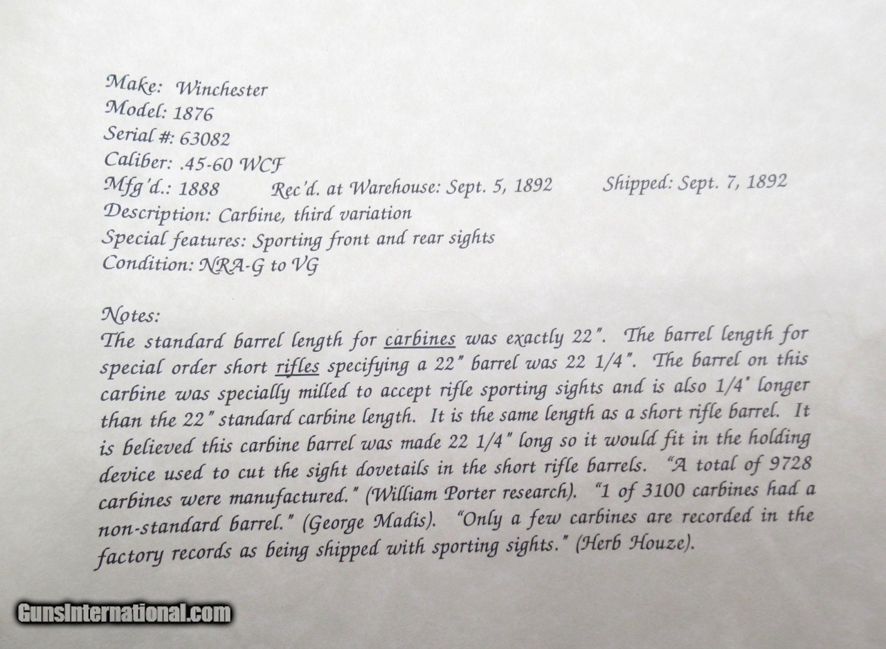 Description: Winchester Model 1876 Carbine; Serial No. 63082; Per Included Factory Letter: Carbine; 45/60 Caliber; Sporting Front and Rear Sights; Shipped September 7, 1892; Further Enclosed Documentation says Barrel Correctly Measures 22 ¼”; Possible Only 1 of 3 Shipped with Sporting Sights and a Non-Standard Barrel Length; 100% Original and Correct; Good Action and Bore; Metal Basically Blue/Grey Patina with Traces of Blue in Protected Areas; Solid Problem Free Original Wood; Very Rare 132 Year-Old Winchester Model 1876 Carbine; See All Photos for Condition; No Texts; Call (254)541-5765 or Email Only; PERSONAL PROPERTY of Harold Wieser; NOTICE: We Do Not Do Any Consignments - All Items Listed are Owned by Us - NO SALES to New Jersey or New York City - Antiques Only to Massachusetts and California; Price: $7,975 + $75 S&H Via USPS PRIORITY MAIL; Payment Address: Harold Wieser - 1466 U.S. Hwy 77 - Rosebud, TX 76570; SEND PAYMENTS VIA USPS PRIORITY MAIL; BEWARE of SCAMS!!! – DO NOT SEND MONEY or CORRESPONDENTS ELECTRONICALLY UNLESS YOU HAVE SPOKEN to HAROLD WIESER FIRST! 254-541-5765 SOLD Antique: Yes Manufacturer: Winchester Model: 1876 Carbine Serial Number: 63082 |