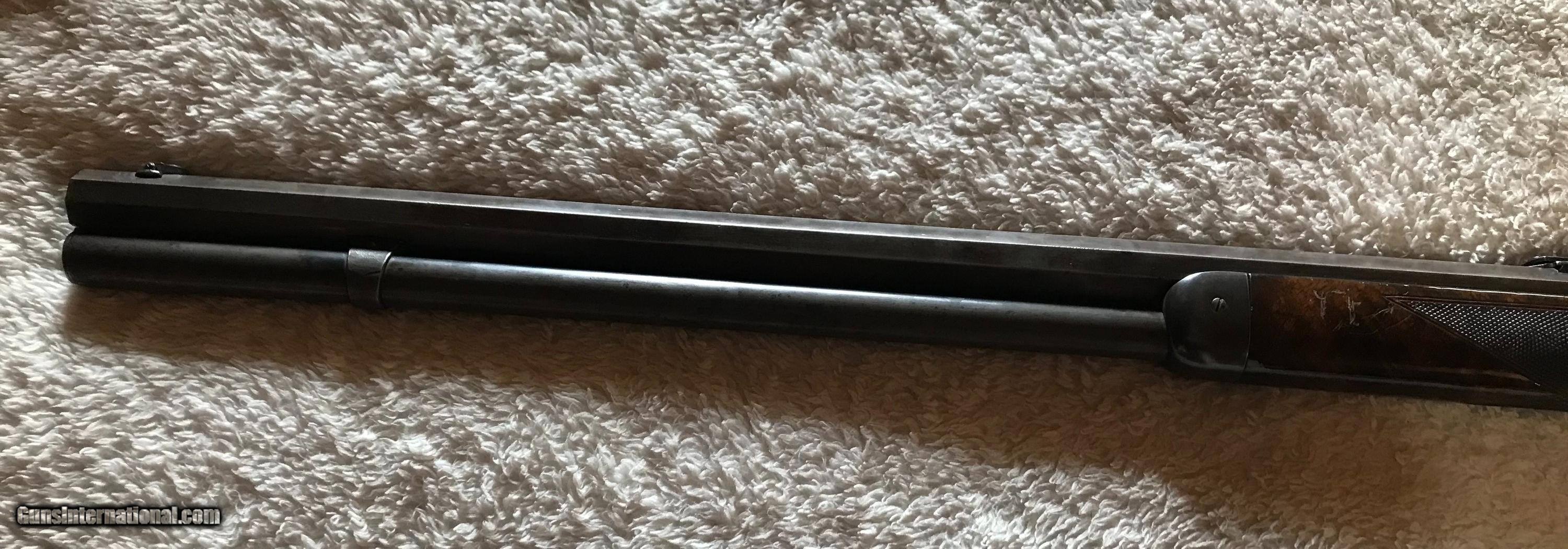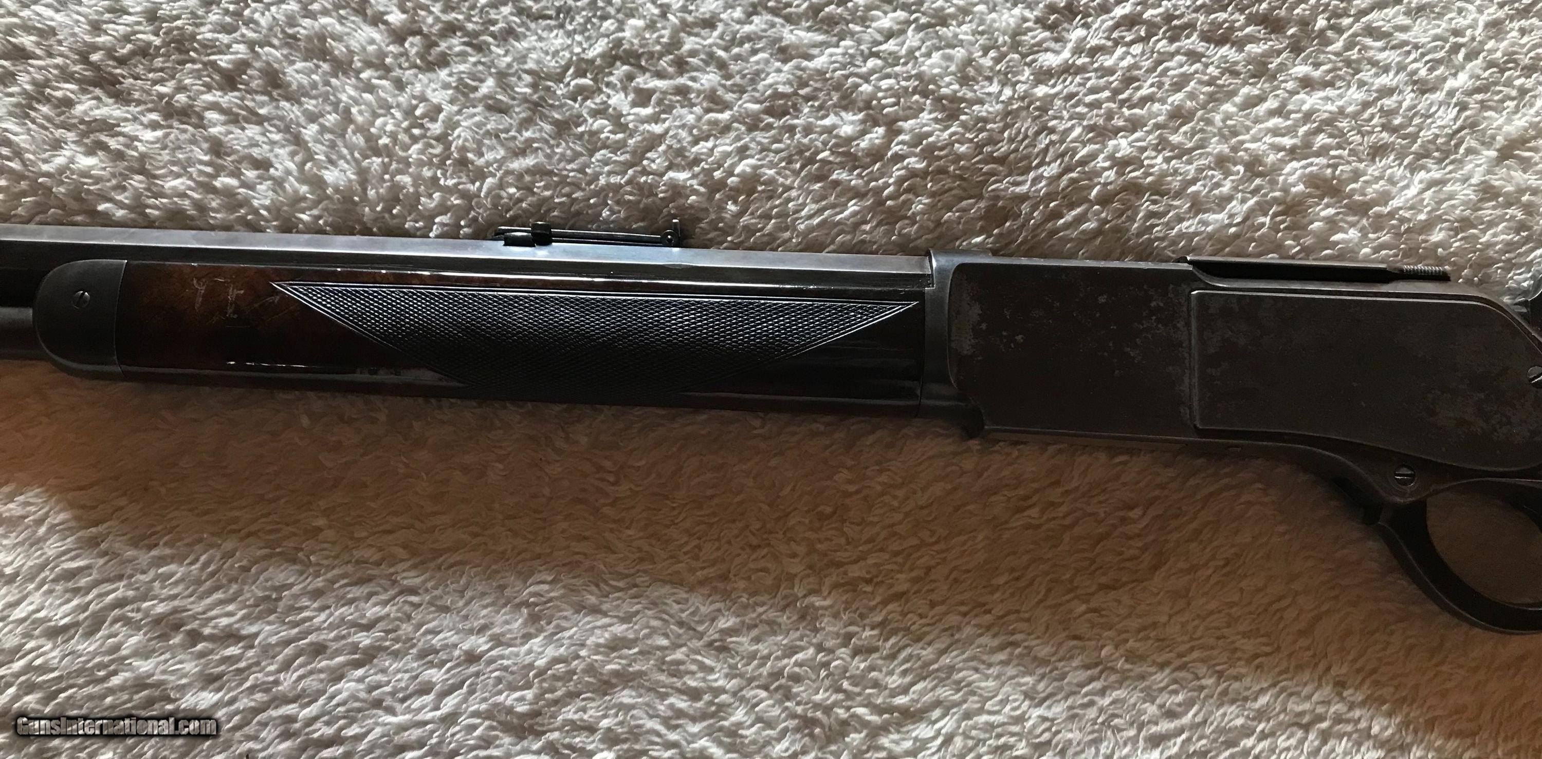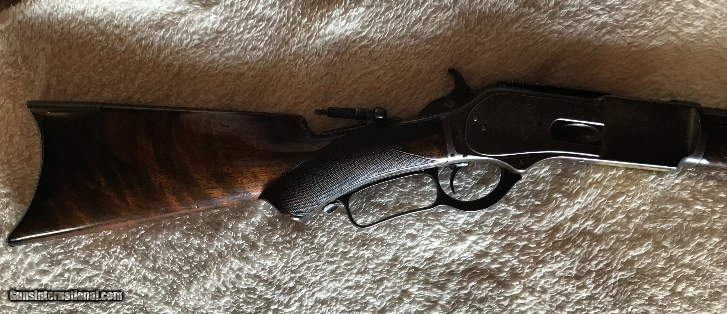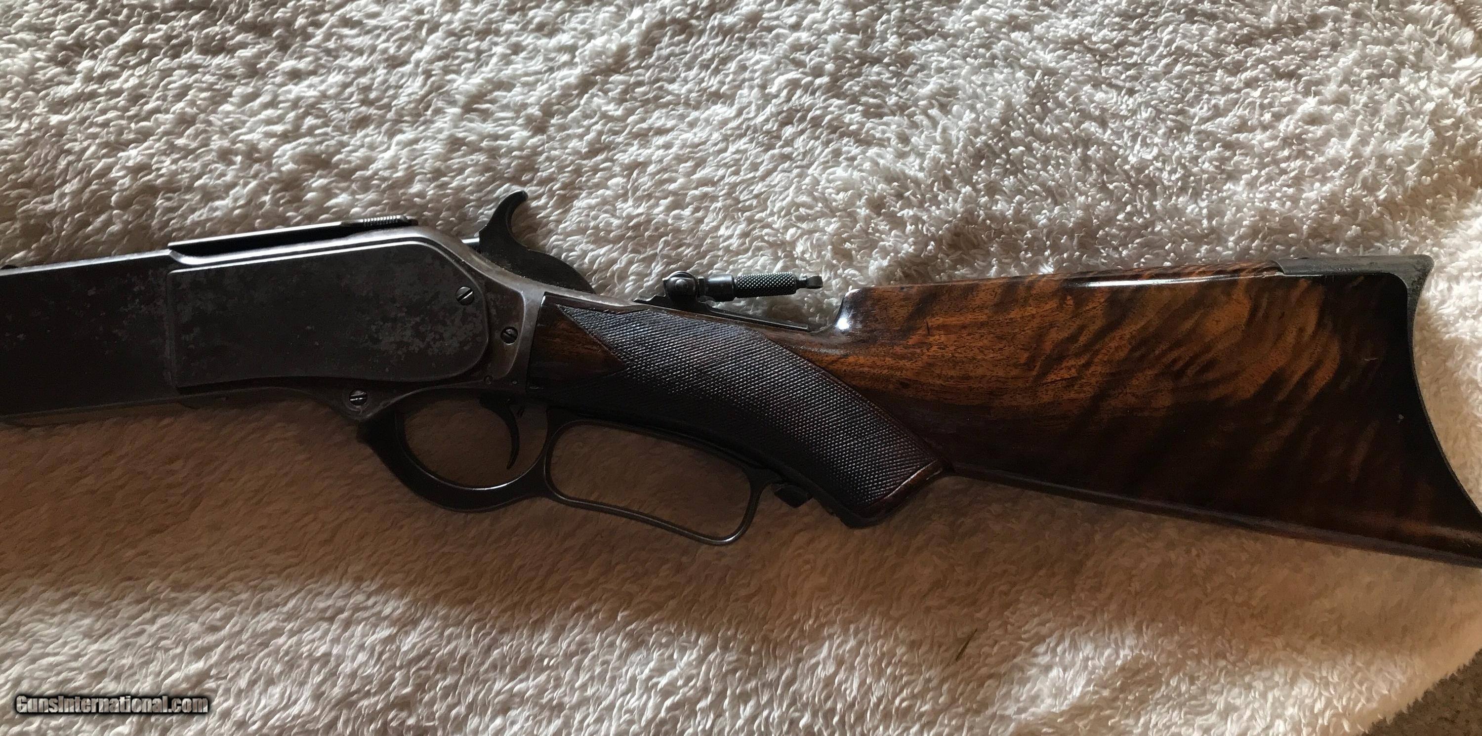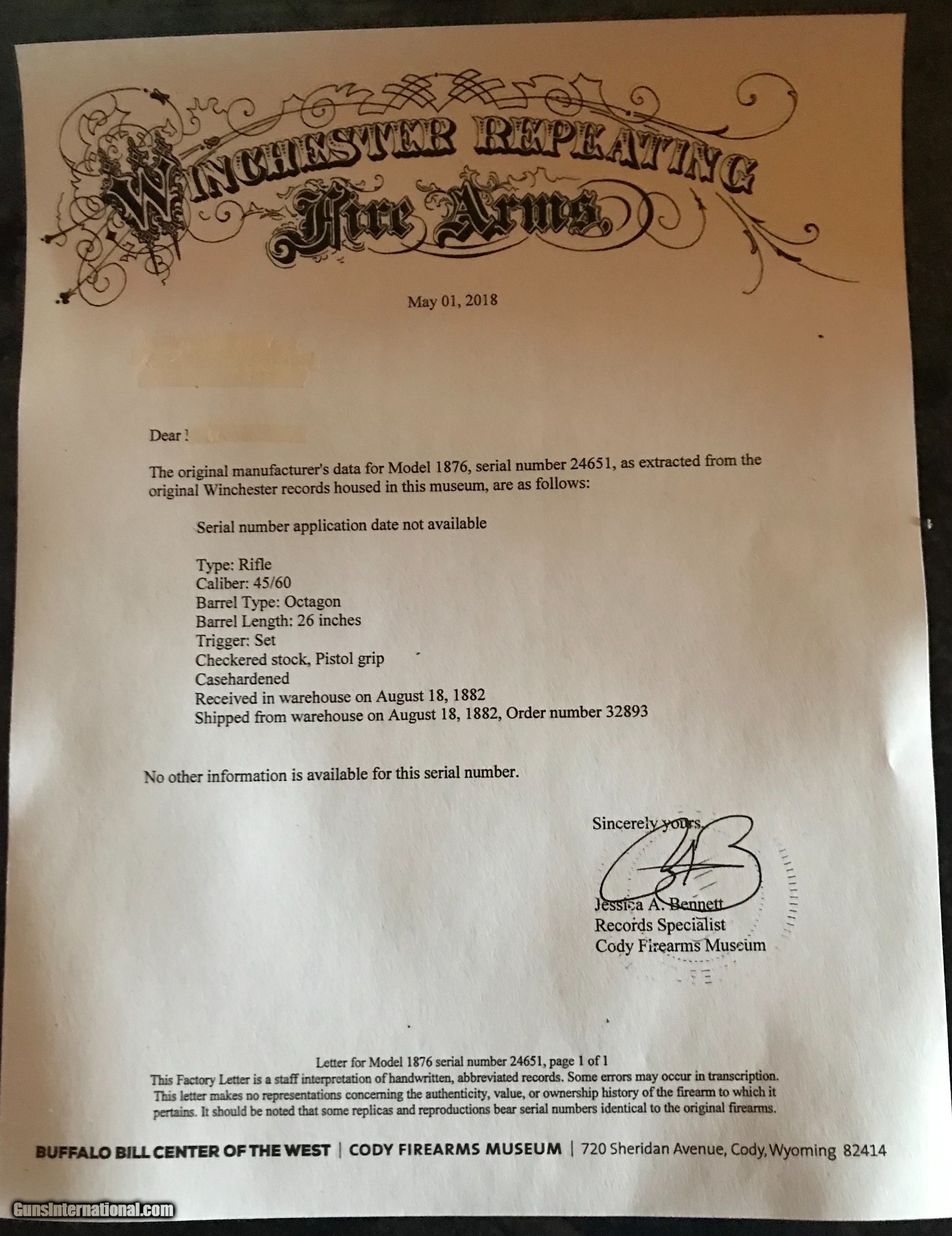 Description: Winchester model 1876 45/60 deluxe short barrell serial # 24651, dark bore, deluxe wood, finish patina and Cody letter, very good condition. Madis Winchester Hand Book states there were 79 with shorter than standard barrells. This would make a great addition to any ones collection. SOLD Antique: Yes Rifle Caliber: .45-60 Winchester Manufacturer: Winchester Model: 1876 |