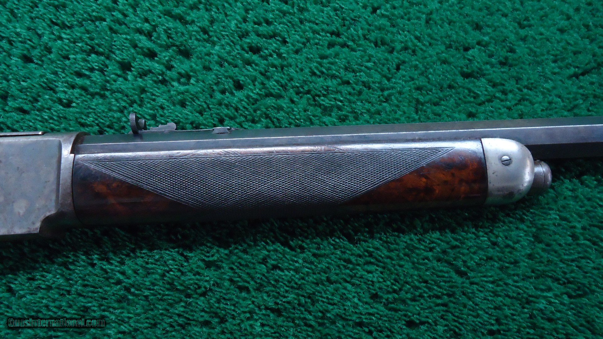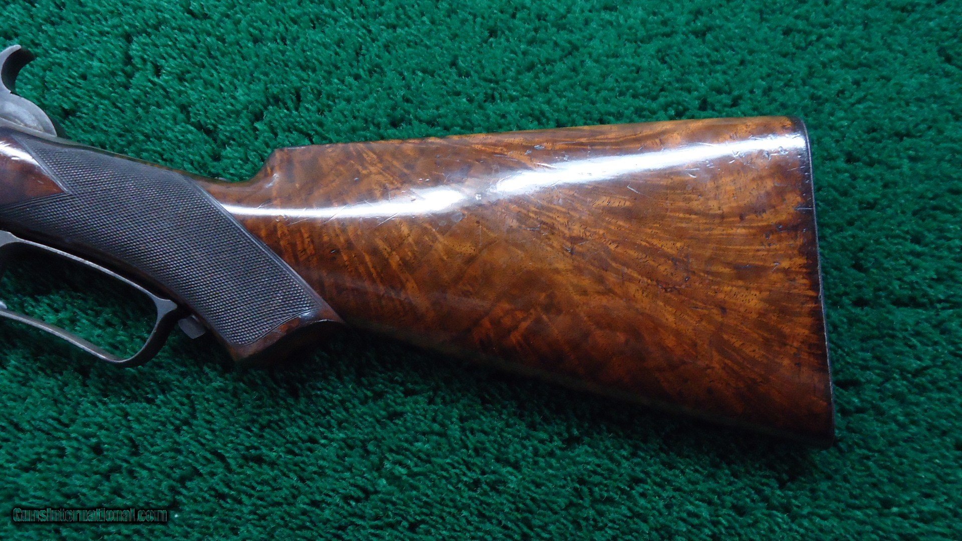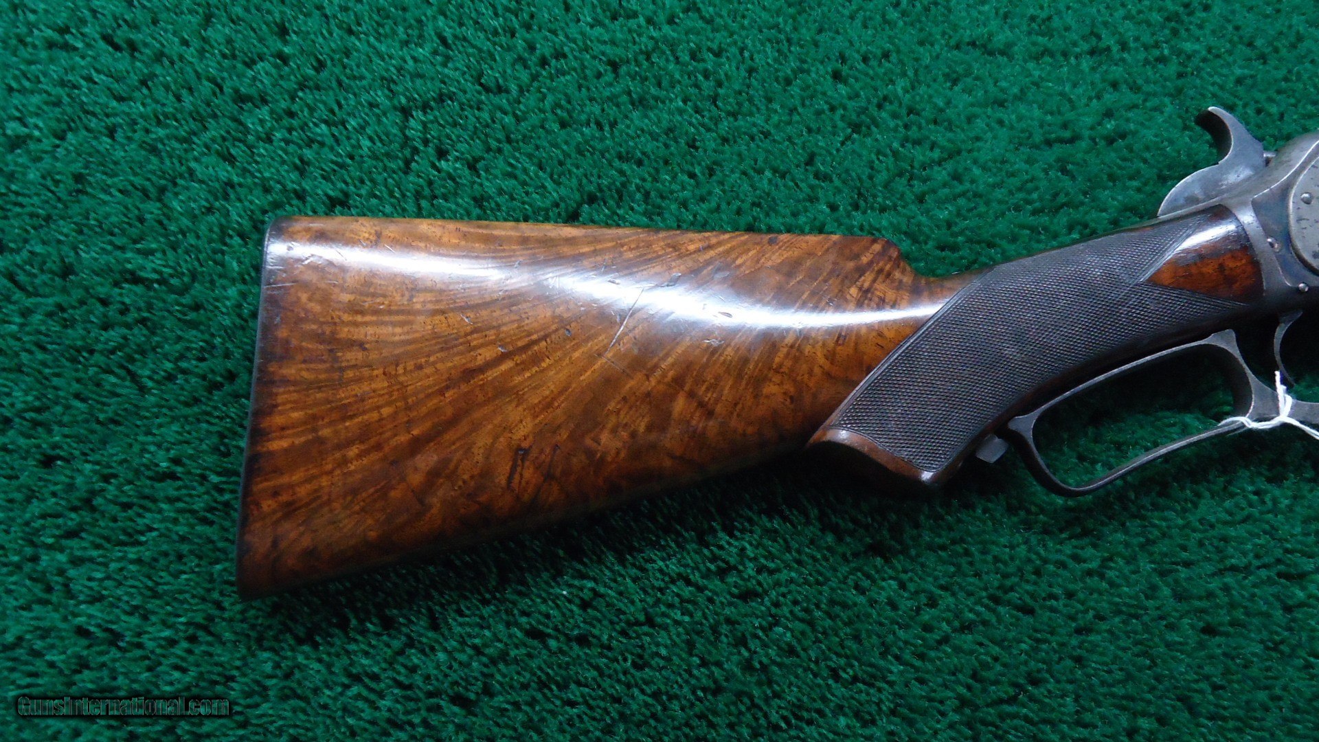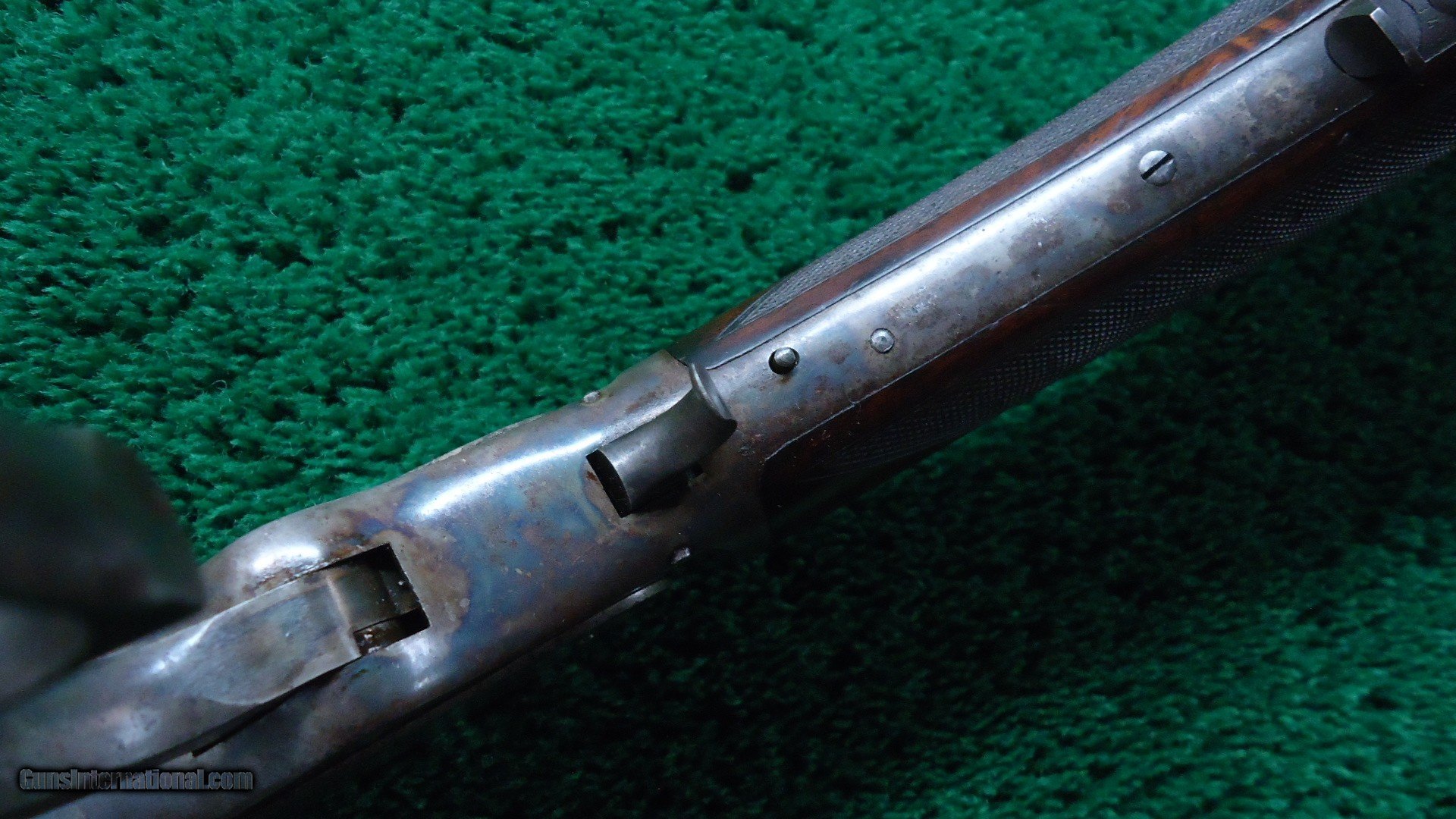 Description: 22 inch octagon barrel chambered in 50-95 (Express) caliber with a very good bore. Sights include a nickel-silver blade front and a sporting rear with checkered edges. About 30% original barrel blue with the balance a plum/blue. Good markings. Special order half magazine and shotgun butt are not mentioned on the factory letter. The 22 inch barrel length is not mentioned either but it does have the shorter than standard forearm that would be correct for this length barrel. Casehardened receiver has faded slightly but retains strong case colors in the protected areas with some discoloration and light pitting. Hammer and lever have good amounts of color as well while the forend cap has traces of color. Forearm and pistol grip stock are fancy grain walnut with "Style H" checkering and a high polish "piano" finish. Stock and forearm are both in fine condition overall with sharp checkering and most of the high polish piano finish is intact. The stock and forearm have some minor handling marks. The pistol grip has an ebony inlay. Shotgun buttplate has a dark patina with some light pitting. Nice functioning action. There were only 61 of the 22 inch octagon barrels made in this caliber. This scarce and desirable Winchester Model 1876 deluxe .50 Express rifle was made in 1883 and comes with a factory letter. Leroy Merz Antique Firearms specializes in antique and vintage Winchesters and other fine American firearms. Since 1965 Mr. Merz has taken part in the world of firearms and has been a contributor to many well known reference books. We have hundreds of additional guns in every price range at our home online. Search for Merz Antiques in google. SOLD Antique: Yes Rifle Caliber: .50-95 Winchester |