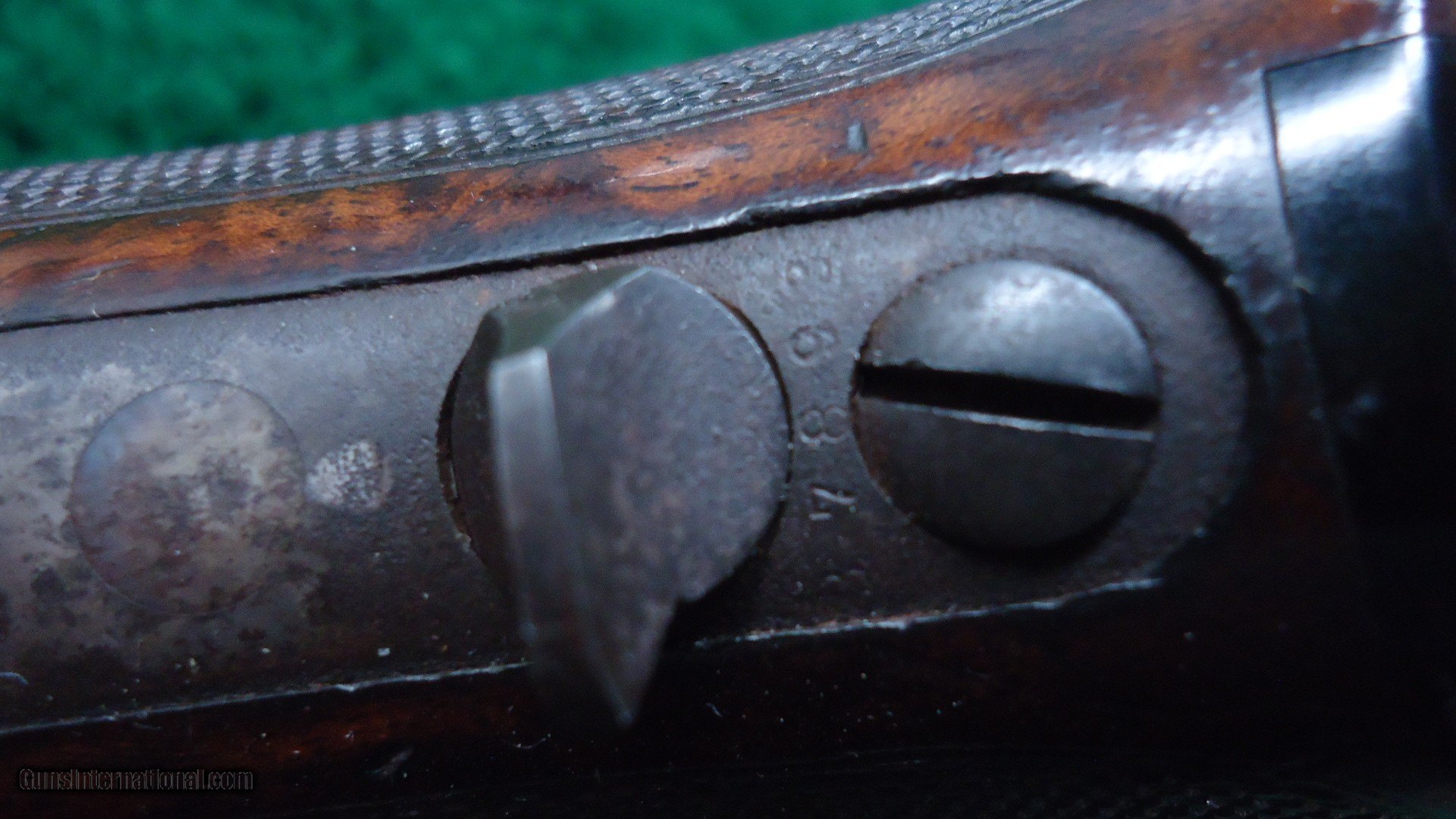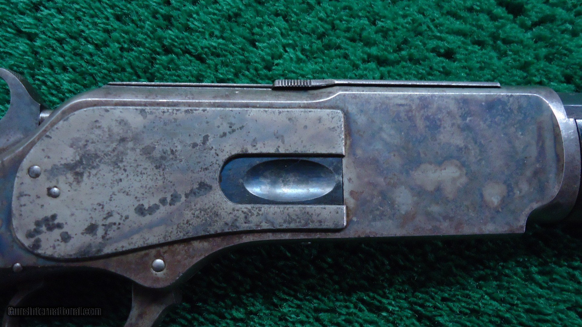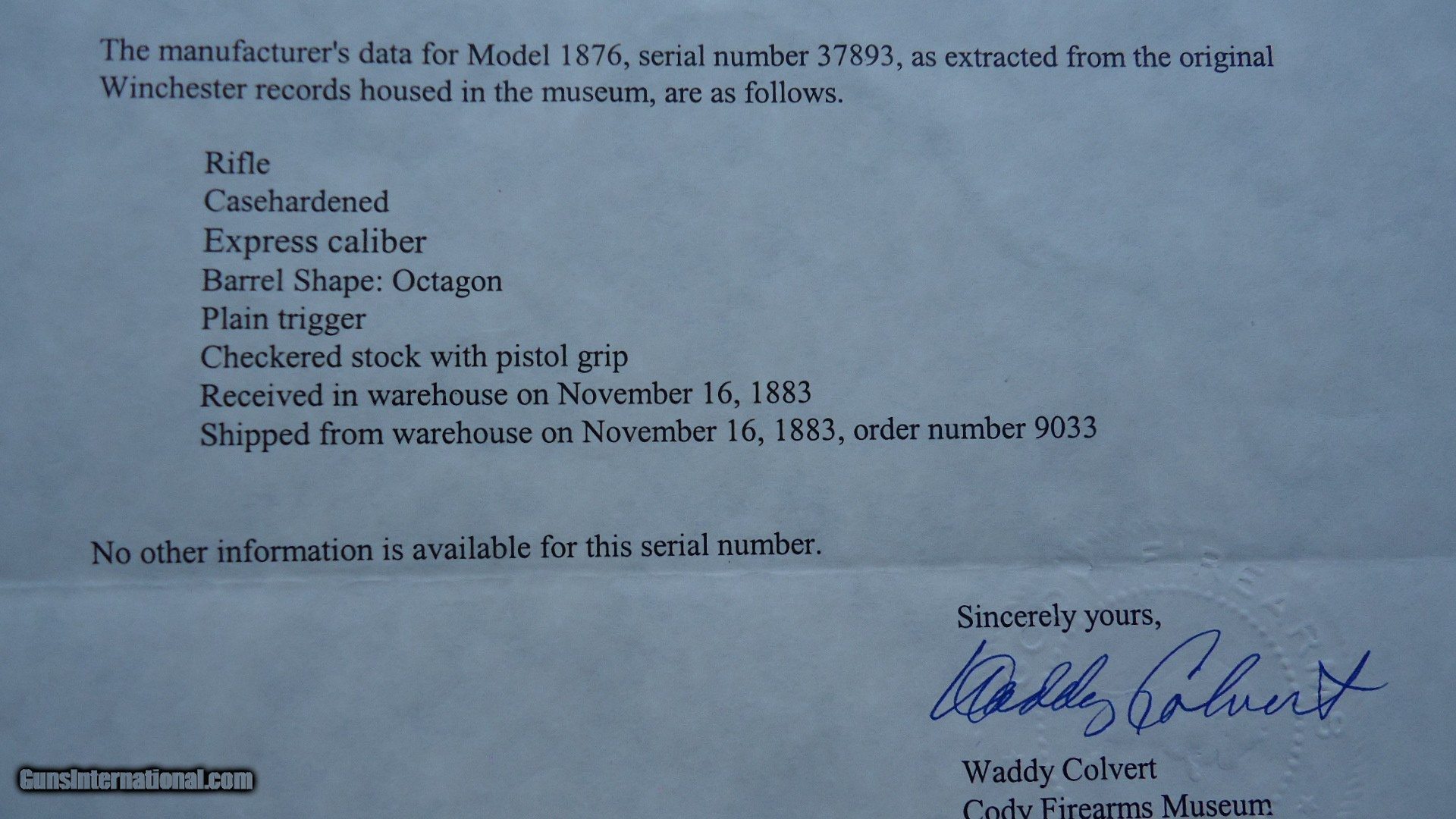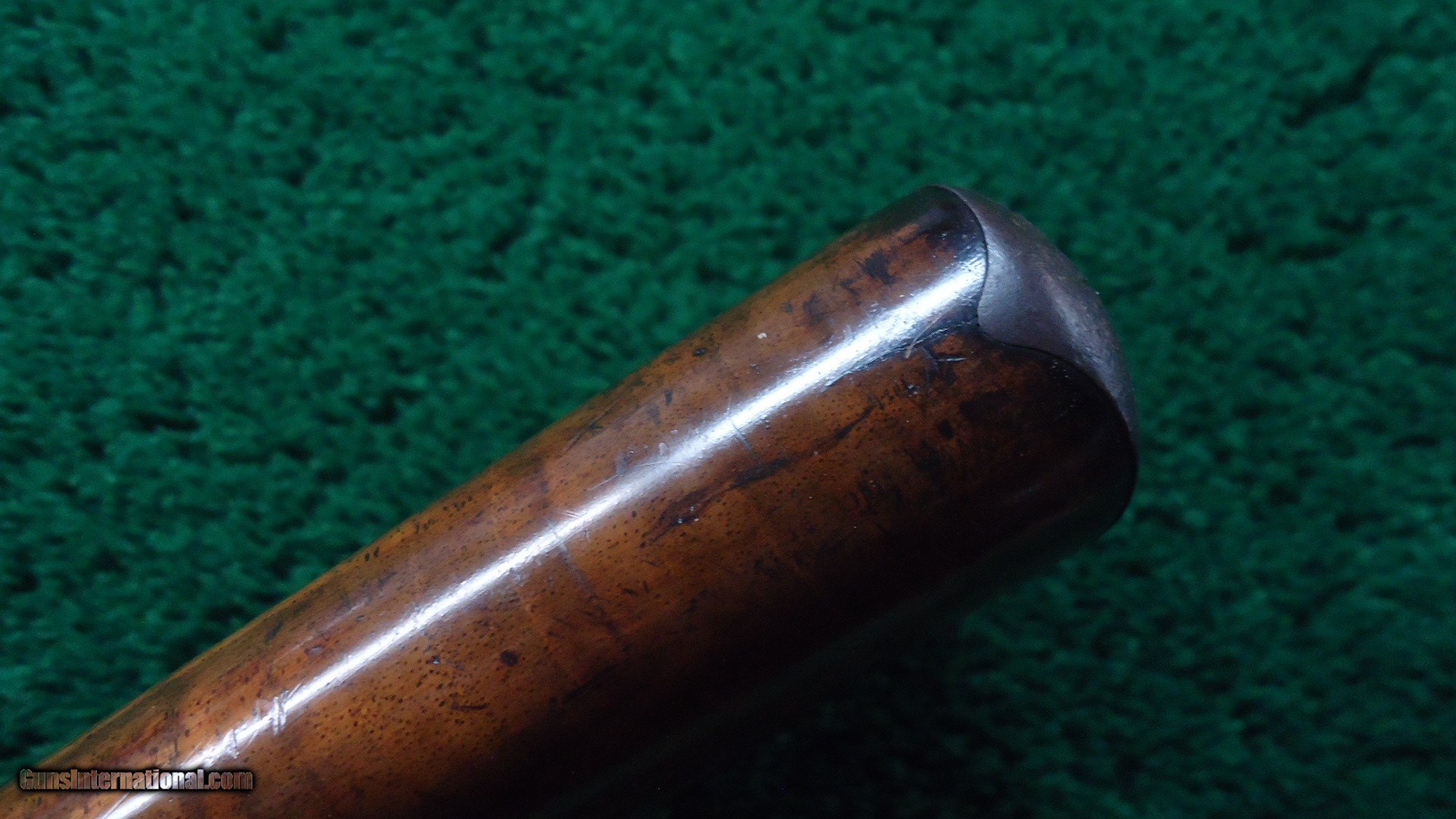 Description: 22 inch octagon barrel chambered in 50-95 (Express) caliber with a very good bore. Sights include a nickel-silver blade front and a sporting rear with checkered edges. About 30% original barrel blue with the balance a plum/blue. Good markings. Special order half magazine and shotgun butt are not mentioned on the factory letter. The 22 inch barrel length is not mentioned either but it does have the shorter than standard forearm that would be correct for this length barrel. Casehardened receiver has faded slightly but retains strong case colors in the protected areas with some discoloration and light pitting. Hammer and lever have good amounts of color as well while the forend cap has traces of color. Forearm and pistol grip stock are fancy grain walnut with "Style H" checkering and a high polish "piano" finish. Stock and forearm are both in fine condition overall with sharp checkering and most of the high polish piano finish is intact. The stock and forearm have some minor handling marks. The pistol grip has an ebony inlay. Shotgun buttplate has a dark patina with some light pitting. Nice functioning action. There were only 61 of the 22 inch octagon barrels made in this caliber. This scarce and desirable Winchester Model 1876 deluxe .50 Express rifle was made in 1883 and comes with a factory letter. Leroy Merz Antique Firearms specializes in antique and vintage Winchesters and other fine American firearms. Since 1965 Mr. Merz has taken part in the world of firearms and has been a contributor to many well known reference books. We have hundreds of additional guns in every price range at our home online. Search for Merz Antiques in google. SOLD Antique: Yes Rifle Caliber: .50-95 Winchester |
