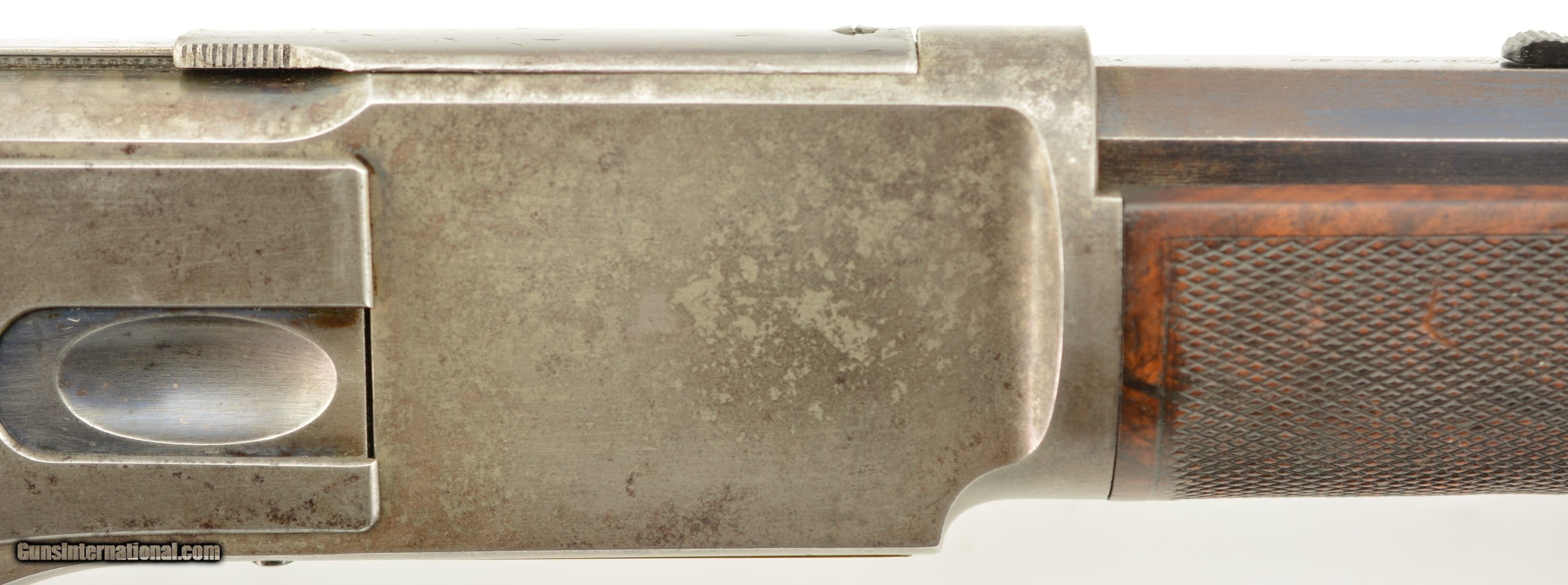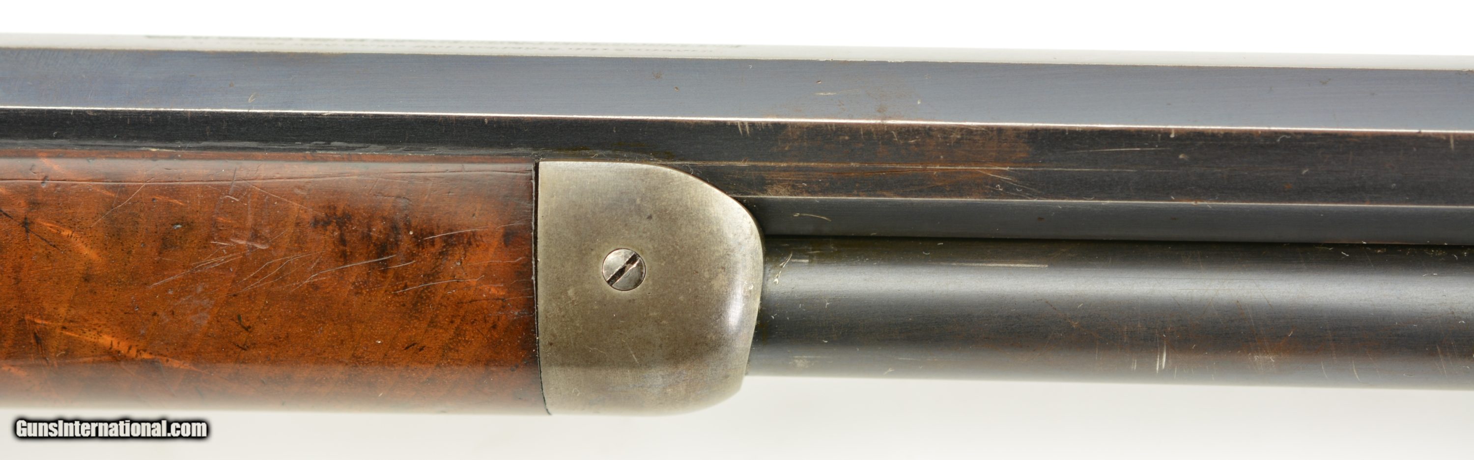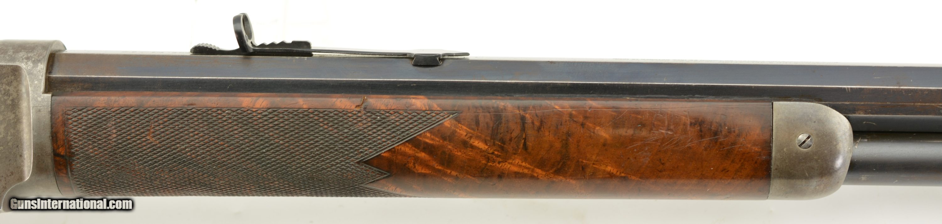 Description: Serial #13089, .45-60, 26" octagon barrel with an excellent, bright bore. This is an 1880-made, 2nd Model that has retained 90-92% of the original blue finish along the barrel and replaced magazine tube, with some silvering at the muzzle, as well as along the edges of the barrel facets. Some of the original color case-hardening remains on protected areas of the frame, with the balance having turned to a mottled pewter gray patina. Further original color case-hardening can still be seen on the hammer and lever, and the brass cartridge lifter has toned to a pleasant, yellow-ochre patina. The checkered walnut forend and pistol-grip have beautifully figured, exhibition grade walnut that has numerous small scratches and handling marks spread throughout the original piano varnish finish. The steel shotgun buttplate has a mostly bright patina, with scattered spots of dark freckling as well. The rifle has a sporting type front sight blade, full buckhorn rear sight, and the action is tight, and fully functional. This rifle was sourced in Colorado and was part of a very old collection owned by a WInchester Dealer from the 1920s. A 2022 Cody Data Sheet accompanies the rifle and lists a shipping date of November 18, 1880. The sheet confirms the configuration, with the exception of the magazine tube, which was a half-magazine when the rifle left the factory originally and now has been extended to a full mag. This is a very nice, honest use gun that is in fine condition, and would make a great addition to any collection. Antique SOLD Antique: Yes Manufacturer: Winchester Model: 1876 Caliber Info: .45-60 Gauge Info: .45-60 |