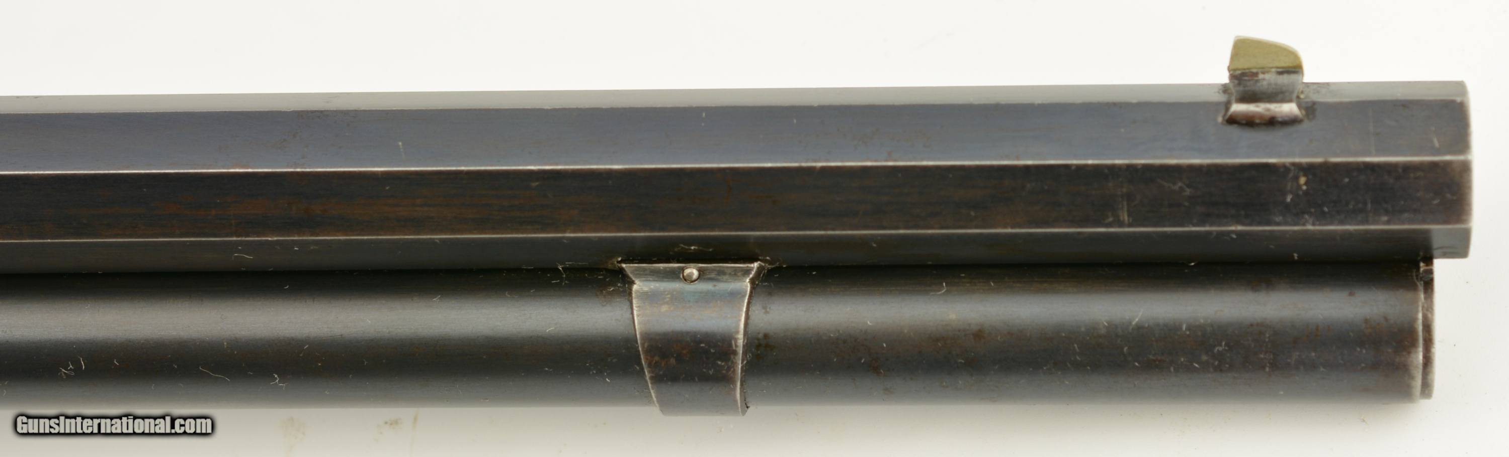 Description: Serial #13089, .45-60, 26" octagon barrel with an excellent, bright bore. This is an 1880-made, 2nd Model that has retained 90-92% of the original blue finish along the barrel and replaced magazine tube, with some silvering at the muzzle, as well as along the edges of the barrel facets. Some of the original color case-hardening remains on protected areas of the frame, with the balance having turned to a mottled pewter gray patina. Further original color case-hardening can still be seen on the hammer and lever, and the brass cartridge lifter has toned to a pleasant, yellow-ochre patina. The checkered walnut forend and pistol-grip have beautifully figured, exhibition grade walnut that has numerous small scratches and handling marks spread throughout the original piano varnish finish. The steel shotgun buttplate has a mostly bright patina, with scattered spots of dark freckling as well. The rifle has a sporting type front sight blade, full buckhorn rear sight, and the action is tight, and fully functional. This rifle was sourced in Colorado and was part of a very old collection owned by a WInchester Dealer from the 1920s. A 2022 Cody Data Sheet accompanies the rifle and lists a shipping date of November 18, 1880. The sheet confirms the configuration, with the exception of the magazine tube, which was a half-magazine when the rifle left the factory originally and now has been extended to a full mag. This is a very nice, honest use gun that is in fine condition, and would make a great addition to any collection. Antique SOLD Antique: Yes Manufacturer: Winchester Model: 1876 Caliber Info: .45-60 Gauge Info: .45-60 |
