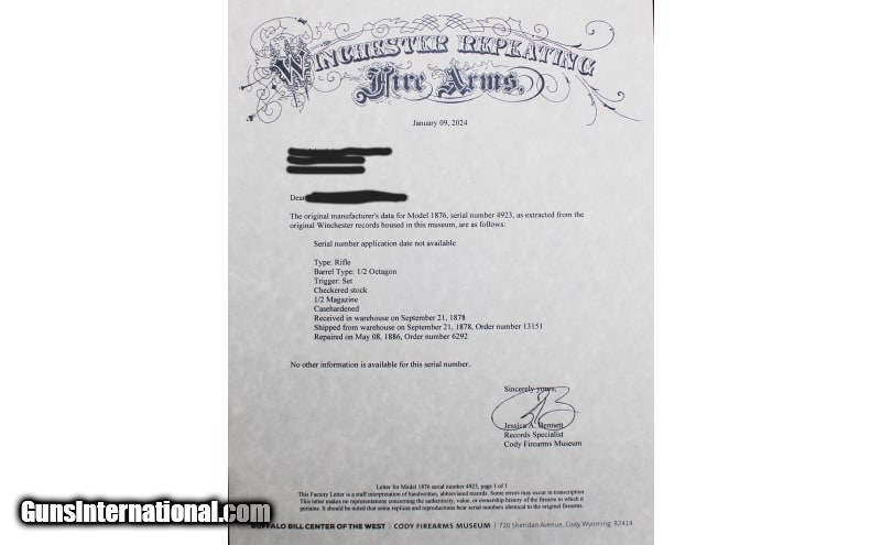 Description: Winchester Special Order Deluxe Model 1876 rifle chambered in .45-75 Winchester Centennial. Features include a 28-inch half-octagonal barrel with half magazine along with a color casehardened receiver. Professionally refinished at some point in its long life. The serial number (4923) dates the rifle to 1878. Comes with a Winchester factory letter indicating that it was shipped on 21 September 1878. .45-75 Winchester SOLD Antique: Yes Metal Condition: Professionally Restored Very Good with Minor Handling Marks Wood Condition: Refinished Very Good with Minor Handling Marks Bore Condition: Slight Darkening with Light Pitting Barrels: 28 inch Half-Octagonal Triggers: Factory Set Trigger Butt Pad: Steel Crescent Item Location: Fort Worth, TX |