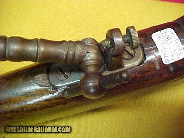 Description: #4759 Winchester 1885 “Hi-Wall”. 30”x38-55 with No.3 octagon barrel, serial range 30XXX so manufactured in 1889. It is fitted with an after market palm rest, standard trigger, standard barrel sights (Rocky Mountain front, low buckhorn sporting rear), and straight grip. The bore is about a 7-1/2 to 8 on a scale of 10 (VG++/fine) and the action is tight and solid. The exterior has a soft plum blue over most of the metal surface with just some very light freckle pitting on the receiver. It also looks like the barrel finish is the original blue, but the frame has been fogged over with a thinning reblue, which would be incorrect since this era of the Hi-Wall should be case-hardened, not blued. The wood is VG+ with the one exception that the palm rest mounting inlet could’ve been done a little better and the palm rest itself is a non-folding style. Other than that it has no mentionable deficits. Overall, a decent Hi-Wall in a very popular caliber. VG+ $2350 SOLD Antique: Yes |