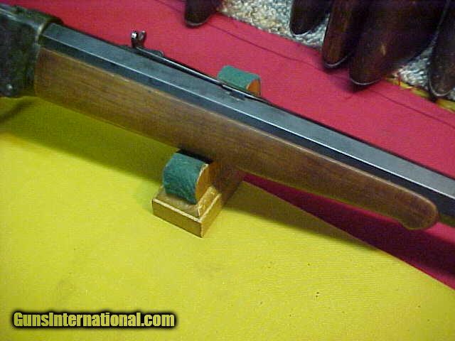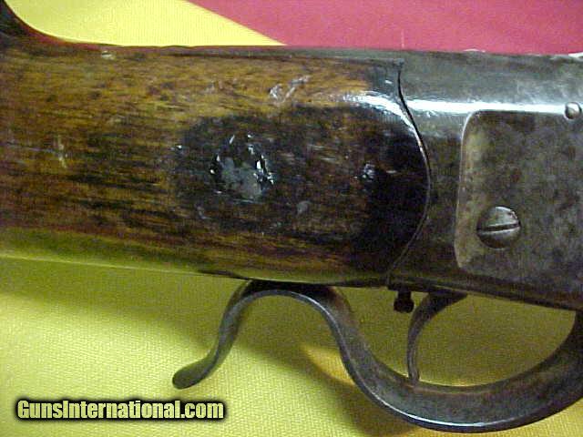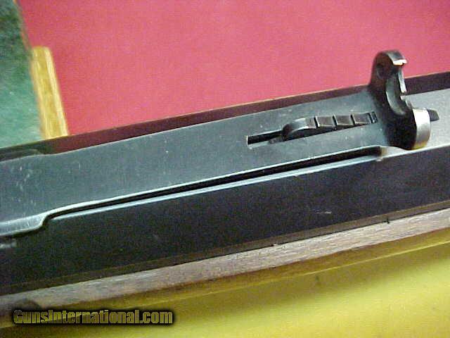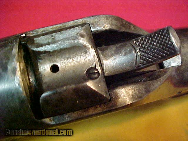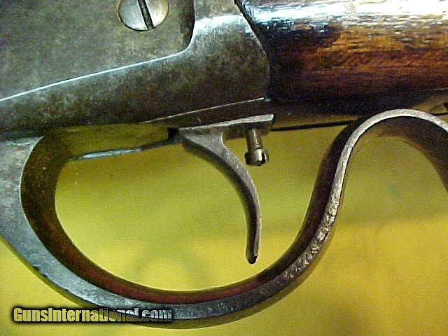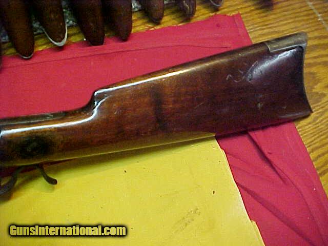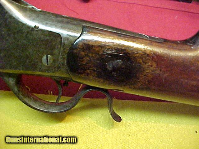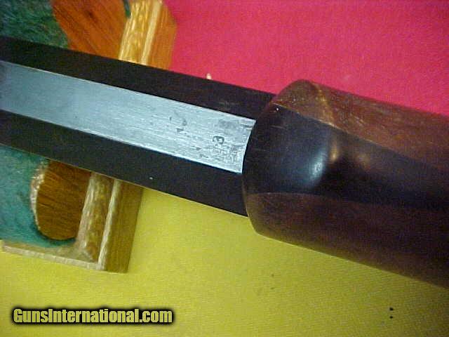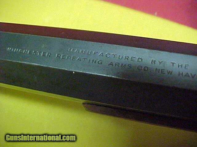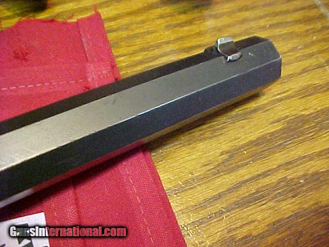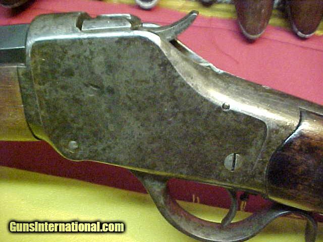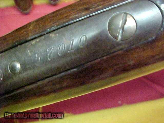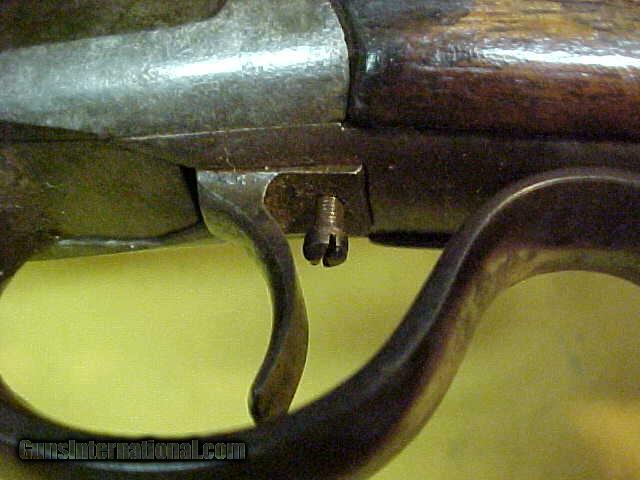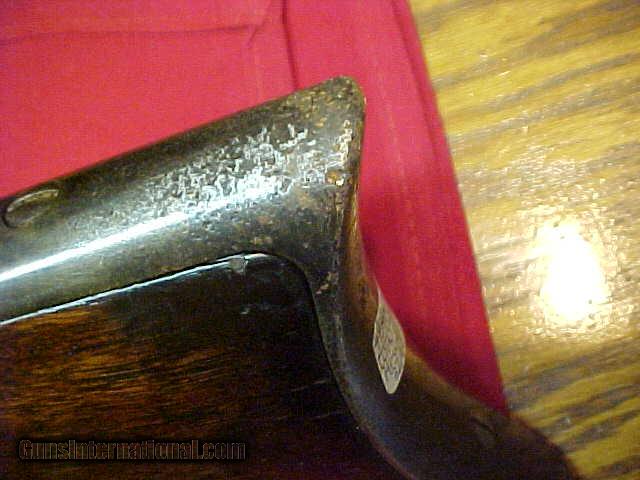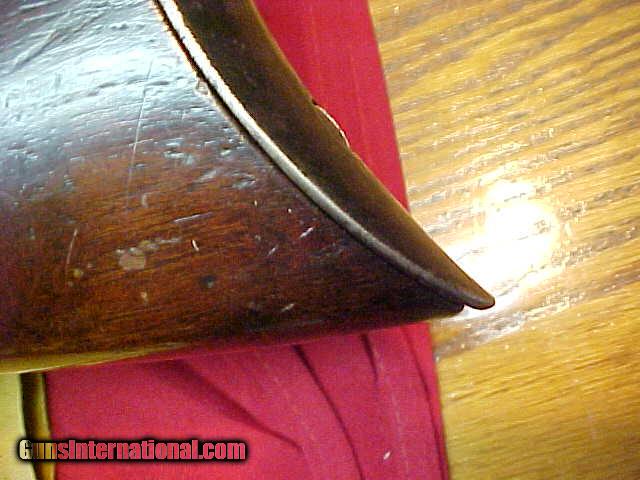 Description: #4934 Winchester 1885 Hi-Wall 30”xNo.3x32/40 Sporting Rifle, SST, 57XXX range (c1892). Bore is very fine plus (about a “9” on a scale of 10) and looks like it would be VERY accurate. The barrel retains about 90%+ coverage of an 80-90% density blue and there are FAINT traces of faded cloudy case colors left in the reciever …most of which does not show well in the photos below. Unfortunately, it also has some nicks and dings to the right side of the frame (see photos) and some deep pitting on the heel of the buttplate. The forearm is fine and shows no wear, dings, or bruises ….but the buttstock has a repair at the wrist. It has a single-set trigger, but needs to be adjusted to be used as a set trigger. Common semi-buckhorn standard sporting rear sight; front sight is the pinched blade open sight. Overall, a much better than average conditioned Hi-Wall (except for the butt repair) in a very popular and extremely accurate target shooters caliber …and also having the very desirable single-set trigger. Except for the bumps and dings on the receiver, the buttplate pitting, and the repair to the wrist, this would easily be about a Fine-Ex.Fine Winchester. $2375 SOLD Antique: Yes |