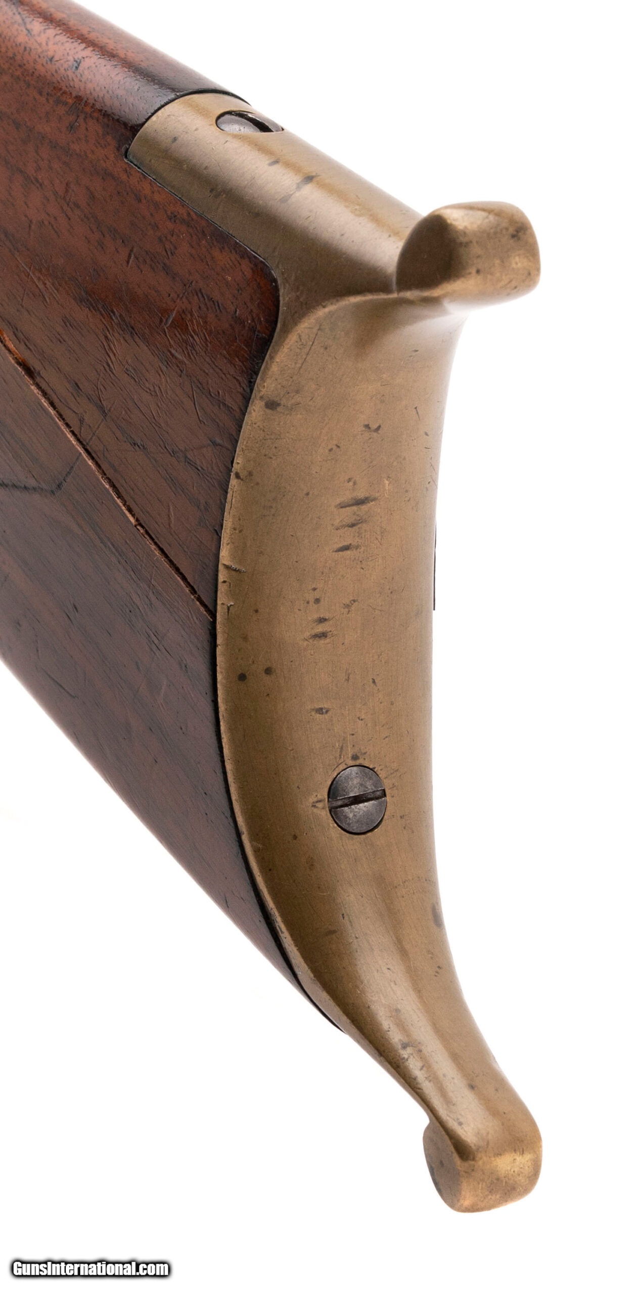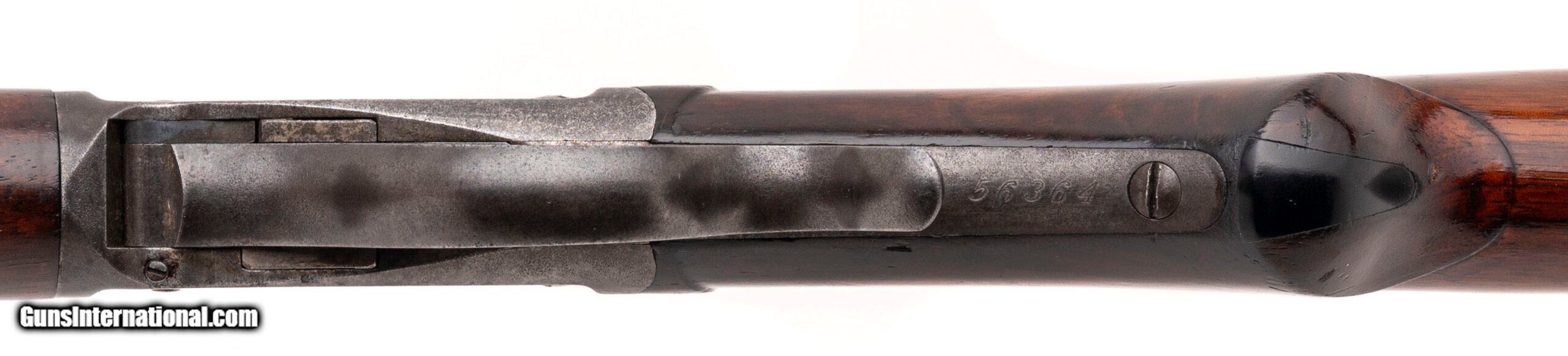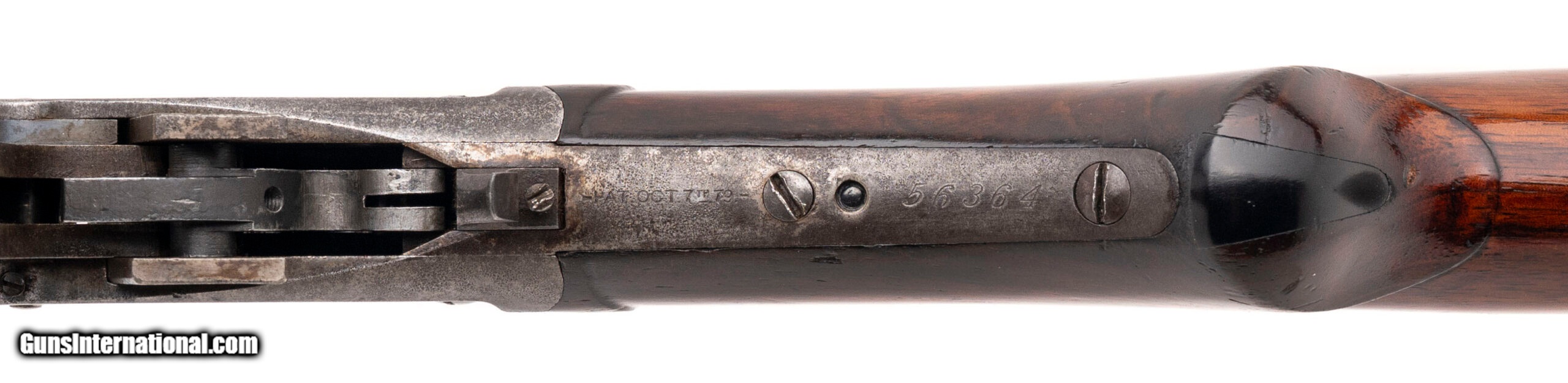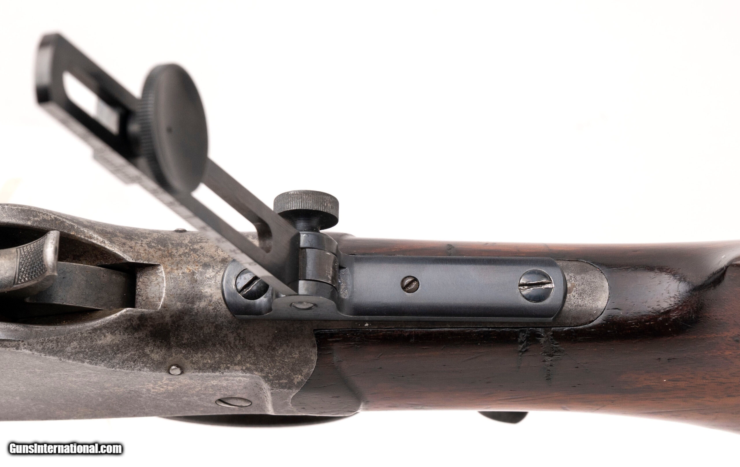 Description: "Serial number 56364. Made in 1892. 25-20 SS with a 28" barrel. The barrel has a dark brown splotchy patina. The frame has a silvery colored patina. The butt stock is a well made replacement with a Schuetzen butt plate. The sights are modern replacement. SOLD Antique: Yes |