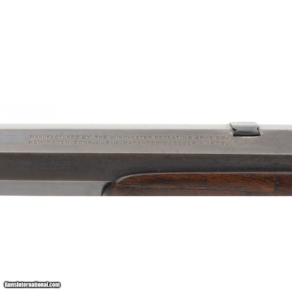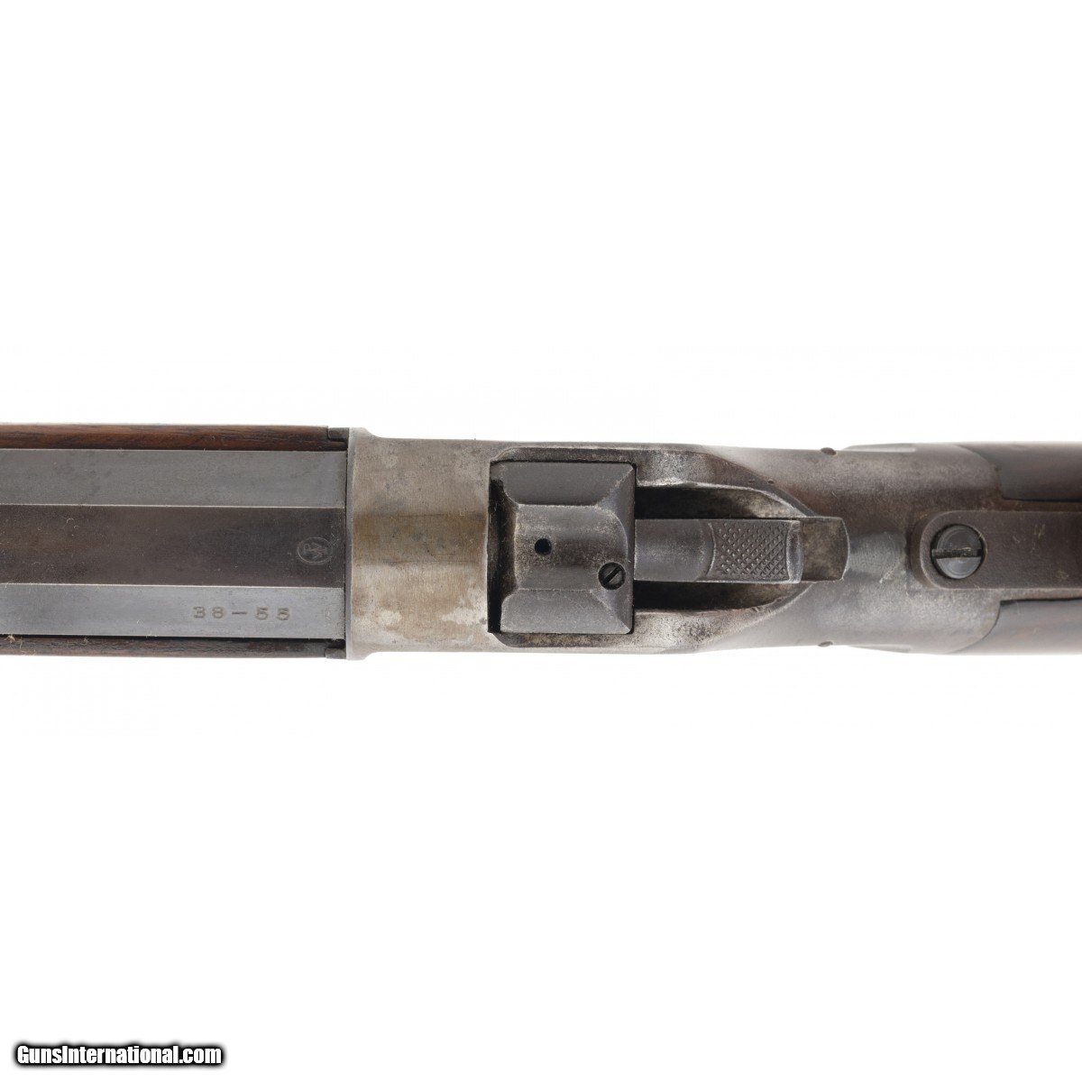 This .38-55 caliber Winchester High Wall Model 1885 single shot rifle was manufactured in approximately 1890. It has a No. 3 weight 32"" octagon barrel. The bore is excellent with bright perfect rifling. It has an extra filled dovetail in front of the rear sight. The trigger is standard Winchester with safety and full cock. The barrel has approx. 90-95% blue. The Winchester markings are sharp and clear. The rear tang sight is modern but has the adjustable features. The front sight is Rocky Mountain style and is also modern. The forend has had a crack repair which is very well done. The stock toe has an old chip repair. The receiver was probably case colored and has lost its colors. It has a blue-gray patina. This Model 1885 High Wall single shot Winchester rifle is very good overall and is in a desirable caliber.