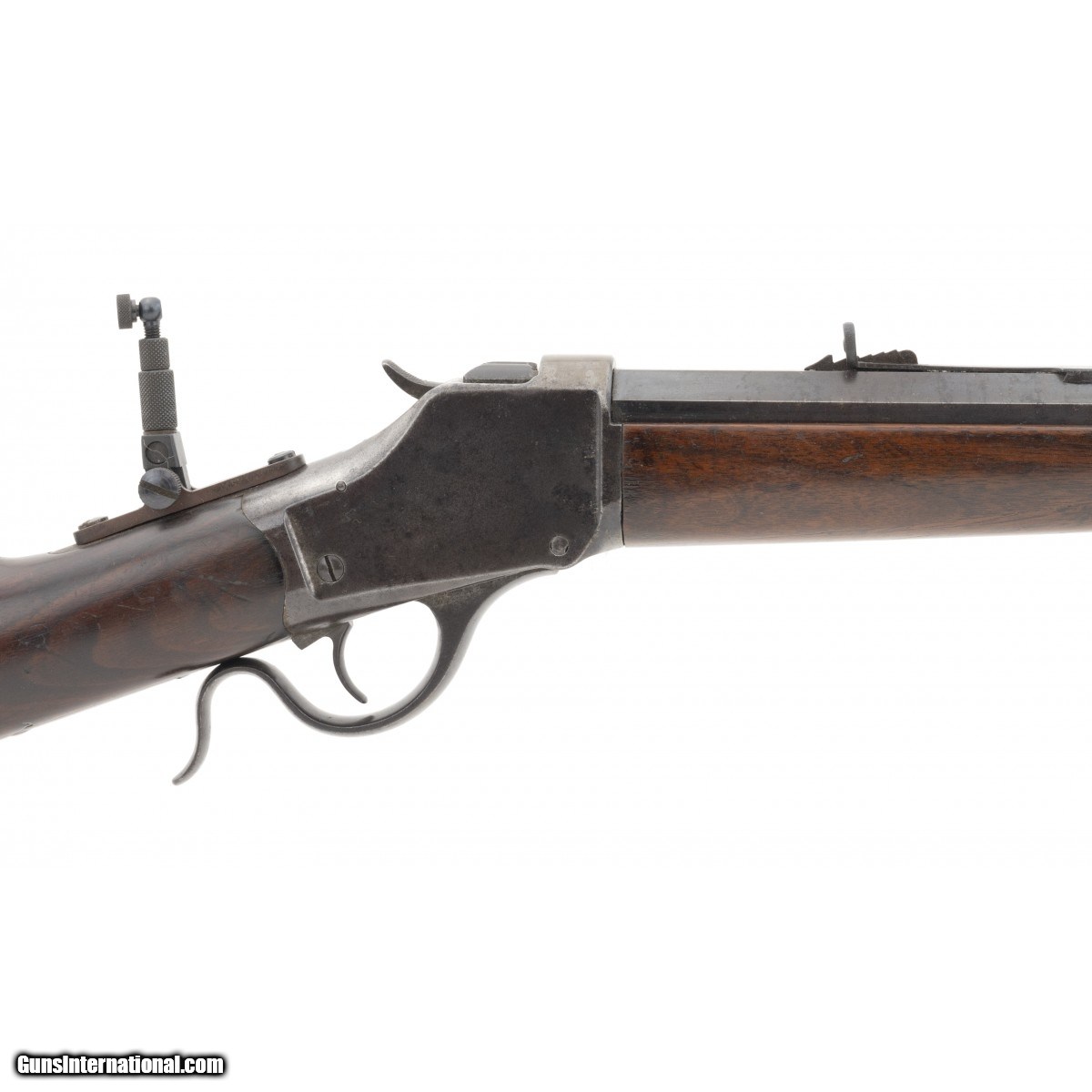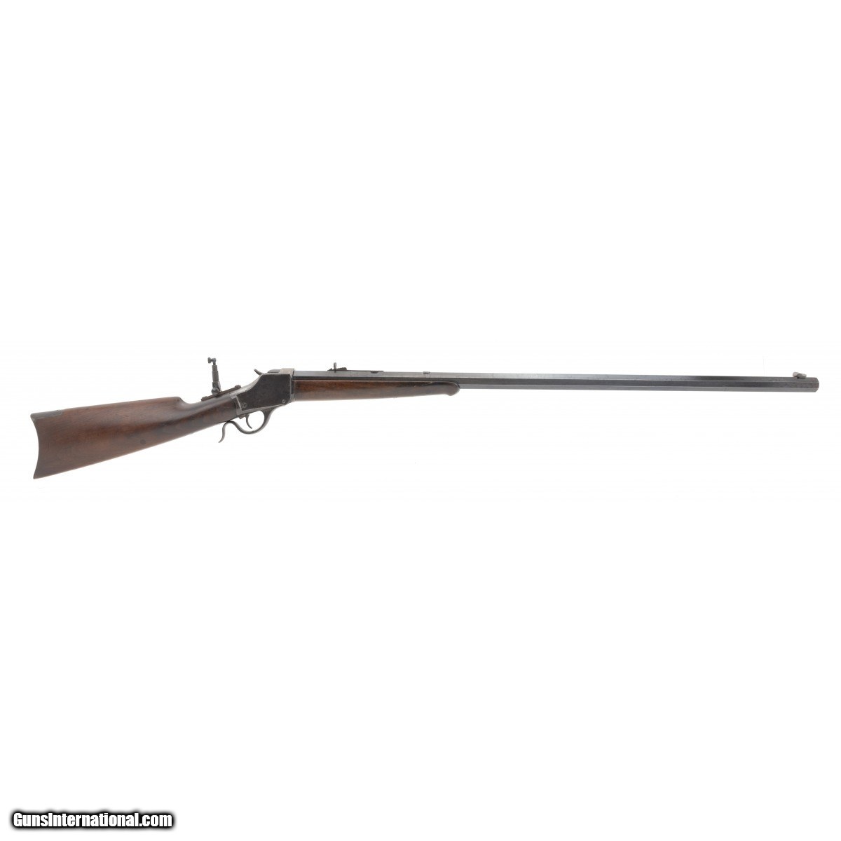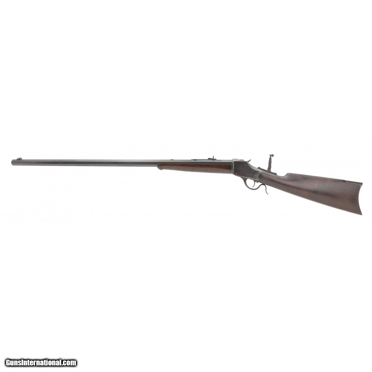 Description: " This .38-55 caliber Winchester High Wall Model 1885 single shot rifle was manufactured in approximately 1890. It has a No. 3 weight 32"" octagon barrel. The bore is excellent with bright perfect rifling. It has an extra filled dovetail in front of the rear sight. The trigger is standard Winchester with safety and full cock. The barrel has approx. 90-95% blue. The Winchester markings are sharp and clear. The rear tang sight is modern but has the adjustable features. The front sight is Rocky Mountain style and is also modern. The forend has had a crack repair which is very well done. The stock toe has an old chip repair. The receiver was probably case colored and has lost its colors. It has a blue-gray patina. This Model 1885 High Wall single shot Winchester rifle is very good overall and is in a desirable caliber. SOLD Antique: Yes |