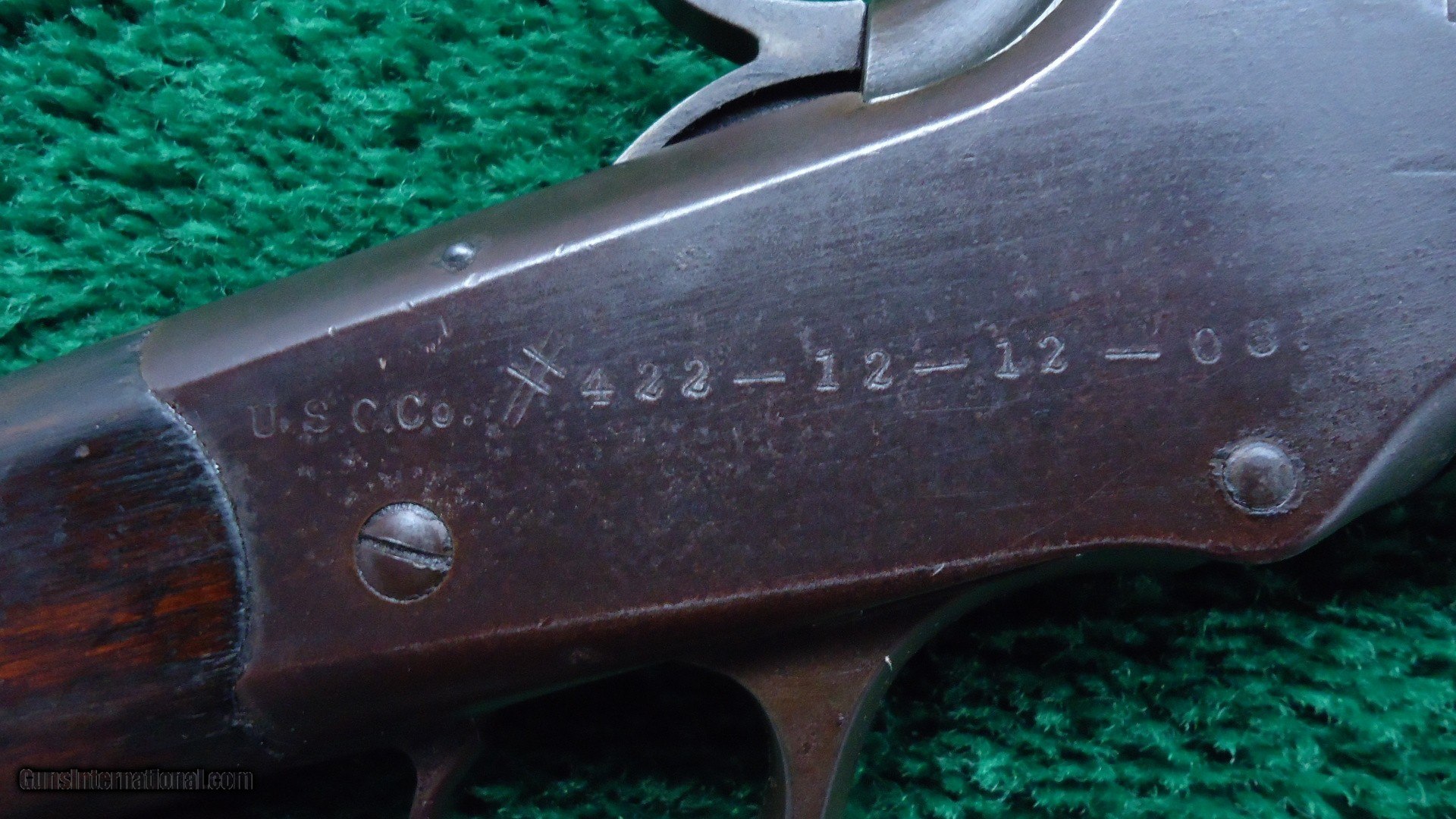Description: Caliber 22. This is one of the US Cartridge test guns and is marked on the side of the receiver “USC CO #422-12-12-08”. Gun retains about 50% blue turning a plum color. Correct front sight. Rear barrell sight is missing. Stock has numerous scars and dings which was typical on all these cartridge test guns. Correct checkered shotgun style buttplate. Number one configuration barrel measures 22 inches. I think it was originally 24 inches and has been re-chambered and set back into the frame which they frequently did since they shot the hell out of these cartridge test guns. A scarce unique gun. Leroy Merz Antique Firearms specializes in antique and vintage Winchesters and other fine American firearms. Since 1965 Mr. Merz has taken part in the world of firearms and has been a contributor to many well known reference books. We have hundreds of additional guns in every price range at our home online. Search for Merz Antiques in google. SOLD Curio/Relic: Yes |