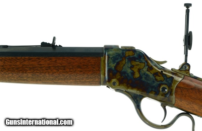 Description: Winchester 1885 .45-90 caliber rifle. High Wall made in 1905. Expertly restored receiver has beautiful case colors. Wood is excellent. Bore is excellent. Rifle has tang peep sight in addition to its rear sight. Barrel has approximately 98% of a restored blue with light speckling. Excellent overall condition. A beautiful High Wall rifle. Also shoots .45-70 ammo.