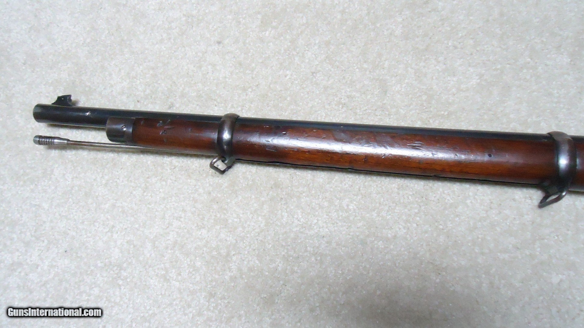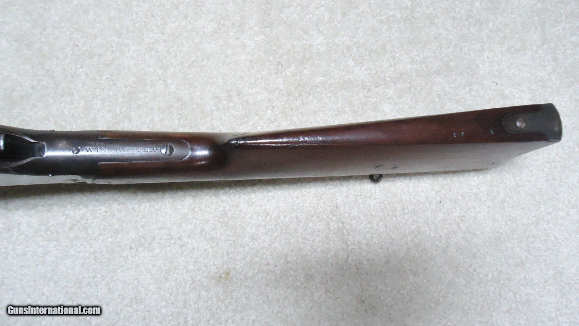 Description: 1885 HIGH WALL .22 LONG RIFLE TWO BAND FIRST MODEL MUSKET WITH FACTORY LETTER, #101XXX, SHIPPED 1911. The first model musket had two barrel bands while the second model had a single band and finger grooves down each side of the forend. The factory letter on this one states that it is a Musket, .22 LR caliber, barrel length "25" inches (obviously a misreading of the records as they were made with 28" barrels), barrel shape: #1, Sights: Special rear sight, received in the warehouse March 18, 1911 and shipped August 30, 1911. This example has British proof marks on the receiver and barrel. The rear sight is a tangent style with ladder and slide. the barrel shows nearly all the deep blue with only very minor wear around the muzzle end. The receiver also shows fine blue with edge wear and some browning on the receiver ring and upper tang. Stock and forend are the nice reddish brown Winchester trademark color and show only light handling marks mainly on the forend. Wood shows tight wood to metal fit. Sling swivels on each barrel band and on the butt stock. There is some light case color on the upper portion of the lever. The lever spring is a little weak when the hammer is down, but snaps into place when the lever is lifted and the hammer is cocked. As seems typical on most of these, the bore is dark and very heavily frosted. It might clean/brush out better, but probably not by too much. The left side of the barrel is marked "22 LONG R." a very interesting and attractive Pre-W.W.I training rifle that went to England in 1911. Lots of finish. Winchester letter included. SOLD Curio/Relic: Yes Rifle Caliber: .22 Long Rifle Manufacturer: Winchester Model: 1885 HIGHWALL MUSKET Serial Number: 101XXX Barrel Length: 28 Condition: FINE+ Bore Condition: FAIR |