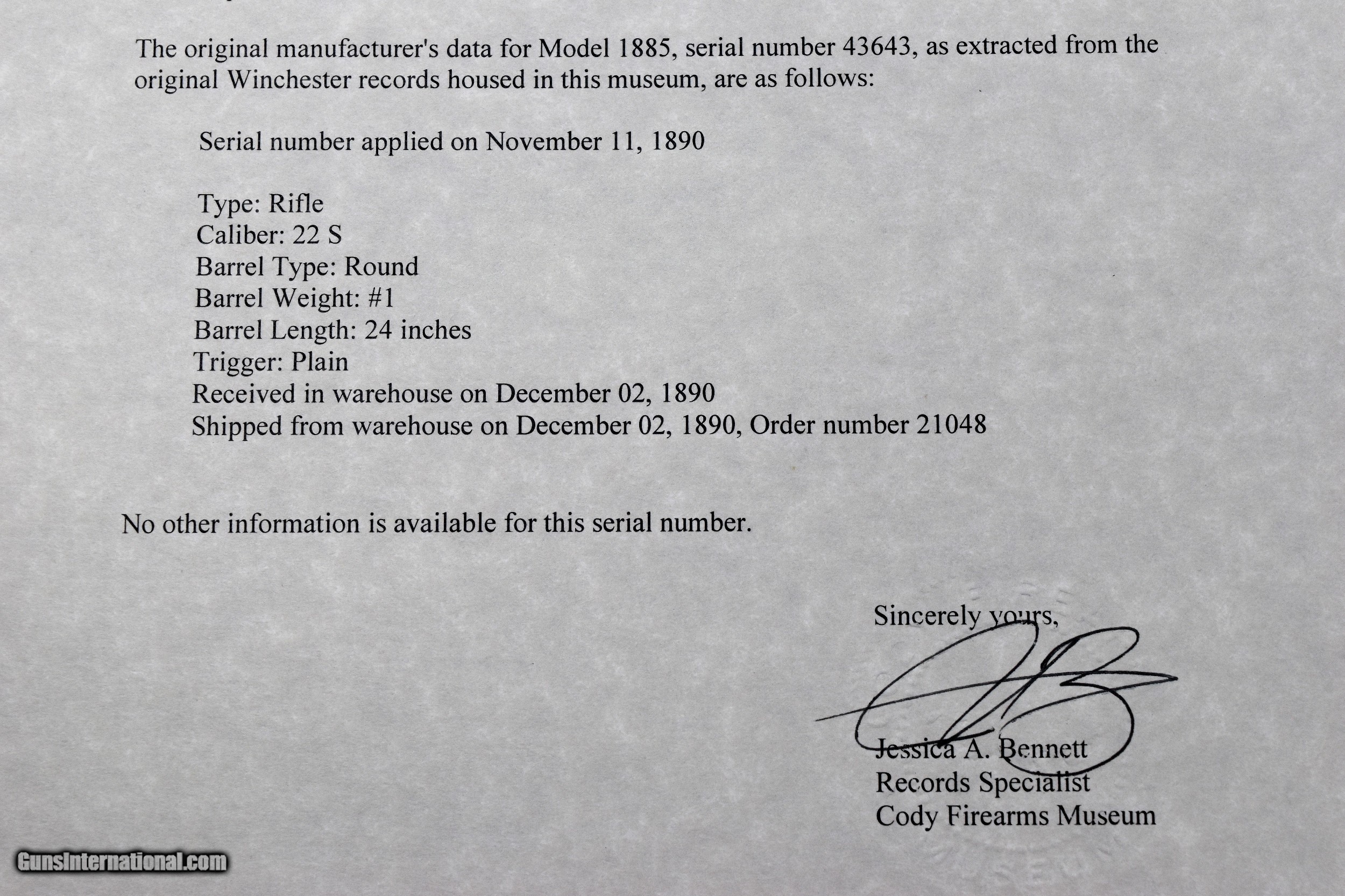 Antique Winchester Model 1885 Low Wall .22 Short 24" Rifle with Cody Letter