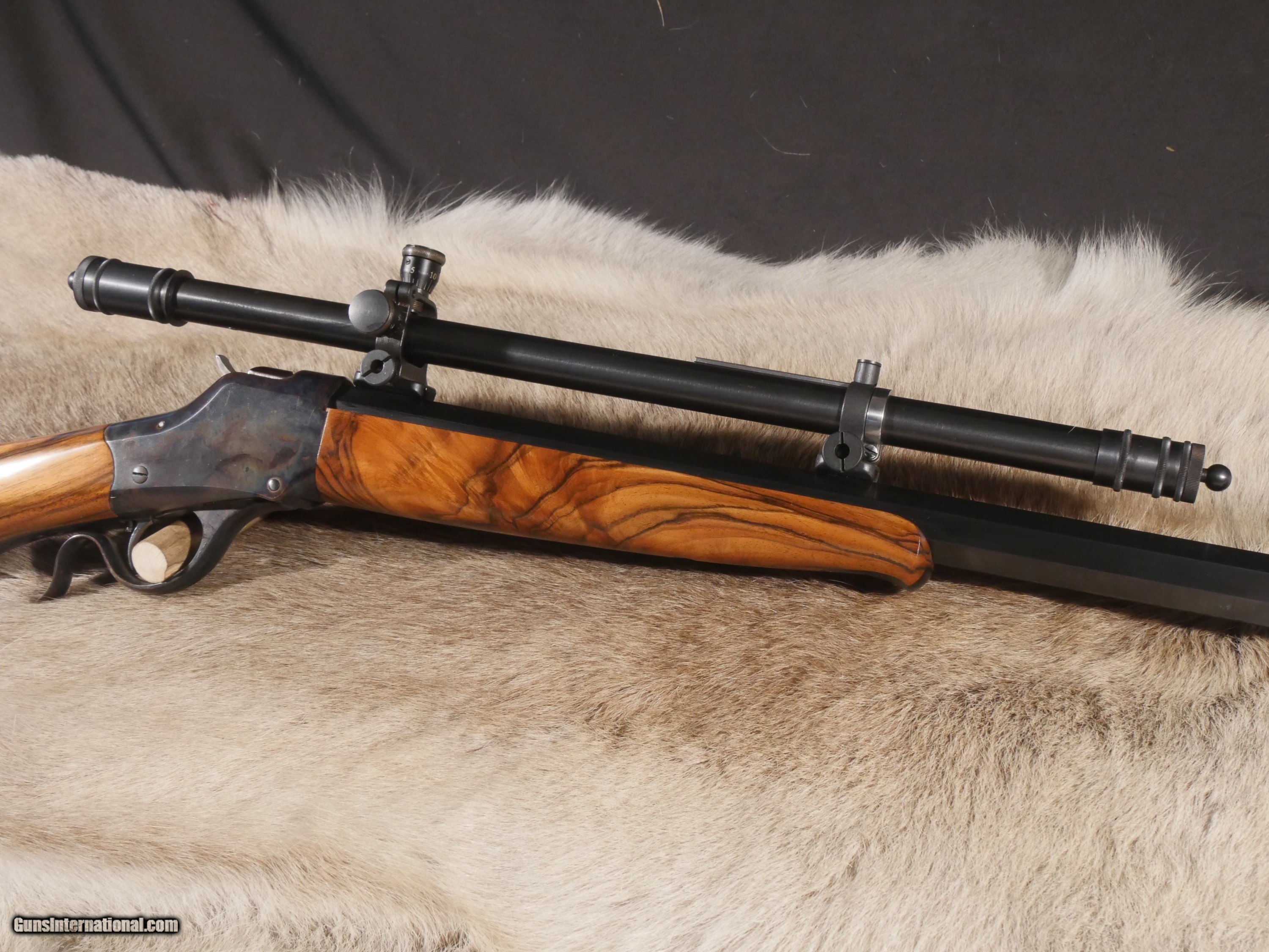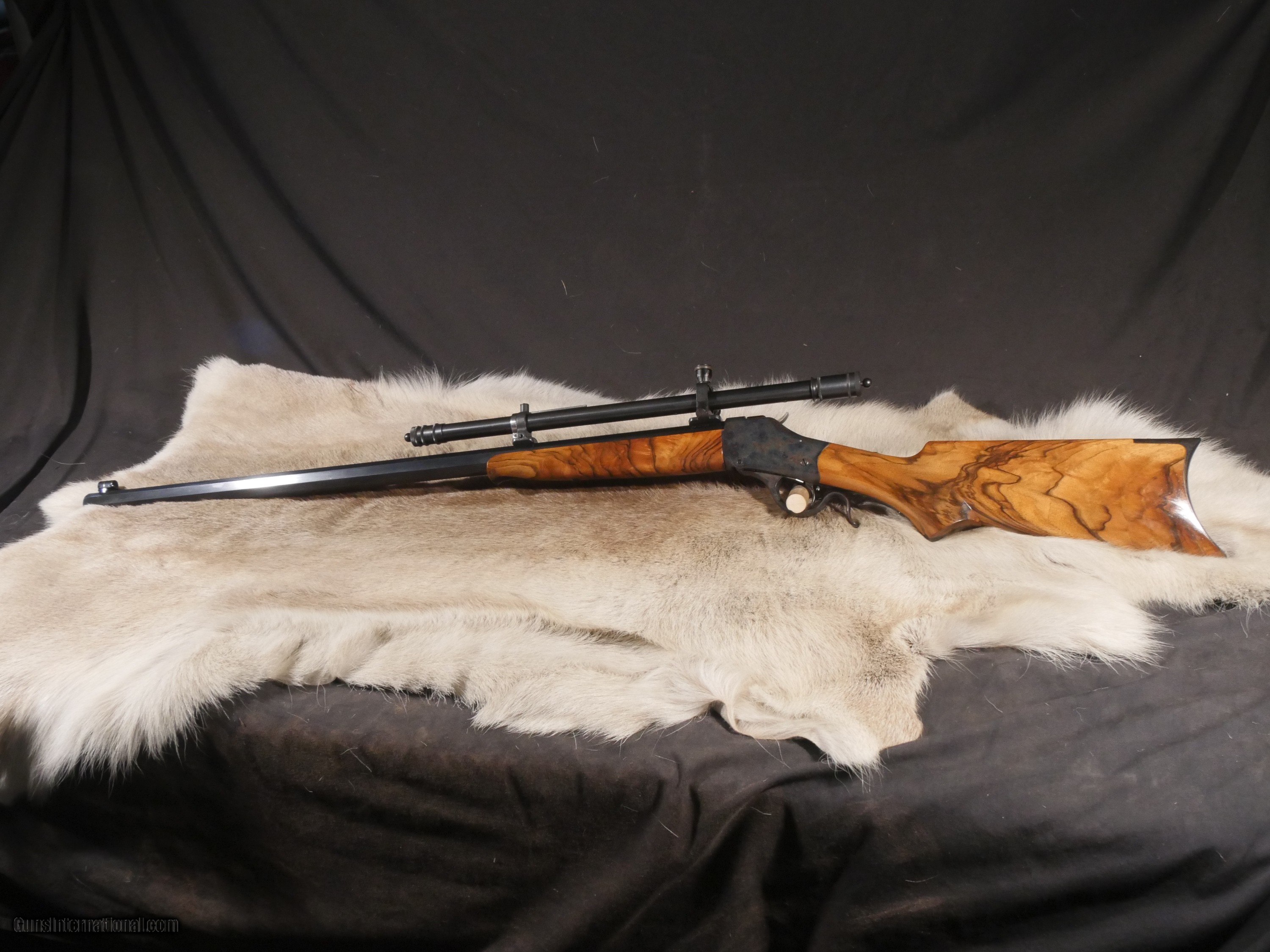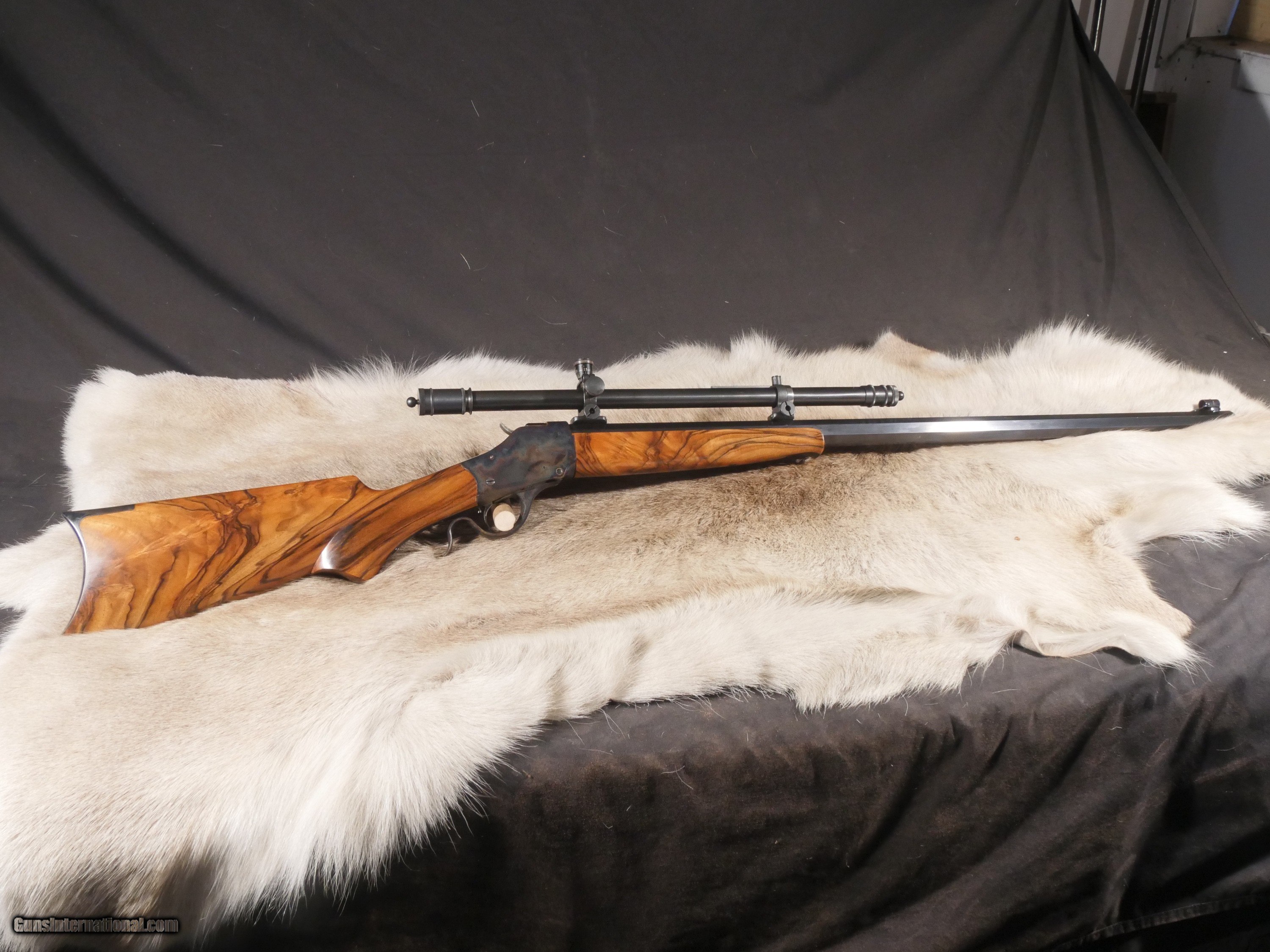 Description: Winchester High Wall 45-120!! High Wall Beautiful!!! Super fancy English walnut stock and forearm, ebony forearm inlay, heavy octagon #3 green river barrel, beautiful case hardening on butt and receiver, adjustable trigger, W M Malcom 6x scope, Adjustable scope mounts, globe front sight, very nice profesionally custom built!! SOLD Rifle Caliber: .45-120 Sharps Manufacturer: Winchester Model: 1885 |