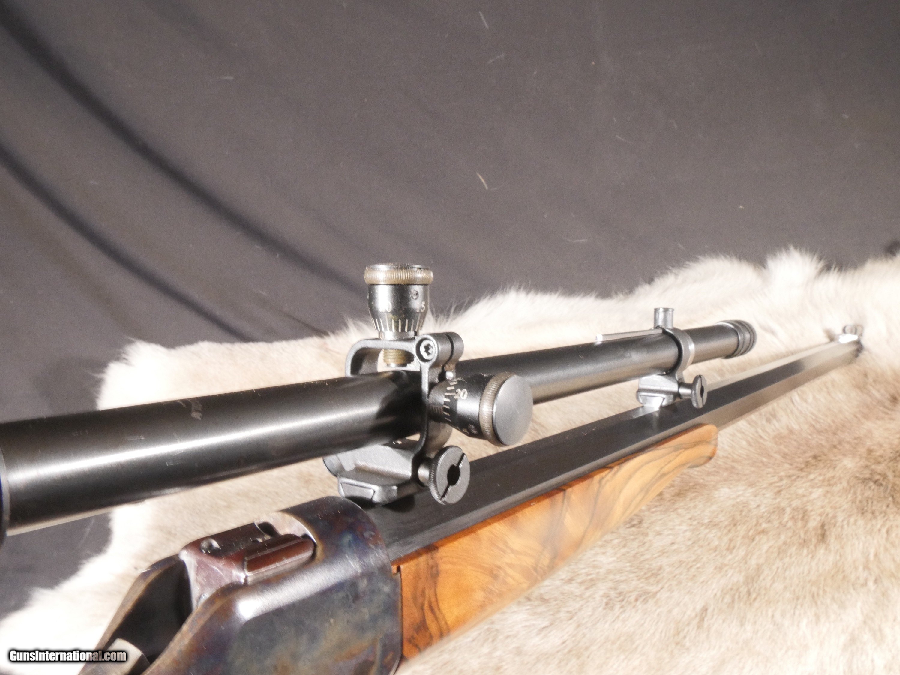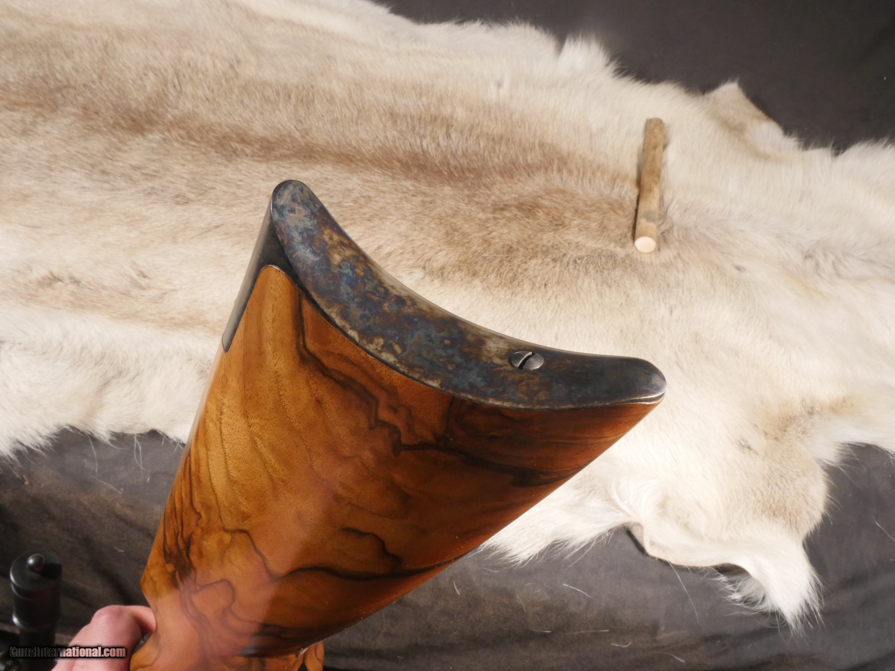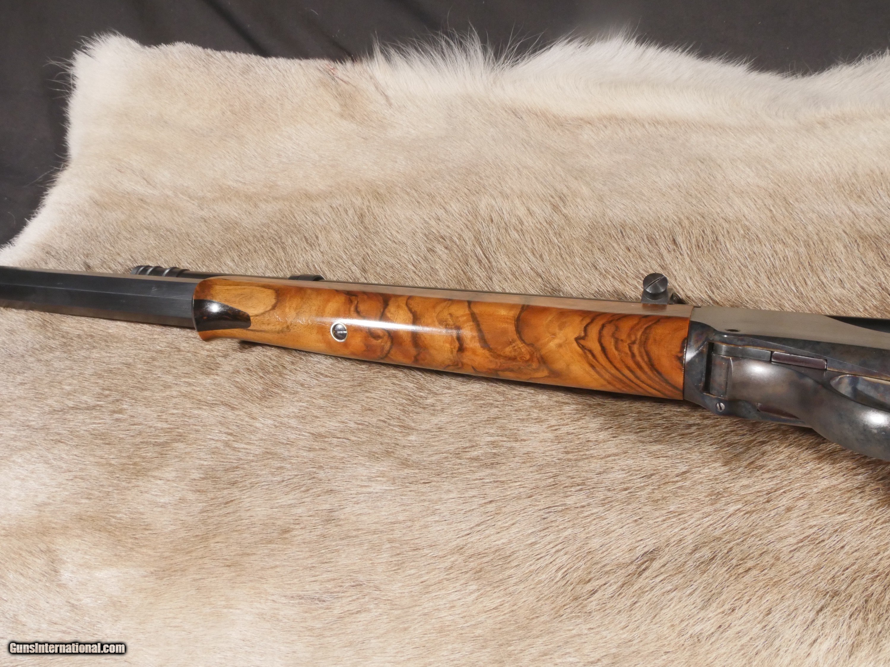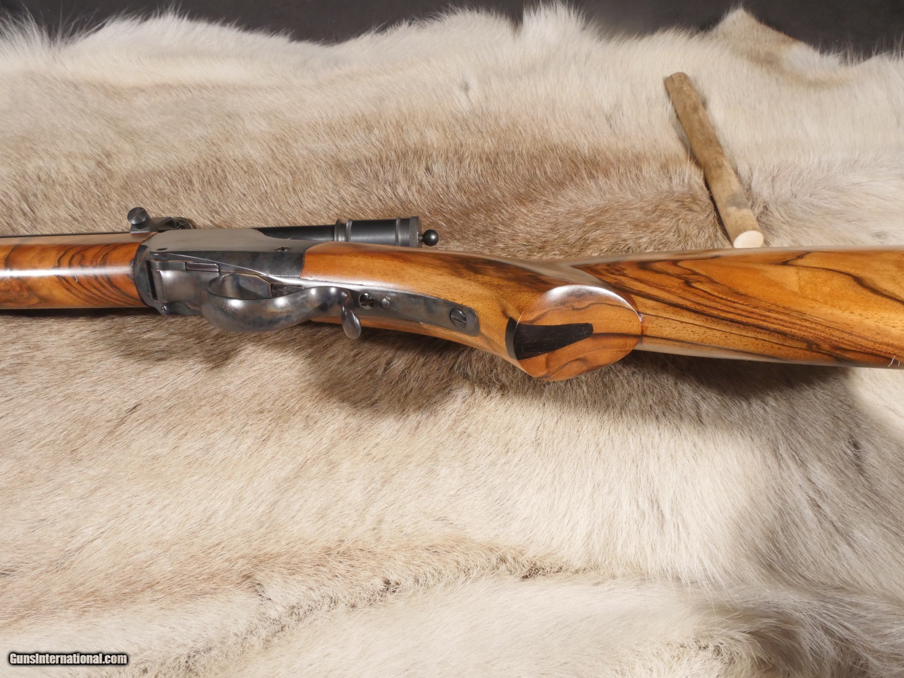 Description: Winchester High Wall 45-120!! High Wall Beautiful!!! Super fancy English walnut stock and forearm, ebony forearm inlay, heavy octagon #3 green river barrel, beautiful case hardening on butt and receiver, adjustable trigger, W M Malcom 6x scope, Adjustable scope mounts, globe front sight, very nice profesionally custom built!! SOLD Rifle Caliber: .45-120 Sharps Manufacturer: Winchester Model: 1885 |