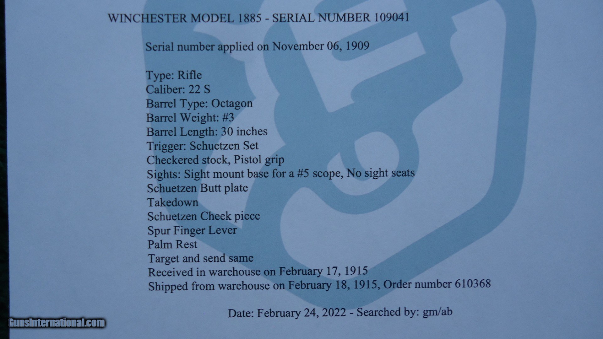 DLX WINCHESTER MODEL 1885 LAUDENSACK H.W. T.D. FRAME CAL 22 SHORT