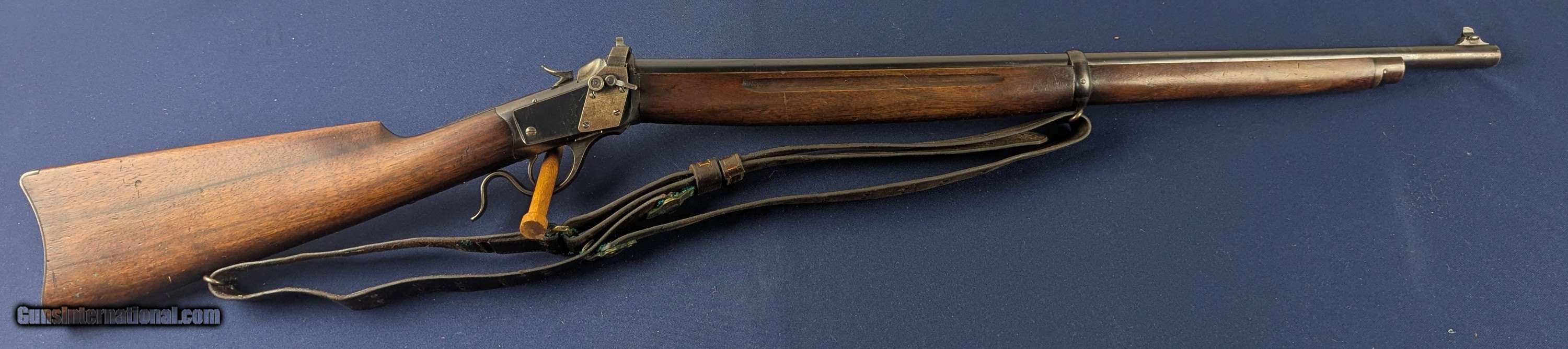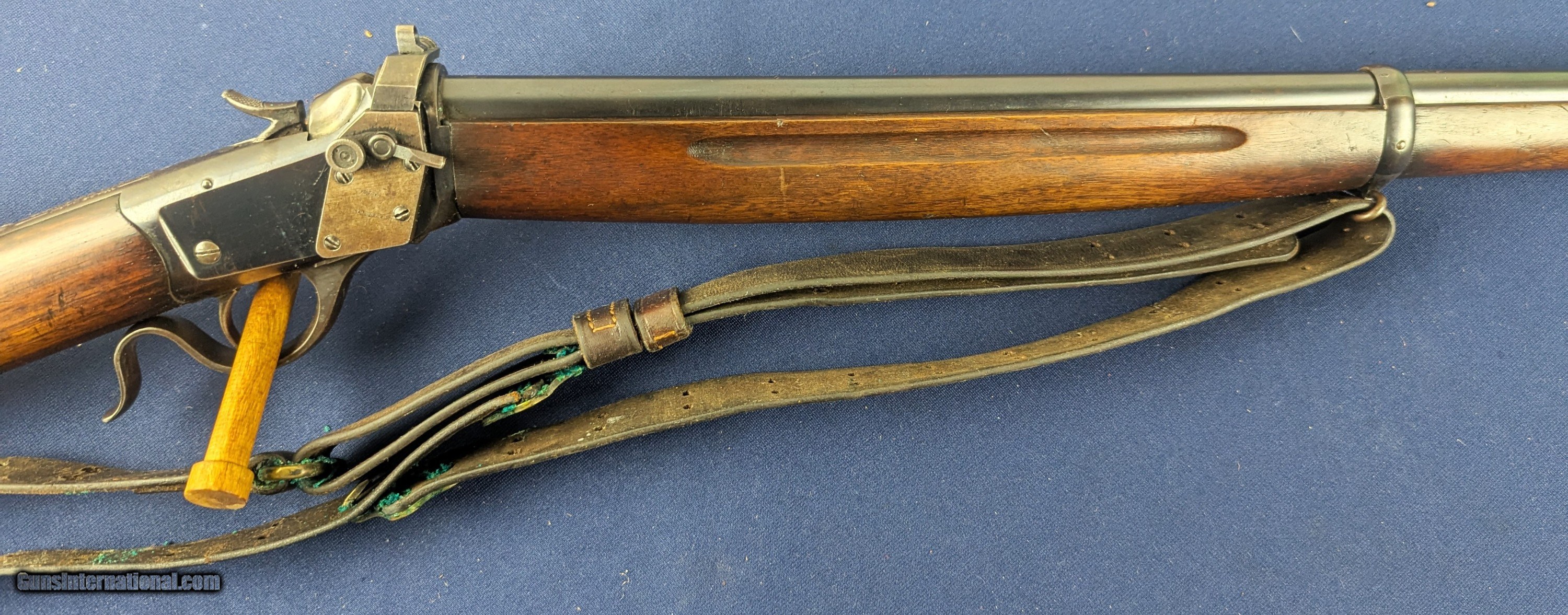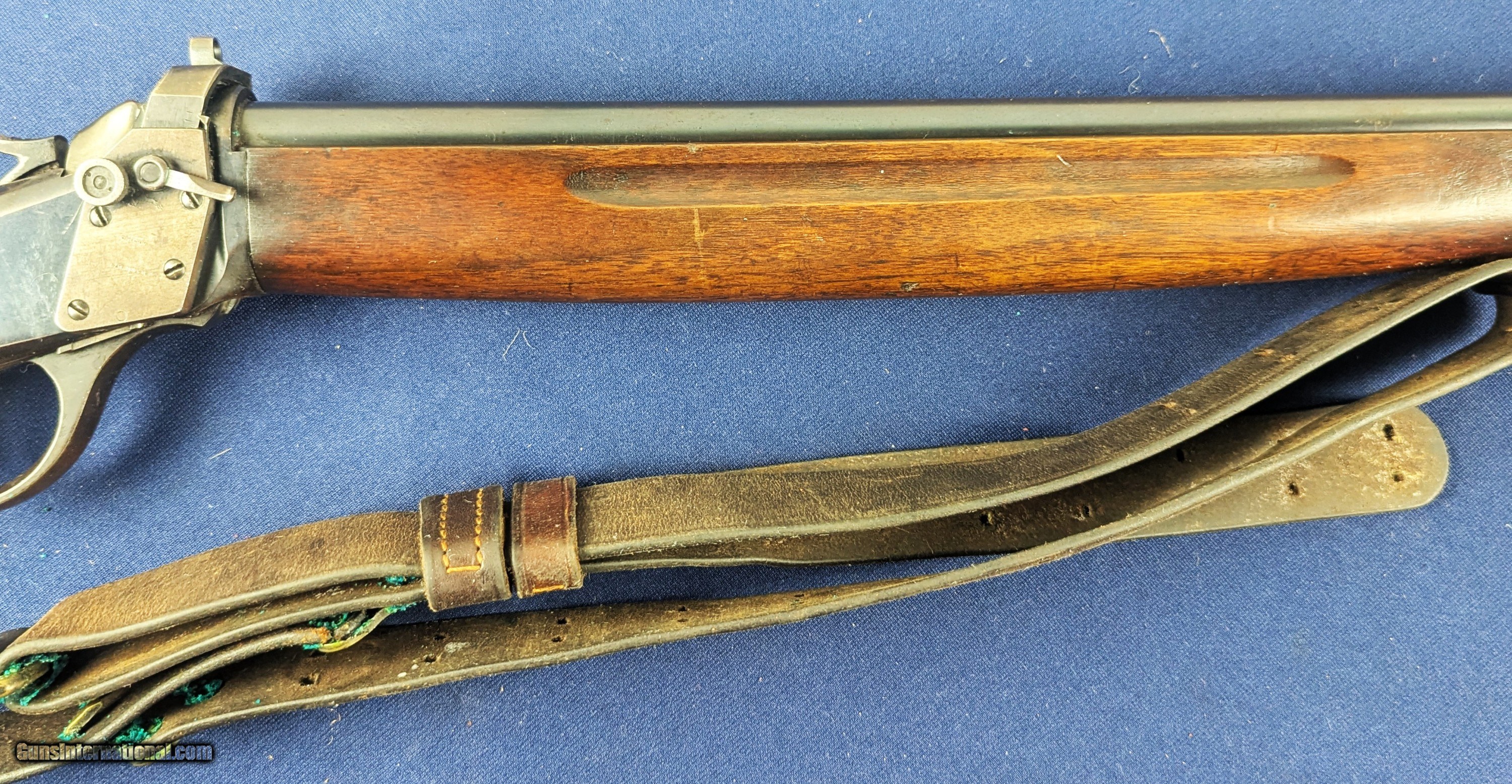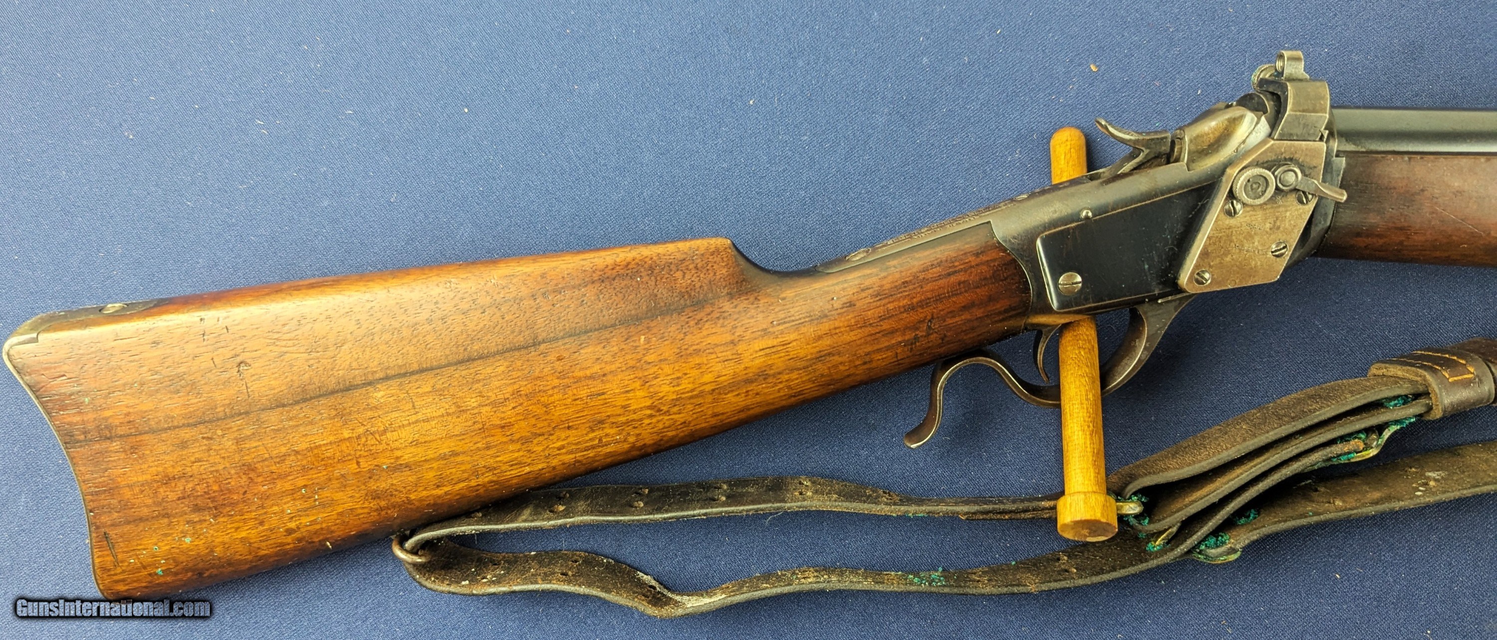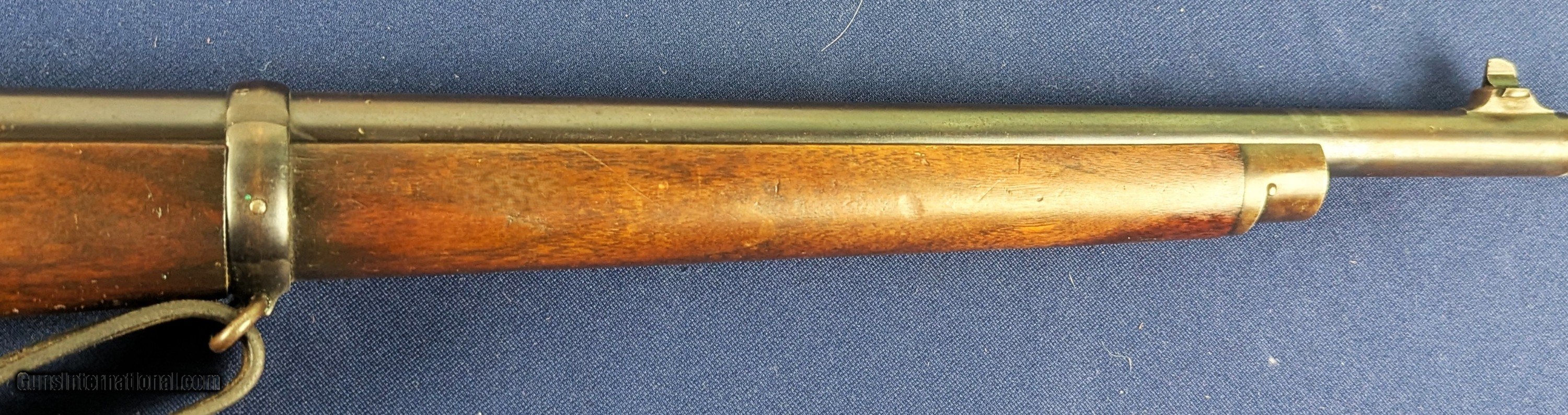 Description: Exc. Winchester Winder 1885 U.S. Issue .22 Short Training Rifle Offered here and just acquired by us from a very prestigious 60 year arms collection is this excellent U.S. Winchester Model 1885 Low Wall Winder Musket chambered in an uncommon .22 Short caliber. The rifle features a 28-inch round barrel with tall blade front sight and Lyman precision receiver sight. The Winchester Repeating Arms Co. Model 1885 is a single-shot falling-block action, which was offered in two distinct variations, the Low Wall and the High Wall, and was designed by John Browning and produced from 1885-1918. In 1883, Thomas G. Bennet, the Vice-President and General Manager of the Winchester Repeating Arms Company, traveled to Ogden, Utah to meet with the Browning Brother’s about the negotiation and purchase of the single-shot design, as well as a prototype of what would become the Model 1886 lever action. This meeting began what was to be a very fruitful 20-year Winchester and Browning collaboration. The rifle was produced to satisfy the demands created for the growing sport of long-range “Match Shooting” and was dominated by the single-shot giants, such as Sharps, Remington, Stevens, Maynard, Ballard. They entered as competitors and excelled, with Major Ned H. Roberts (inventor of the .257 Roberts cartridge) describing the Model 1885 as “the most reliable, strongest, and altogether best single shot rifle ever produced”. The action was considered so strong and trustworthy that Winchester used the Model 1885 as the test rifle for all new large calibers. Later, the U.S. Army would order a special contract of the “Winder Musket”, a marksmanship training rifle. The breechloading Winder Musket was given its namesake from its brainchild of Colonel C. B. Winder, an advocate for marksmanship training. The top of the receiver is marked “U.S.” over a flaming bomb. The rifle features the band fastened grooved full length walnut forearm and straight grip, sportier style walnut stock with original crescent steel butt plate. The rifle receiver shows traces of original finish case fading to a gray coloration, with the barrel having virtually all of its original bright blue finish with slight fading in one spot closer to muzzle. The wood shows patina from wear and use with some dents. Buttplate a grey patina. Original sling comes with rifle with vertigris on brass parts which we have not cleaned. Serial Number: 131618. This firearm qualifies as a Curio & Relic eligible item. L566 Thanks for your bid. Shipping for this item is $48 however final shipping amount is based upon geographical area. Handling is $18.00 for longarms only. We gladly accept money orders, bank checks and personal checks. Credit card orders (VISA AND MASTER CARD ONLY) charged 3.95% additional for use. PLEASE CALL DALIA AT 203-257-5256 TO GIVE CREDIT CARD INFORMATION. Also, please vview our at hansenguns. Click on "Online Catalog" and see All OF OUR ITEMS LISTED CONSECUTIVELY on or search online on that site with the ID “lope”...... OFFERED ONLINE AND AVAILABLE IN OUR RETAIL GALLERY IN SOUTHPORT, CT. Visit us also on Facebook at ://facebook/hansenguns/?fref=ts. We also own and/or operate Hansen Cartridge Co. and the Ruger Collectors Assc.(RCA). Hansen & Hansen wishes to expedite each order received, however we ship 80-100 items weekly, therefore orders paid by money orders or bank checks are cleared for shipping 5-7 days after deposited funds show in our account. Shipping date is scheduled ONLY AFTER VERIFICATION TAKES PLACE AND FFL/C&R IS RECEIVED (IF APPLIES). This is 5-7 days after WE receive order by mail - NOT customer date mailed and postmarked and after credit card funds are posted. Credit card orders exceeding $500 must be cleared through customer’s bank before shipping. Personal checks are accepted but orders are held UP TO 3 WEEKS after deposit of funds before items released for shipping. IF you have special instructions or require overnight or expedited shipping please advise at time of ordering and we will gladly prioritize shipping FOR AN ADDITIONAL CHARGE. THIS IS OUR POLICY and we encourage you to PLEASE READ AND UNDERSTAND OUR POLICY BEFORE . We would be pleased to answer ANY questions by phone (our toll free number is 1-800-571-7337 or e-mail cwlopiaol. Curio/Relic: Yes Price: $1,950.00 Buy Now Contact Seller |