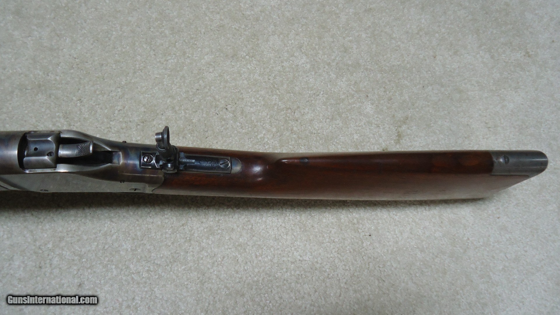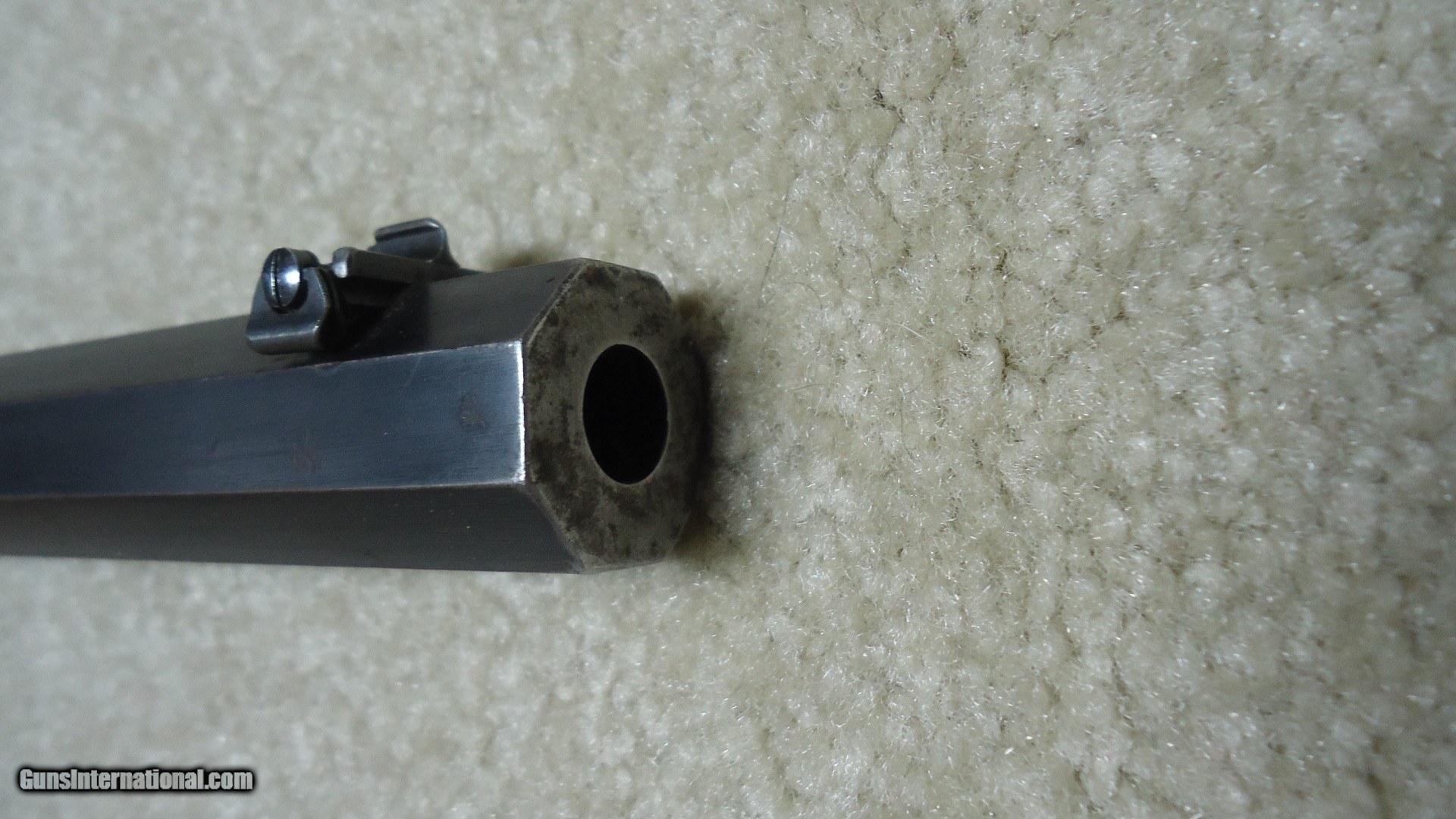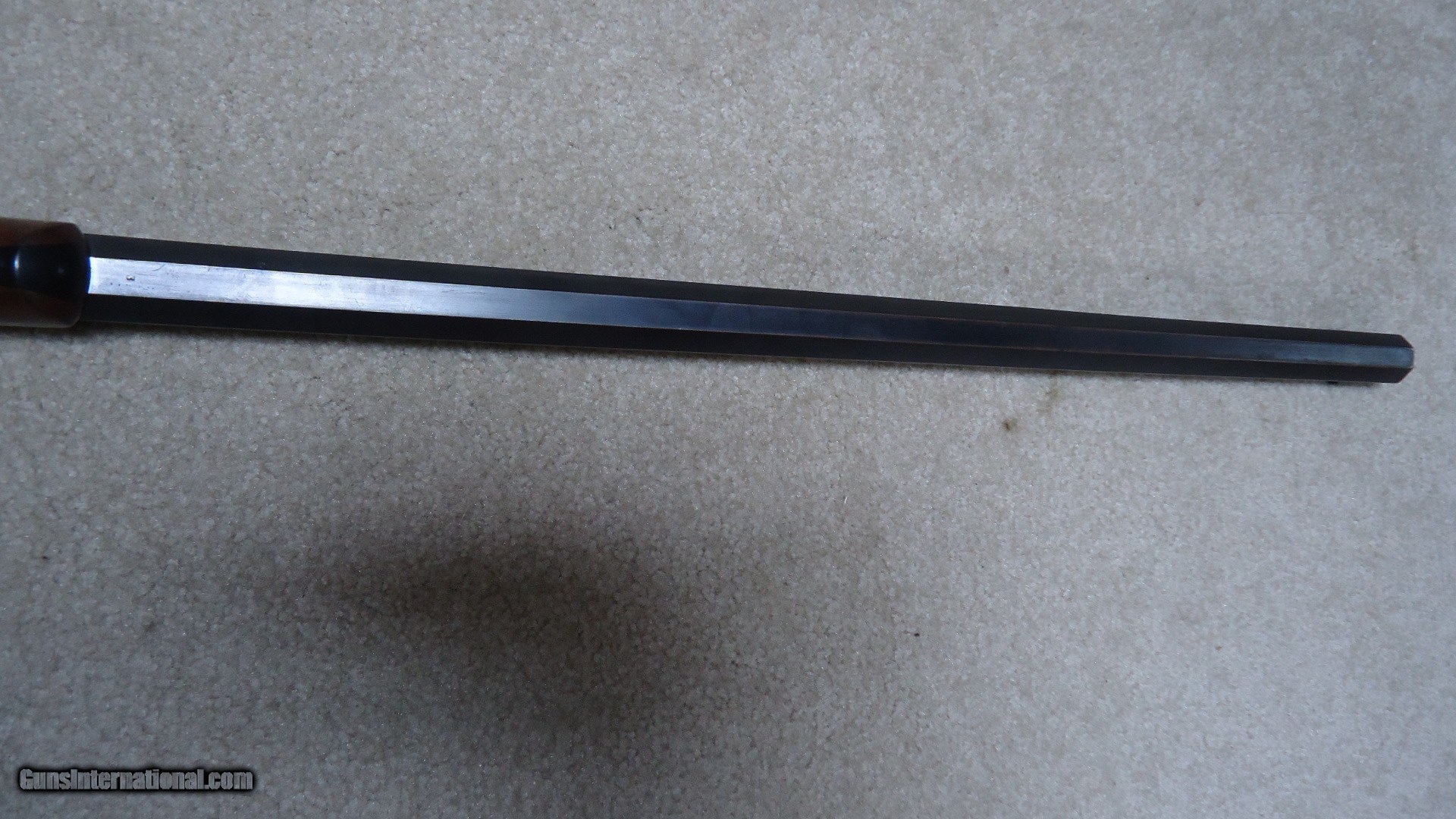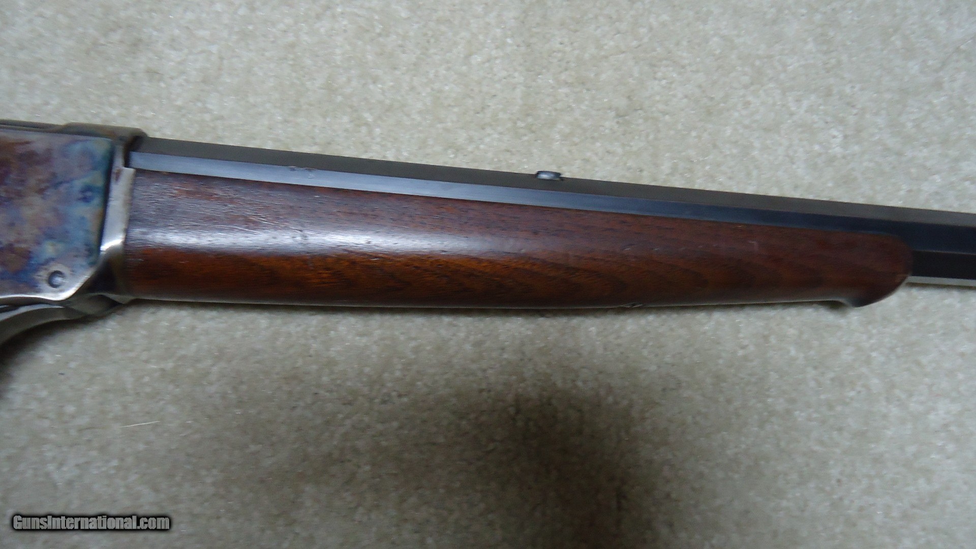 Description: GORGEOUS, SPECIAL ORDER WINCHESTER 1885 HIGHWALL SINGLE SHOT IN SCARCE .40-82 CALIBER WITH EXTRA LONG 32" OCTAGON BARREL, SET TRIGGER, VIVID CASE COLORS AND FACTORY LETTER, #39XXX, MADE 1890. Standard length for this caliber was 30" and standard was also "plain trigger." The factory letter verifies caliber, barrel, trigger etc. Additionally, this rifle comes with a hand written letter stating "This rifle ," (serial number listed) , "was owned by Gene Shiels- Mannetonas-Mannitoba, Canada, used as a target and hunting rifle. First elk 20 Oct. 1912. (under forend)" also "M. L. Dedrick- Winnipeg Mannitoba 30 Mar. 80 (under butt plate)" This is all neatly written under the forend and butt plate. This rifle shows excellent deep barrel blue with crisp markings. The rear barrel sight dovetail has a blank filler in it and the front sight is a short blade that is windage adjustable. It is fitted with a Lyman tang sight. The receiver sides and receiver ring show vivid case colors. The upper sides and bottom of the lever also show fine case color as does the upper tang around the hammer and tang sight. The set trigger functions properly and retains the adjustment screw. Butt stock and forend are excellent. The bore is sharp, bright and excellent! Only 1,703 1885 Single Shot rifles were made in .40-82 (Compared to 11,174 for .32-40, and 7,596 for .38-55, and 3,032 for .45-70). This rifle has it all: Scarce caliber, extra length barrel, set trigger, superb condition, family history and all verified by a factory letter! (note: the dark spots on the receiver sides are remnants of the protective lacquer applied by the factory!) SOLD Antique: Yes Manufacturer: Winchester Model: 1885 HIGHWALL Serial Number: 39XXX Barrel Length: 32 Condition: EXCELLENT Bore Condition: EXCELLENT |