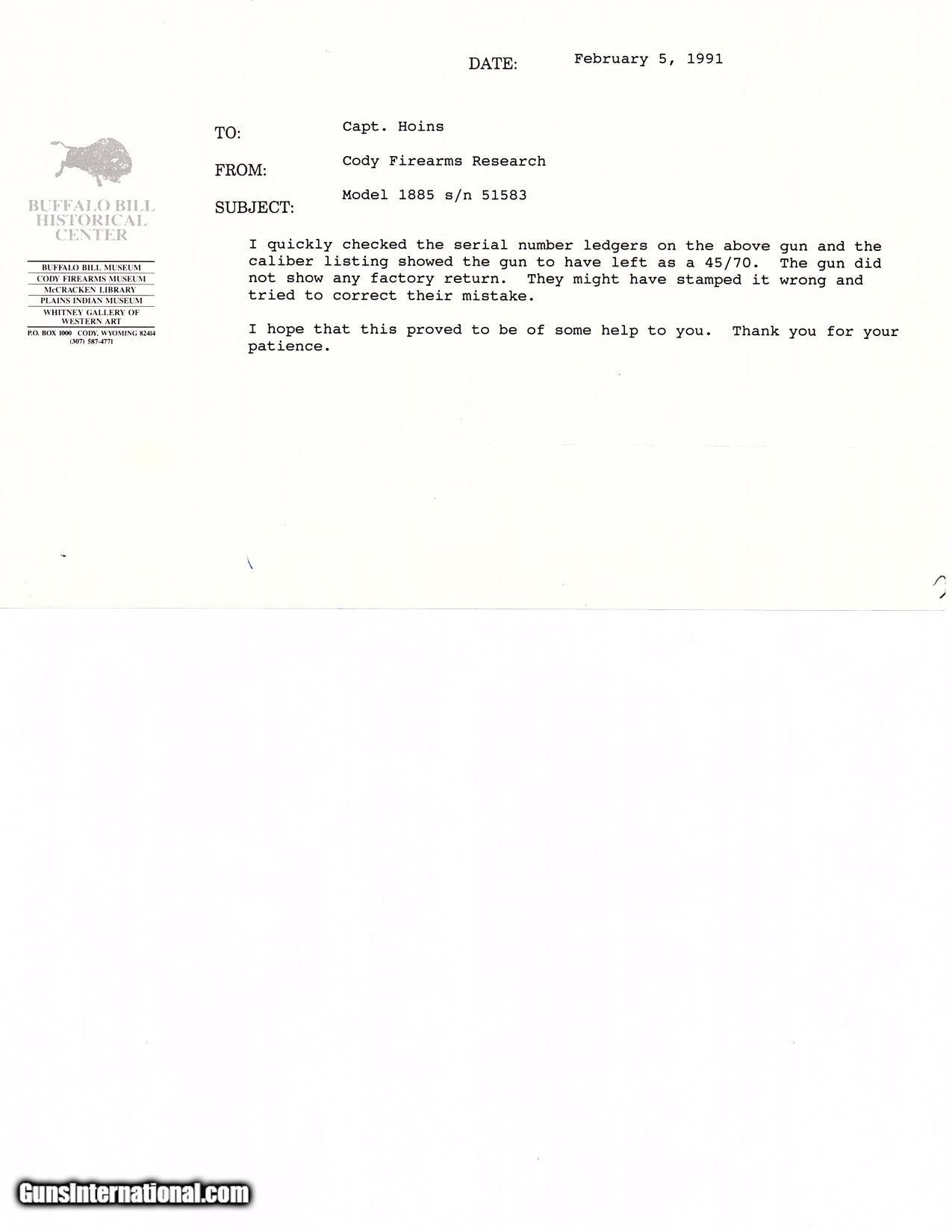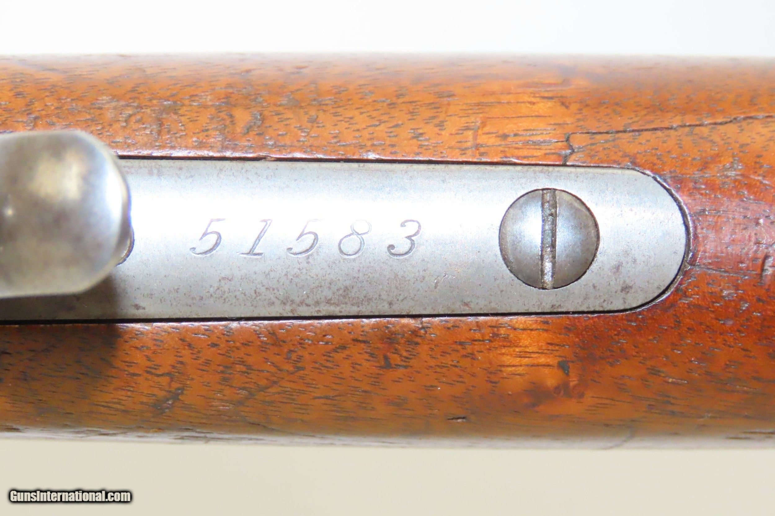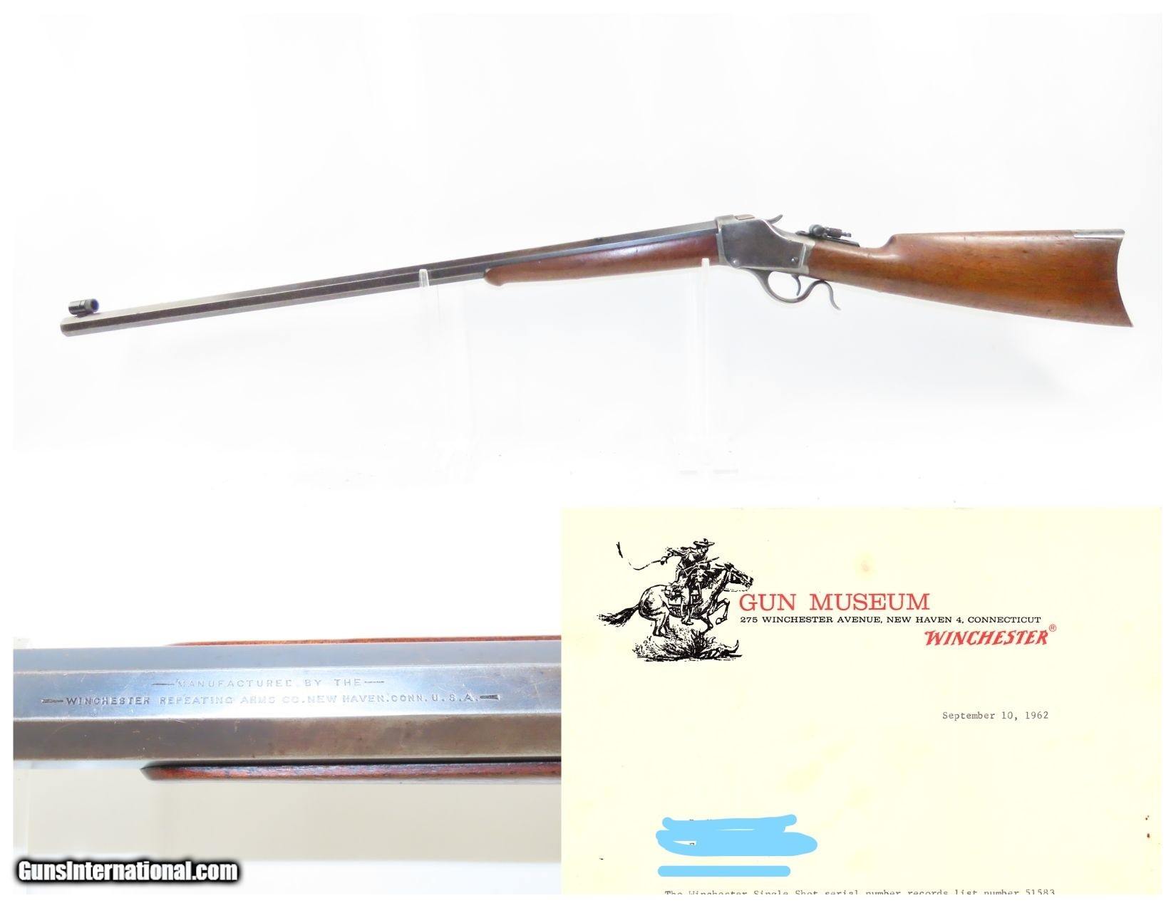 Description: LETTERED Antique WINCHESTER Model 1885 HIGH WALL Rifle in .45-90 WCF Cal. Made in 1891 with 3 Weight Octagonal Barrel Here we present an antique Lettered Winchester Model 1885 High Wall Rifle chambered in .45-90, made in 1891 in New Haven, Connecticut. The Winchester Model 1885 has a falling-block action, and two models were produced, the Low Wall and the High Wall. Ironically, this was Winchester’s first single shot rifle, the company having been founded on its winning lever action repeater design. John Moses Browning, the famed gun designer who forever changed the firearms landscape, began his career with this rifle in the 19th Century before dominating the world scene in the 20th Century. It was produced principally to satisfy the demands of the growing sport of long-range "Match Shooting", which opened at Creedmoor, New York, on June 21, 1872. Target/Match shooting was extremely popular in the United States from about 1871 until about 1917, enjoying a status similar to golf today, and the Winchester company, which had built its reputation on repeating firearms, had in 1885 challenged the single-shot giants of Sharps, Remington, Stevens, Maynard, and Ballard, not only entering the competition, but excelling at it, with Major Ned H. Roberts (inventor of the .257 Roberts cartridge) describing the Model 1885 Single Shot as "the most reliable, strongest, and altogether best single shot rifle ever produced." This specimen is chambered for the high powered .45-90 cartridge. It features a 30-inch #3 weight octagonal barrel. The letter states that factory records had this being shipped in .45-70. The barrel has been remarked after the chamber was lengthened for the .45-90 conversion. The overall condition is fine. Original finish. The action is excellent. The bore is bright with strong rifling. The walnut stock shows some use and remains solid. The rifle comes with its original front sight but currently installed is a globe type sight. The rear barrel dovetail has been filled in favor of a tang-mounted peep. This is a very neat and scarce Winchester! Own the original! This is a legitimate antique and not a reproduction. Barrel is 30 inches. Caliber: .45-90 Winchester Center Fire Overall condition as seen in photos. Very Fast. Very Safe. FREE SHIPPING WORLDWIDE. Delivered directly to your door by express mail! Guaranteed AUTHENTIC & Includes CERTIFICATE OF AUTHENTICITY. ancestryguns $4485 #226844 SOLD Antique: Yes |